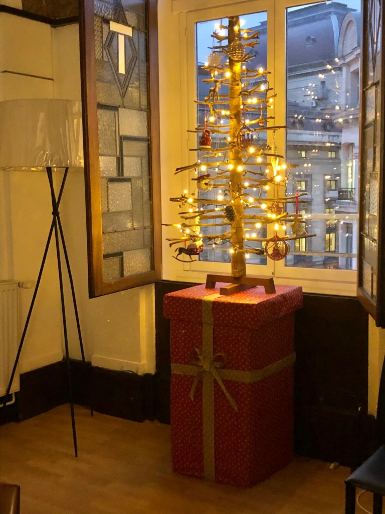 We spent time constructing a box with a lid, to cover the air conditioner. After wrapping it like a giant present, we then had a stand for the tree which could be rolled up to the window each day after opening the stain glass shutters.