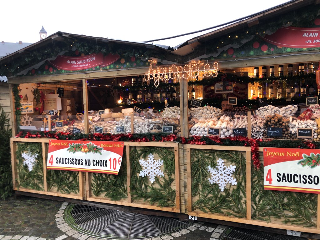 The last Christmas market we took in was the biggest in Paris. Although it reportedly had about 200 stalls, it was a bit disappointing. With the strike traffic, it took us over an hour to get there. It was laid out on a large outdoor plaza but was missing the overall theme or feel of a Christmas village due to a lack of decorations. It differed greatly from the charm of the Strasbourg, Colmar and German towns along the Reine. Many of the Paris market stalls carried the same goods and most were commercial manufacturing. They did have an abundance of restaurant stalls and our lunch at one was quite tasty. We were able to pick up a much better bough for our balcony and at one of the artisan distillers we also bought a lovely pear cognac bottled with an intricate glass blown ship inside.