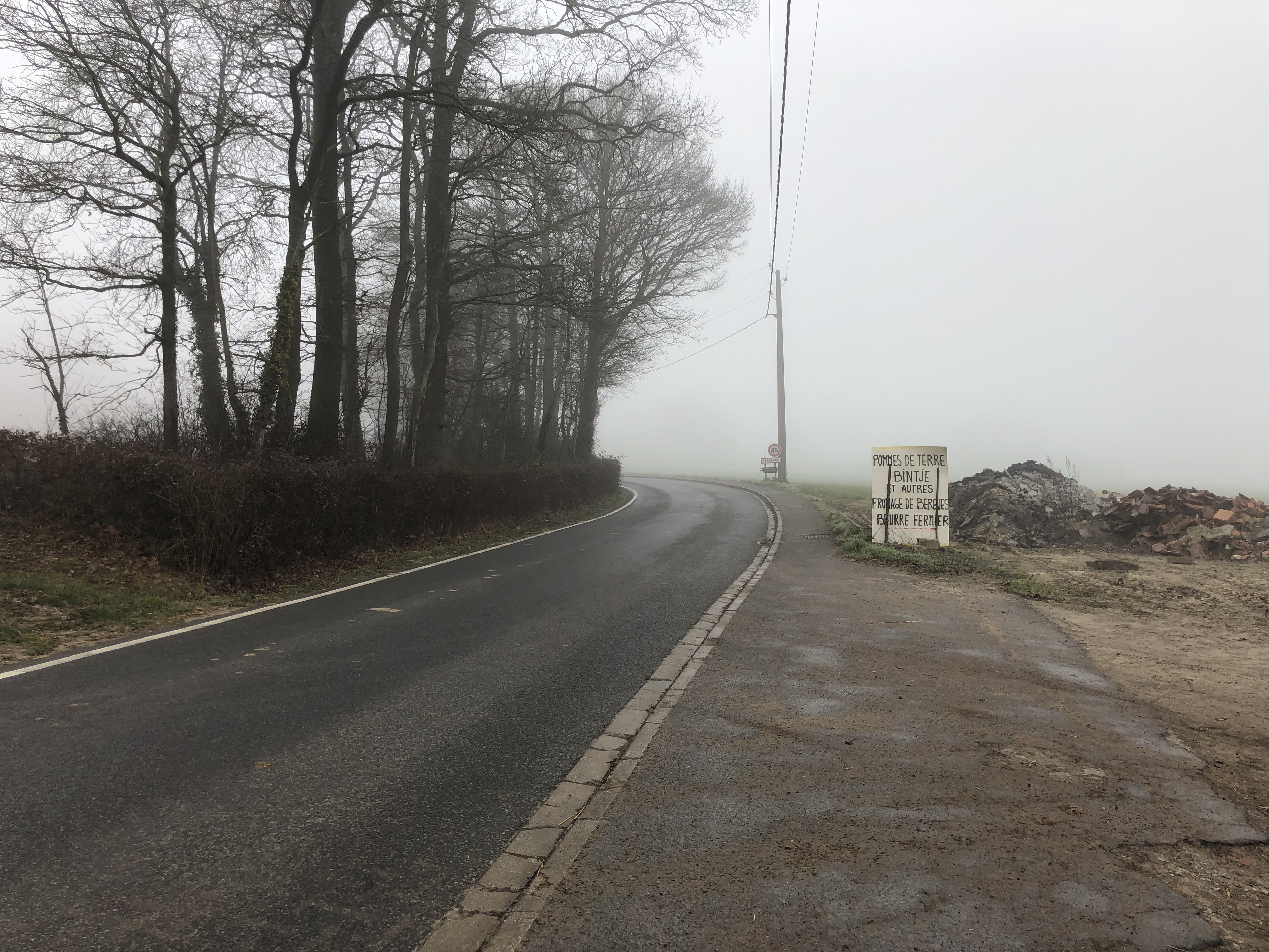 As we walked to town, passing no one else, we could hear (and smell) that we were passing cows and an occasional rooster. Once in the town center, we still could not see the buildings across the street. Having been thoroughly drained of any warmth, we sought refuge in a corner cafĂ© named CafĂ© Aux Trois Moulins. Run by the same family for several decades, the wife cooks, the husband runs the front and the son serves the tables. We were treated to a wonderful pork chop dish with onions and fries. During the summer, they’re known to serve salad from their own gardens but given the time of year and our popsicle state, we passed on the salad option.