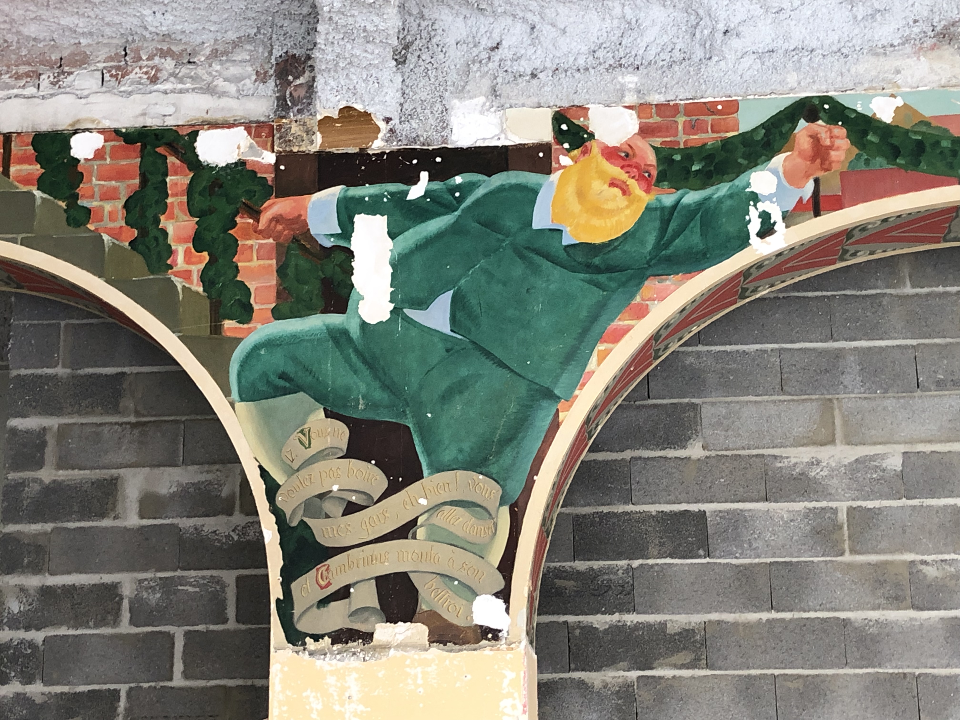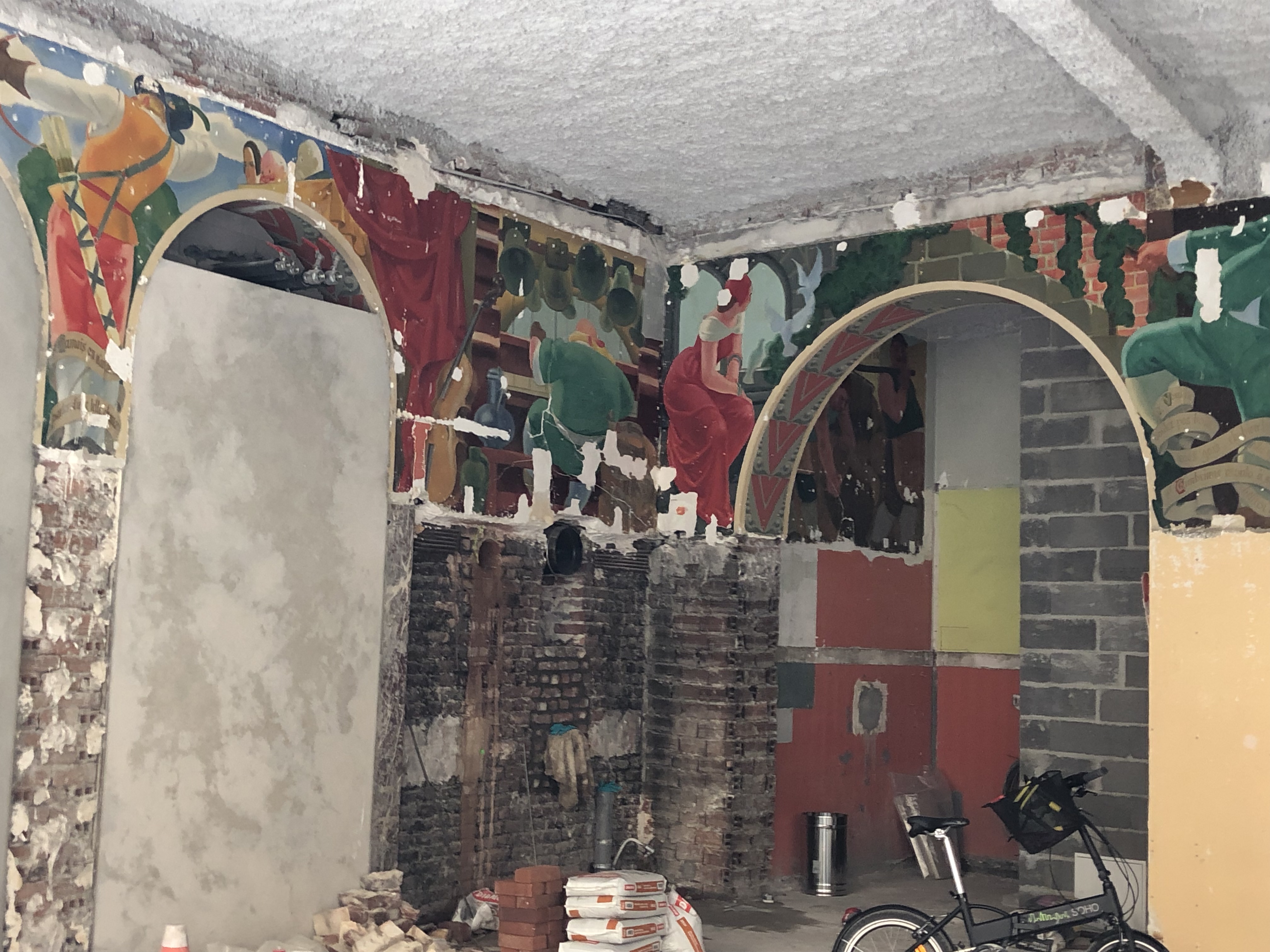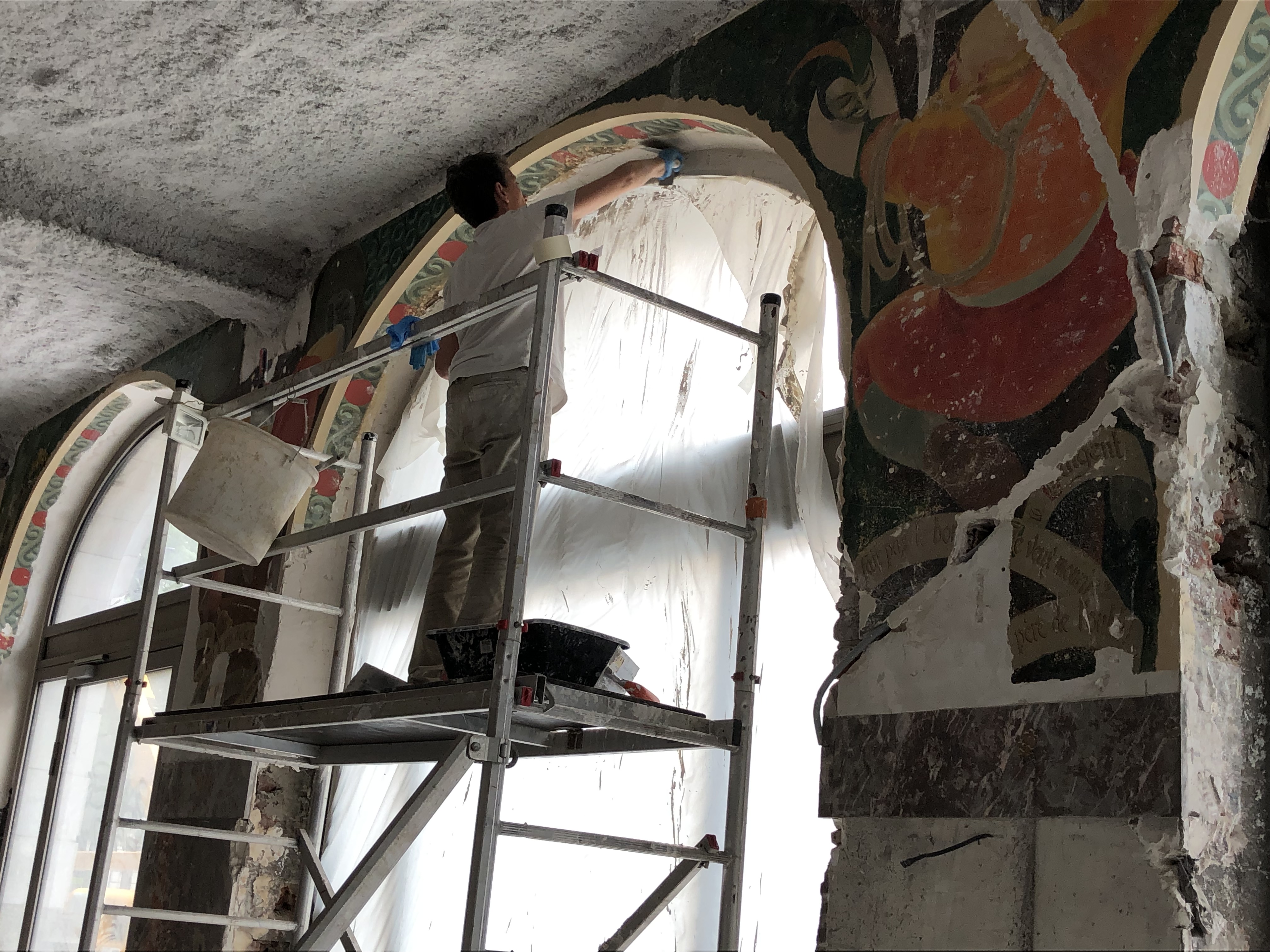 In many ways, it was a bit of a difficult month between G’s back injury and the heat. It was quiet and I missed our activities together but we fared better than many others with the weather. We did get out into our immediate neighborhood for quick, short trips, that sported all sorts of activities that we mentioned above. We also just take photos of things that interest us. We ran across these folks below from a restoration company south of Paris working on an interior mural from the 30’s in a building across from the Opera House. The restoration specialist told us the building once housed a bar, then a Post Office, and soon again, a bar.