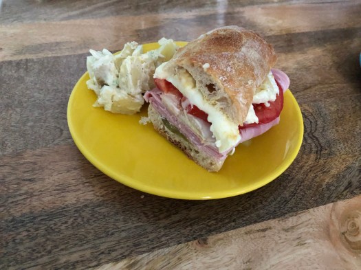 So as a result of not really knowing the events scheduled around us here, much less knowing (yet) how to find out, the months do not have markers which signal to our brains exactly where we are in the year. Our family and friends email about their plans during events like Labor Day, Memorial Day and in this month, Independence Day. And sometimes it’s a bit of a jolt to be reminded what time of year it is. In homage to the 4th, we made picnic favorites of ham sandwiches, potato salad and a blueberry peach pie.