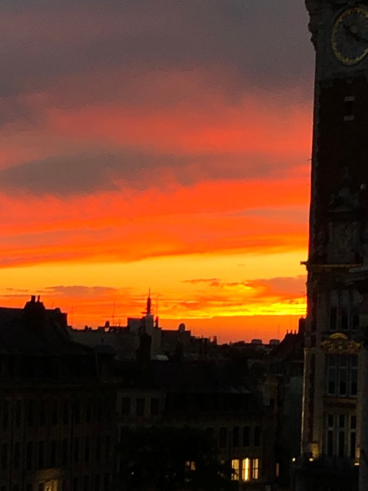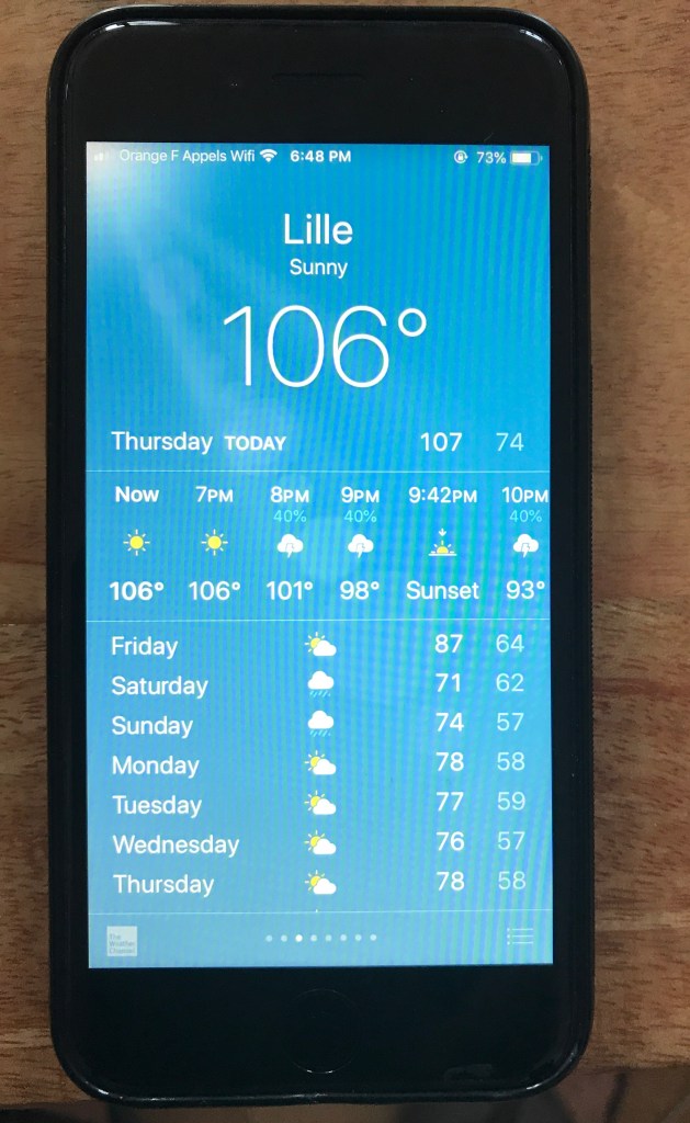 Otherwise the month was rather sedate. We bought sport’s shoes upon our return, on the recommendation of our GP, to step up our walking for a faster heart rate. After G recovers, we will have to go to the train station plaza or indoor mall for the smoother pavers, for the fast walks. We read a great deal, while G convalesced. I worked on starting to put French vocabulary signs on the walls, as I had done in the states when we were working with a tutor. Our meals were very light and often cold, since the temperatures rose again. The last week’s temperatures broke records again, as they had in June. The 23rd and 24th had the high 90’s but the 25th soared to 107, the highest ever recorded in Lille. Paris topped out at 109. With the open windows and cross breezes in the morning and evenings, plus AC at the height of the temperatures, we were OK. Any errands I needed to run, were done in the morning. We were incredibly grateful to have the tools to survive the miserable weather. It was only on the last few days of the month that we were able to go out in the evening and enjoy a meal out.