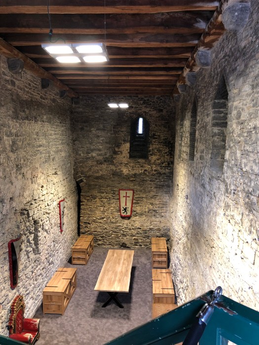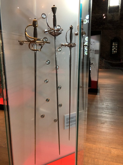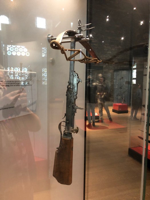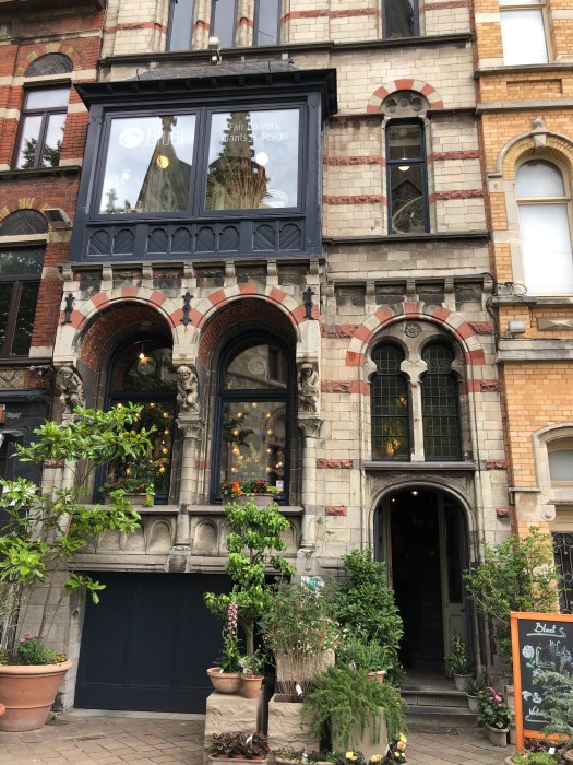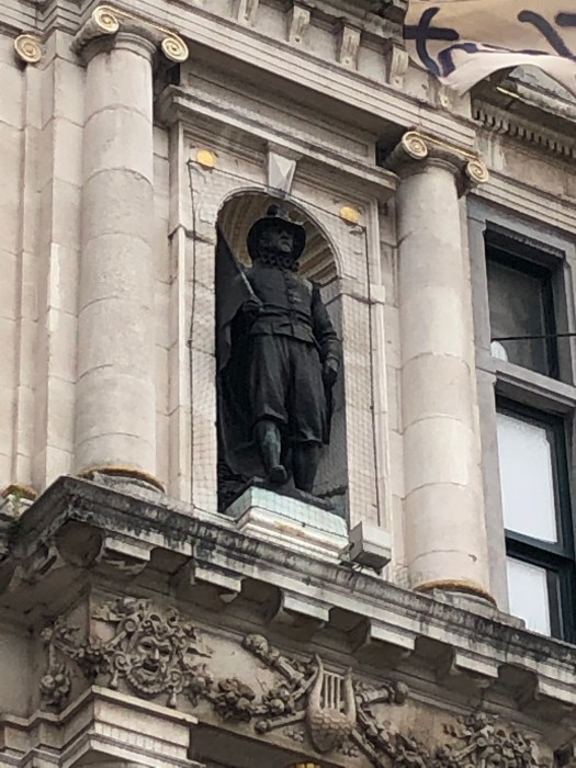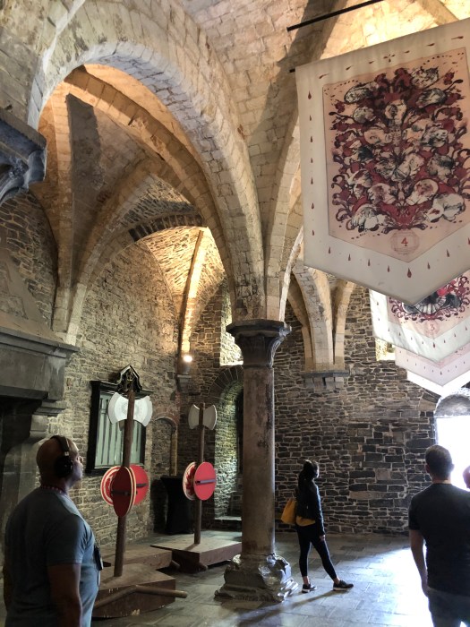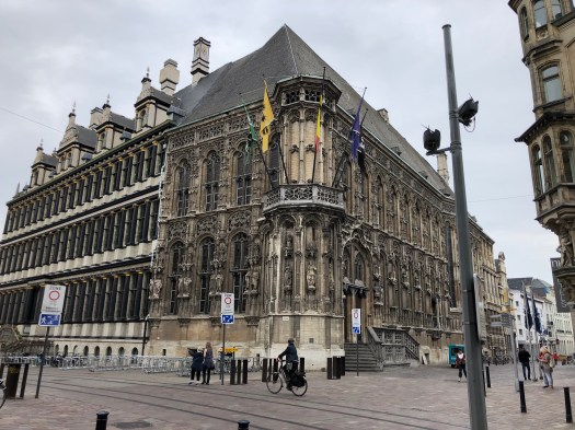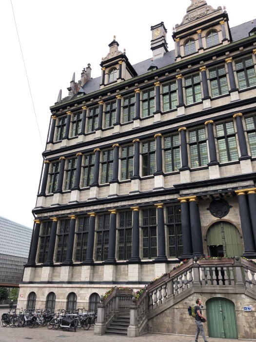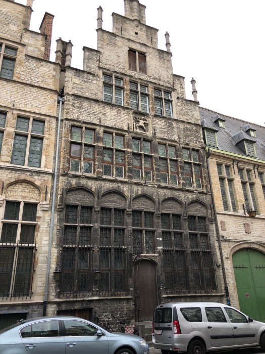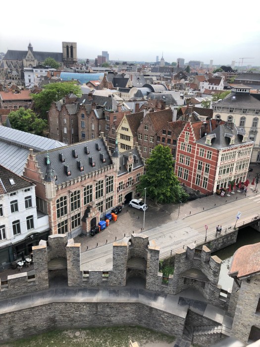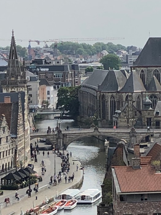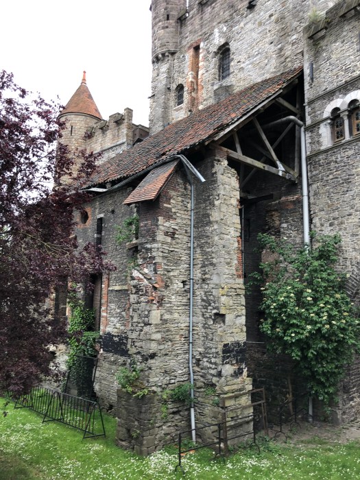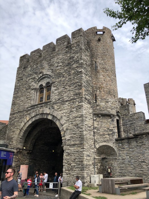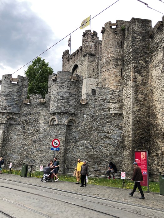 My foot and ankle has not yet returned to normal, so when they decided to take the audio tour of the Gravensteen castle, I opted to sit at a nearby cafe for a cup of tea, where I could see the entrance. While they were inside, I watched as a group of about a dozen children were standing at the entrance, listening to an adult lecturing on the castle. They were all dressed in medieval style tunics and were receiving instructions to stand in two perpendicular lines, all facing the castle. Then to my amusement, they all began to chant some words while they swung their arms back and forth to the lecturers dictation. I realized that they were being taught to batter down the door with (imaginary) logs, as it was once done long ago. It was really a clever way to engage them in the history of the times and they were clearly enjoying themselves. Once they finished with that activity, the adult shouted, “WE’RE THROUGH !!” and all the kids ran in, “storming the castle,” yelling as they did it. Such great fun to watch.