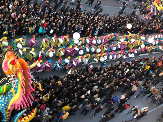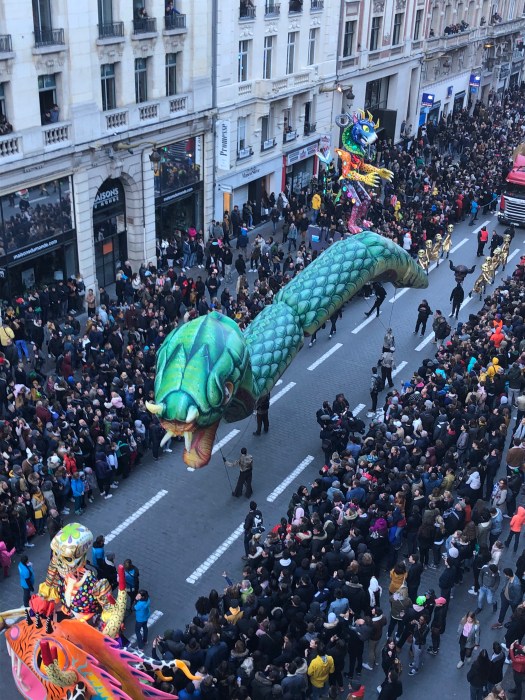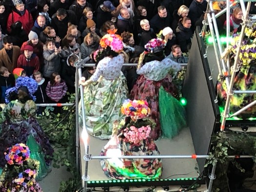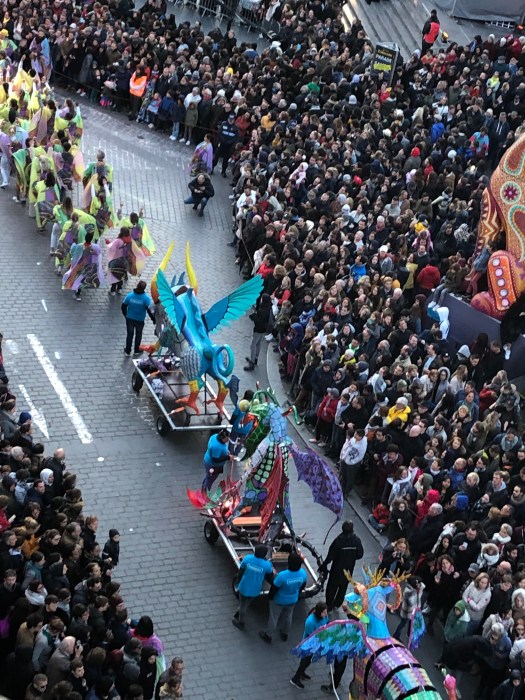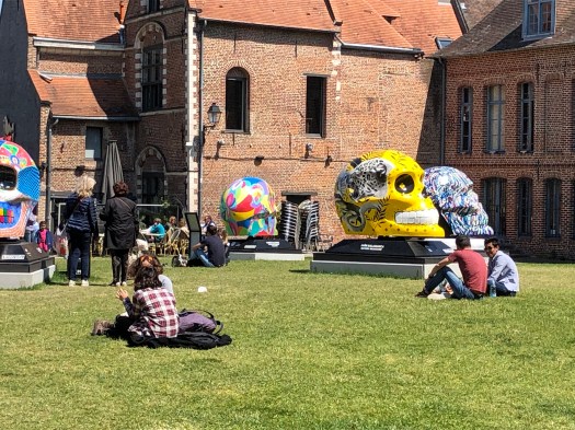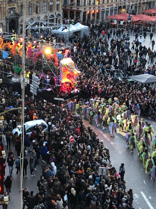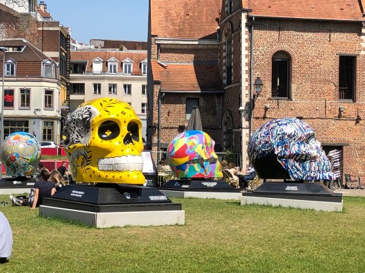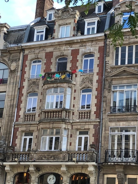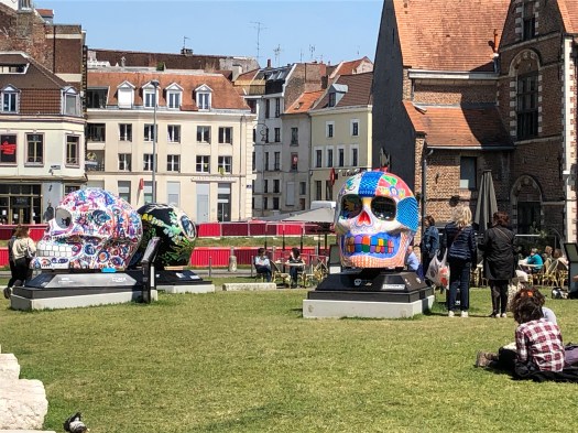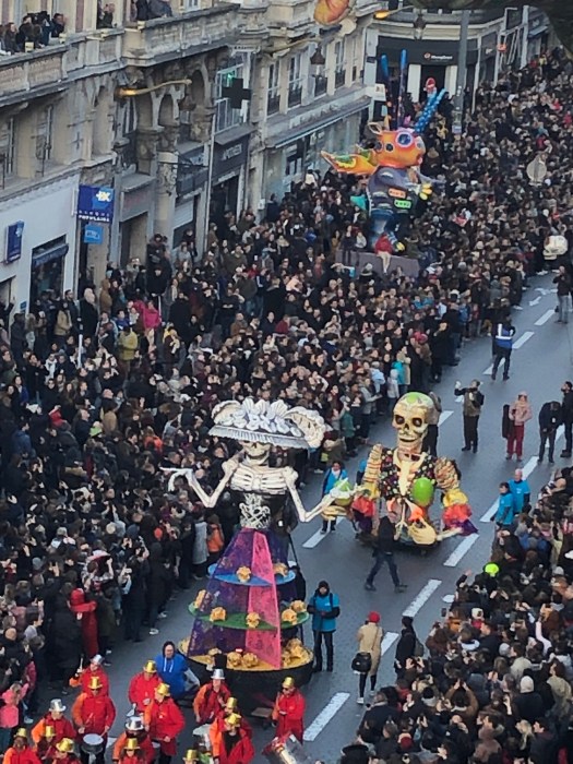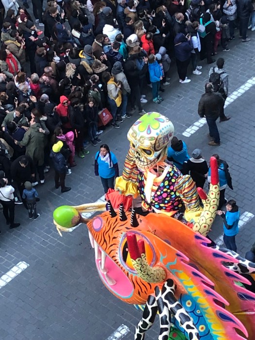 The festivities began with a Mariachi band playing in front of the Opera House before the parade started from the train station square, down the street to the Opera House square and continued through the streets of Lille. The colors were fabulous, with large sculptured floats, costumed dancers and marching bands. Tons of skeletons, calaveras and Frieda Kahlo-dressed dancers. There were three large balloons; a long tethered snake, a turtle and a dolphin. The balloons came just to the height of our balcony and it was really exciting to be so close. People were hanging out of the windows and balconies all up and down the street. All the colors, costumes and music were great fun and the party lasted until 2am ending with fireworks. When we got up the next morning, every piece of equipment and evidence of the festival had magically disappeared.