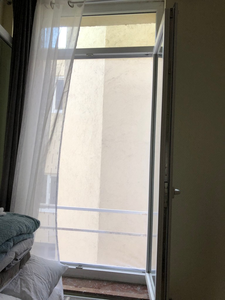 G and I returned to Lille a couple of days before the girls. Having failed at finding screening material, we researched more online for solutions. Overall the first kit we tried for one window worked, teaching us quite a bit in the installation. I cut it just a smidge too short, learning about an overlap issue and the screen tore when we closed the window, teaching us about the window mechanism allowance. Confident now that the kits would work, we ordered on quick delivery, enough for all of the windows. Unfortunately they didn’t arrive. Once we got an email stating that the package had been returned due to damage, we hunted in downtown Lille for a solution. We found mosquito netting in the fabric store and having learned through the first kit how best to attach it, we got the velcro at the hardware store across the street. We weren’t able to install it in time before the last night we hosted Las Chicas.