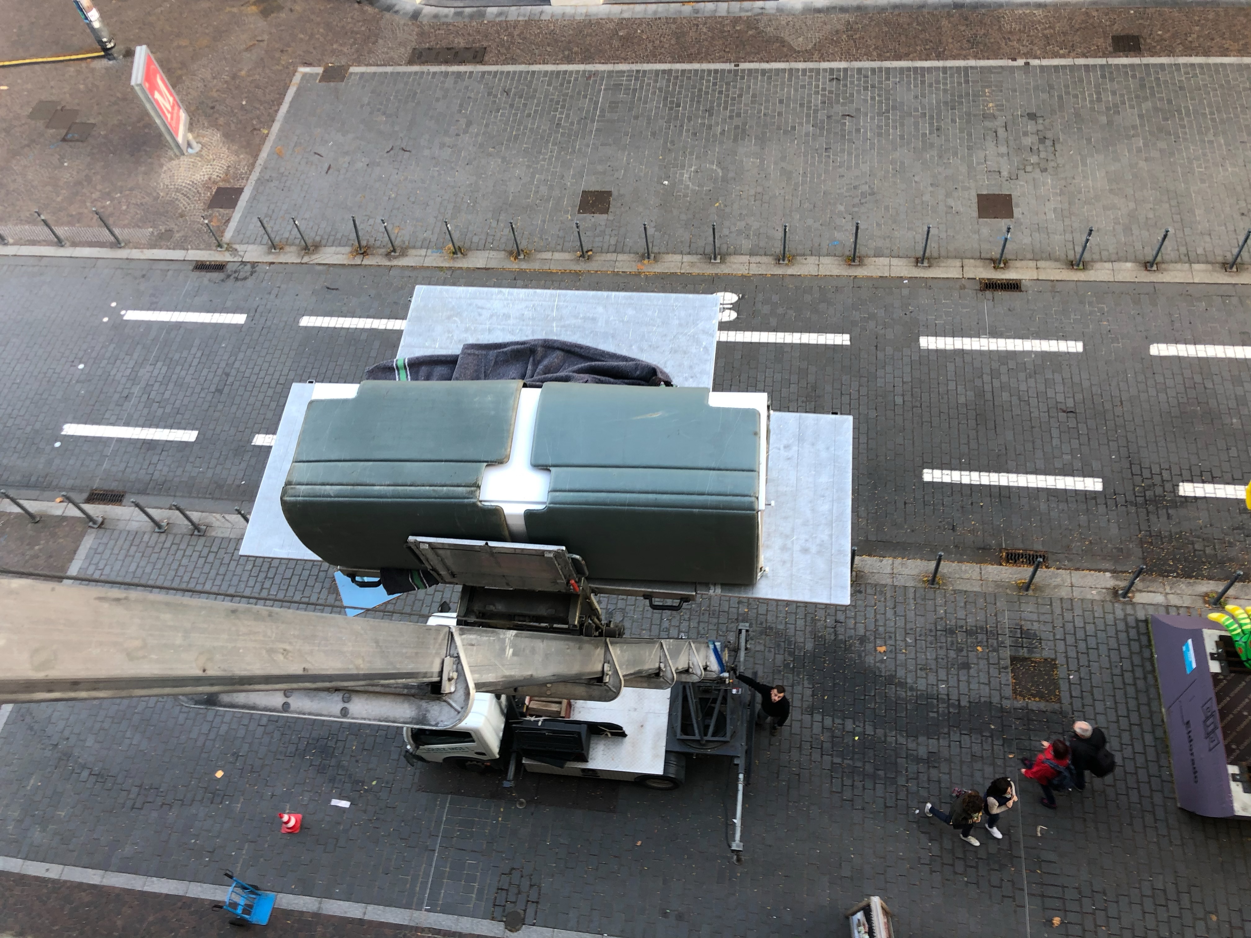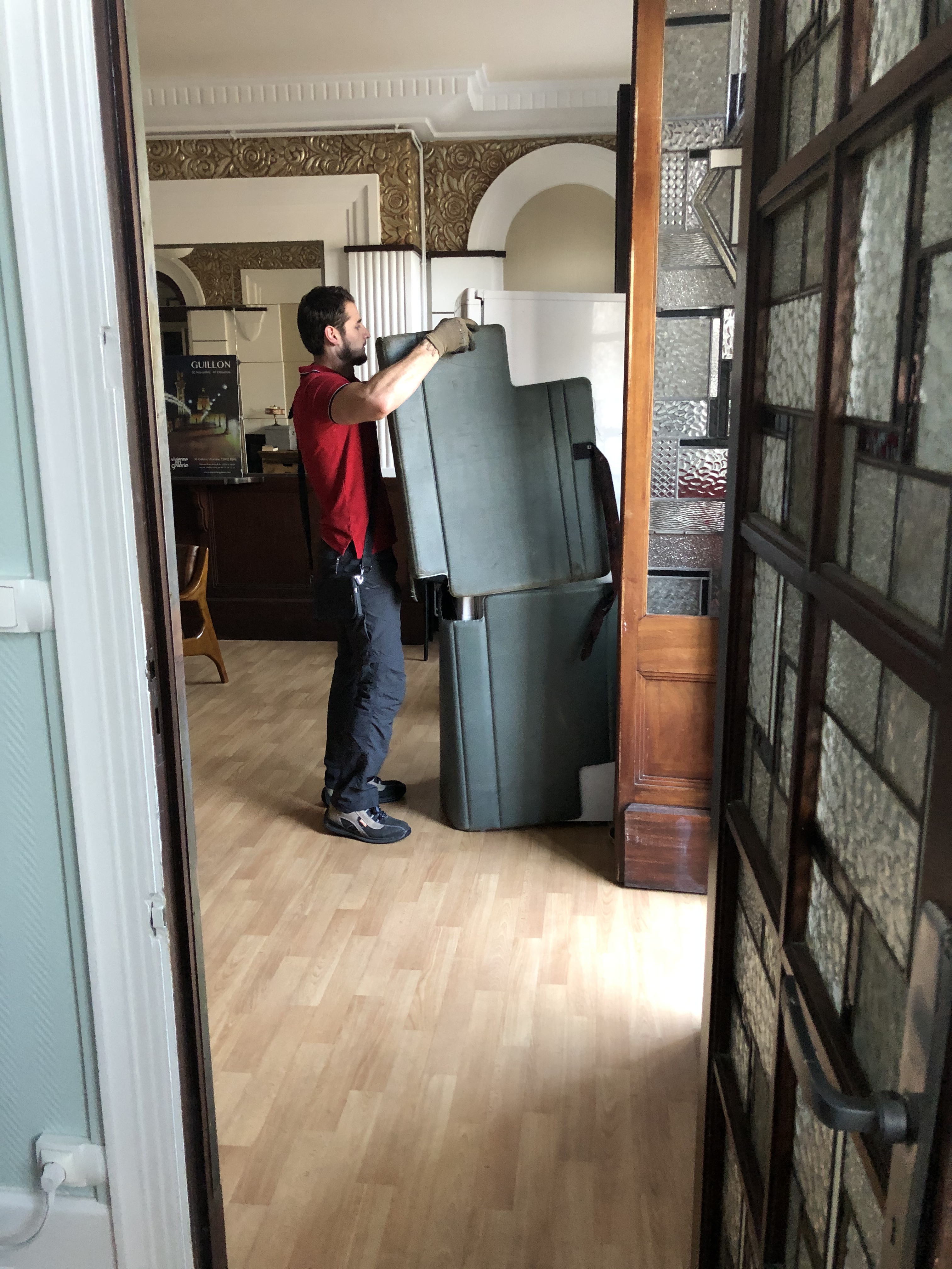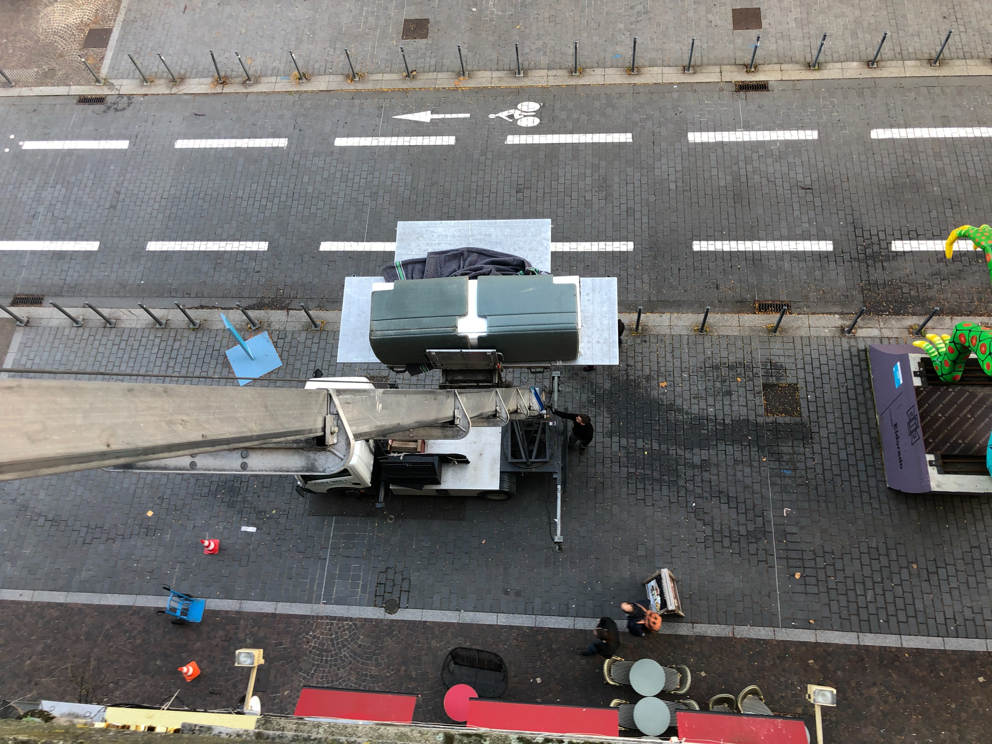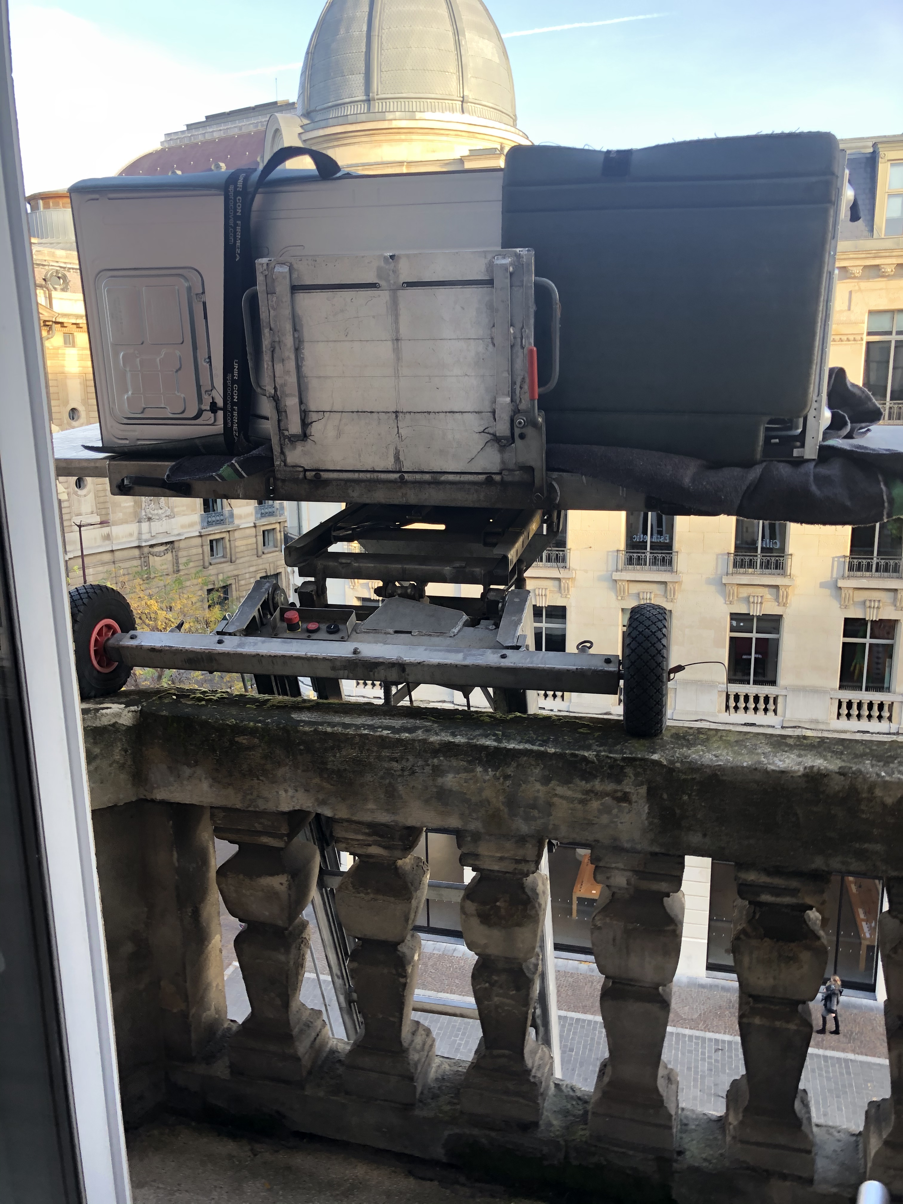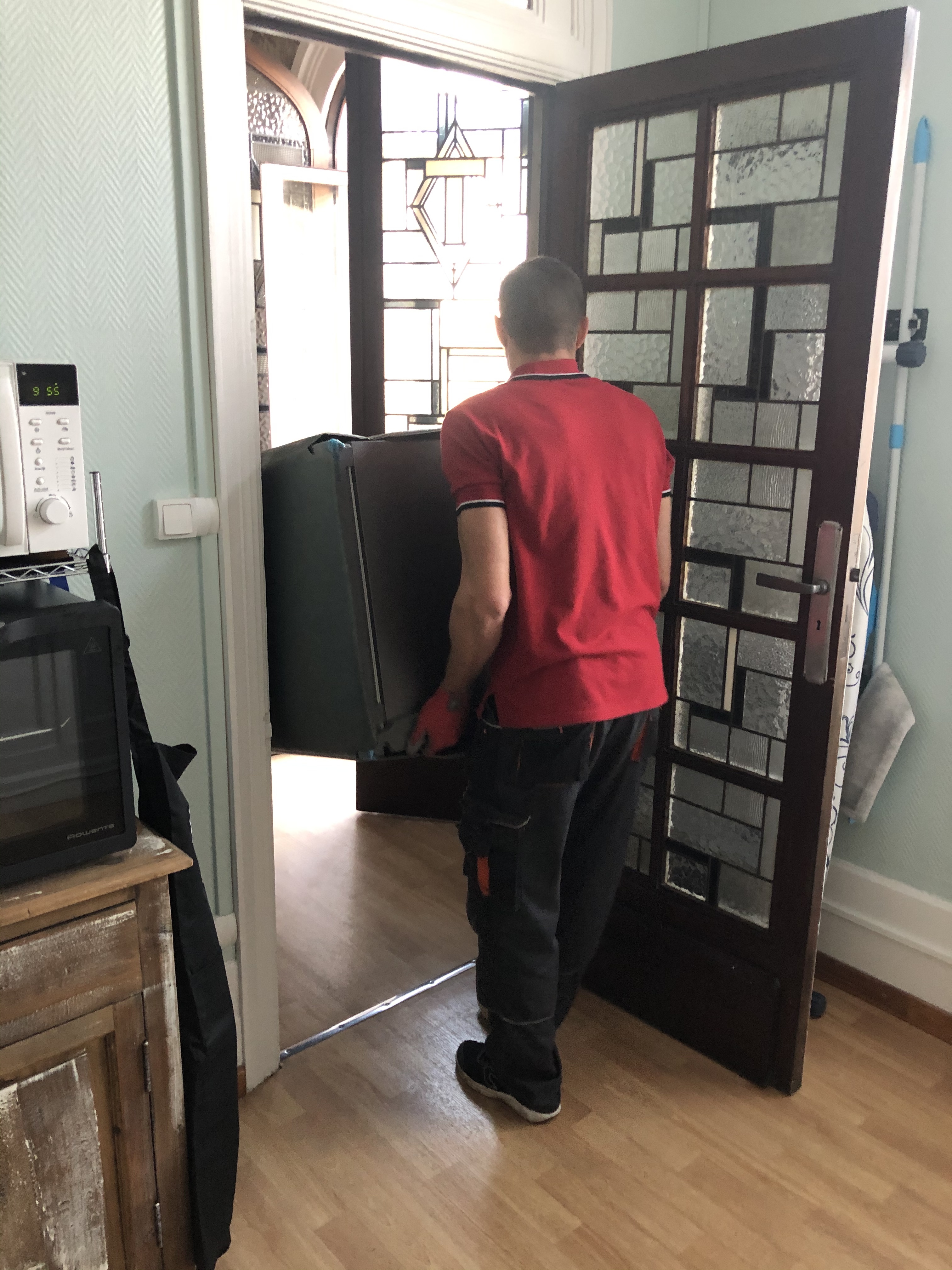 They admitted that theirs was on the edge of quitting, as it had begun to leak. We’d been looking at replacing ours (reportedly 12 years old and left by previous tenants), so we offered it to them. Their eyes lit up with utter joy over the prospect and Cyril, clapping his hands, exclaimed that it was “just like Christmas!” The only stipulation was that they had to remove it. Plans began immediately, as we measured the unit with and without the doors. The end result was that they could indeed get it up the stairs and get it into the kitchen, after removing the doors. We ordered a new one for us, still tall yet a bit smaller in size and then completely scrubbed the old one in preparation. The new one arrived by A lift through the balcony door. The old, leaky one from our upstairs’ neighbors, which they had brought down to our place, was taken away through the balcony.