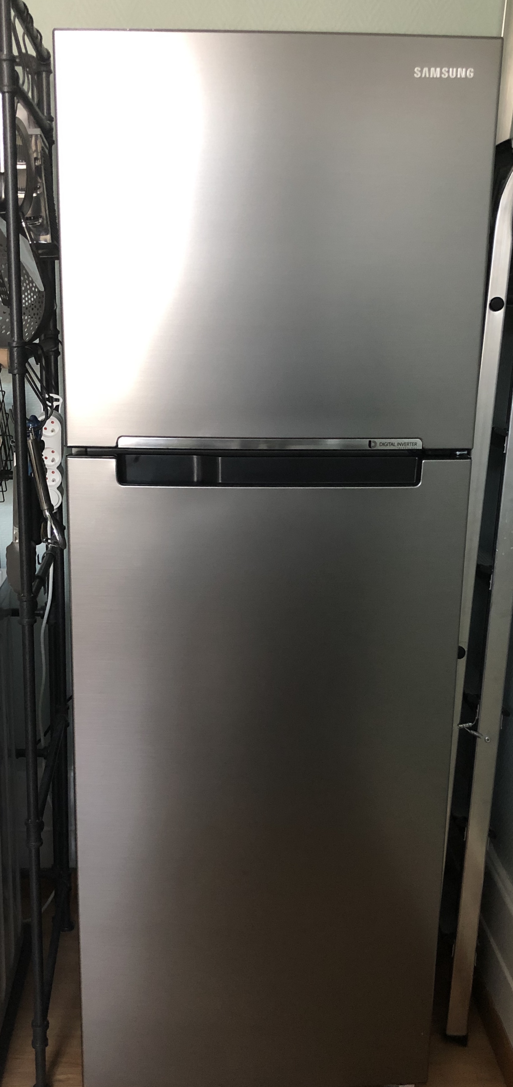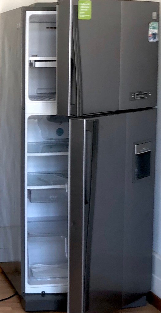 We delivered some leftovers to Fabrice, to try, as well as to our upstairs quartet of roommates. In discussions over food and cooking Cyril, who is the main cook of the four, admired our “American Style” refrigerator. We explained that for us, it was too large. We would prefer the size of the one that they had, which was better suited for two and ours was better for the four of them. Our old: