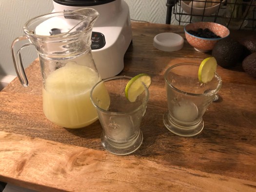 What a night! They all loved the margaritas, the simple classic tequila, lime and triple sec variety. We explained each dish on the buffet and the main differences between traditional Mexican cooking which we had prepared, versus California, New Mexico or Texas Tex-Mex cooking. They tried the chips, salsa and guacamole to start with, as well as all of the following dishes, clearly enjoying them. Flo loved the Horchata. Sofie loved the Capirotada. No one wanted a coffee with dessert but when Flo saw G come out with an espresso, his eyes lit up and asked for a coffee after all. He thought G was going to serve American style coffee, not a proper French coffee. Curious, he investigated G’s coffee machine and gave it his full approval !