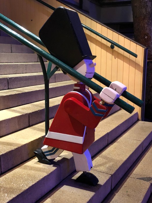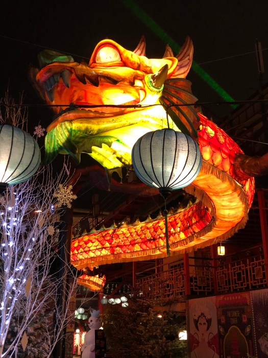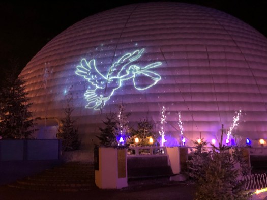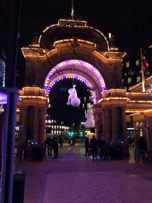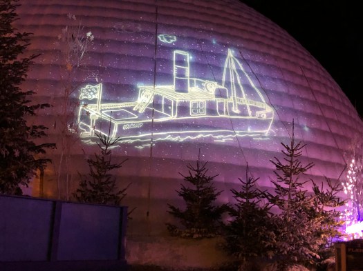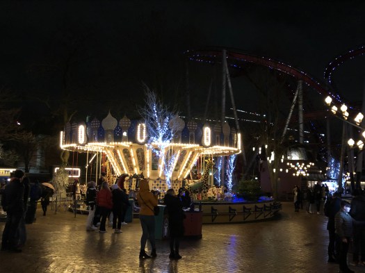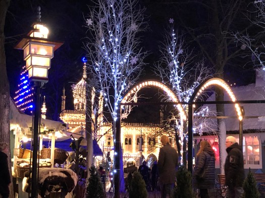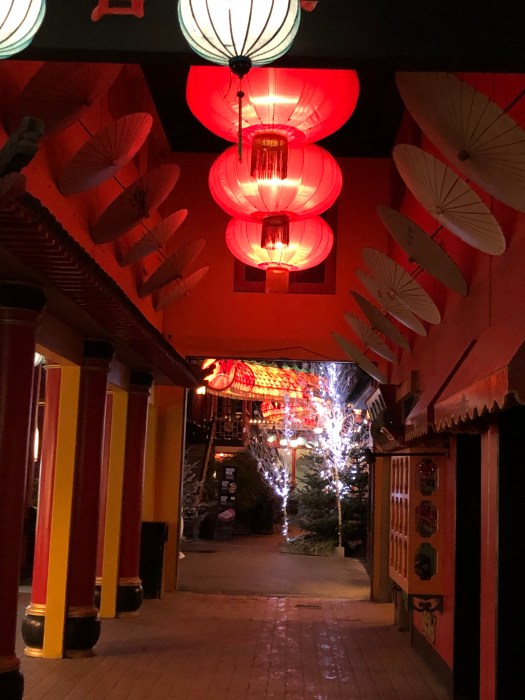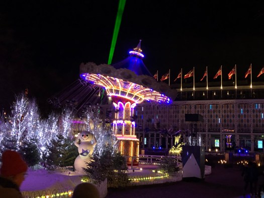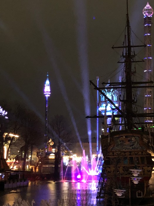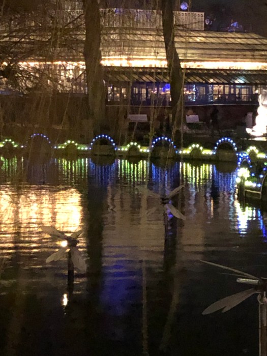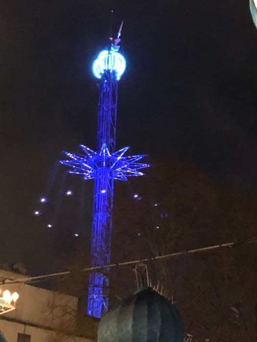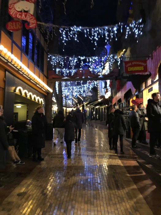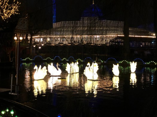 Once in, it was a bit overwhelming with a maze of pathways, wound around shops, restaurants, a lake, rides and arcade game areas. It’s an incredible barrage of bright, fanciful and playful light varieties. There was an hourly light show on the lake, which housed large, lit swans, lights that mimicked plants and a huge pirate ship, which was not animated that evening. Both of us bought gloves, learning that lambswool is the warmest that one can acquire, sans seal, which is used in the arctic.