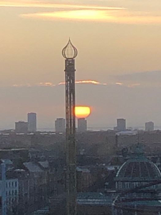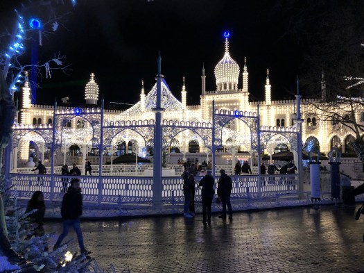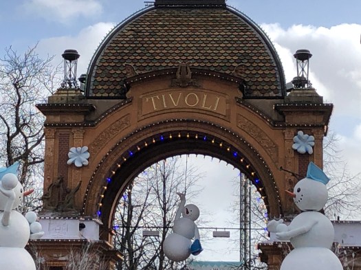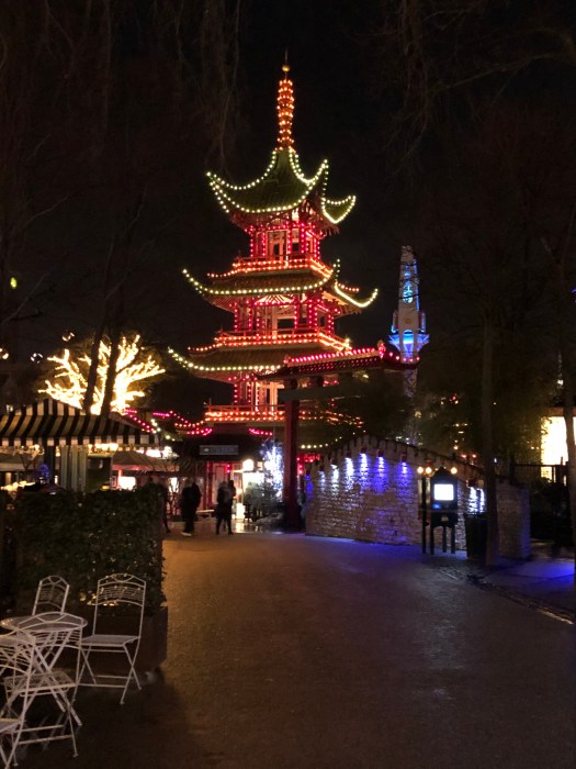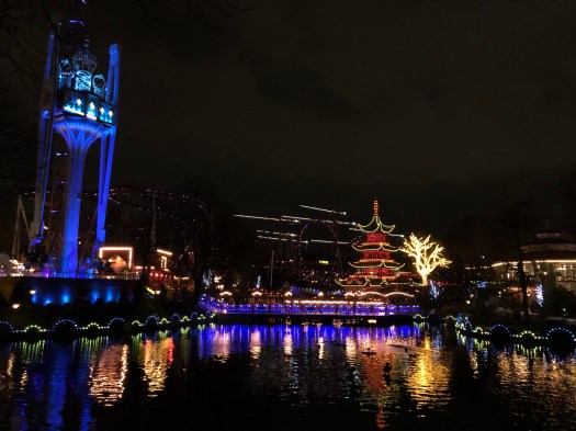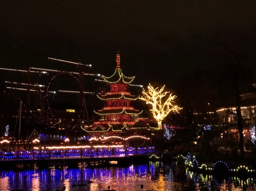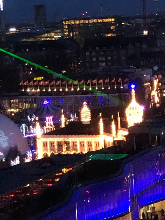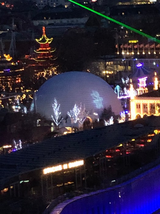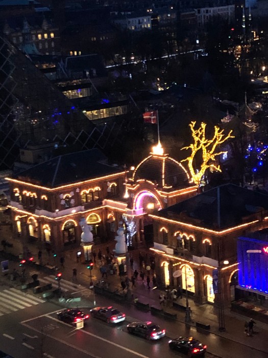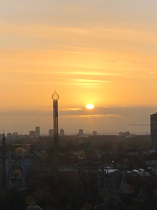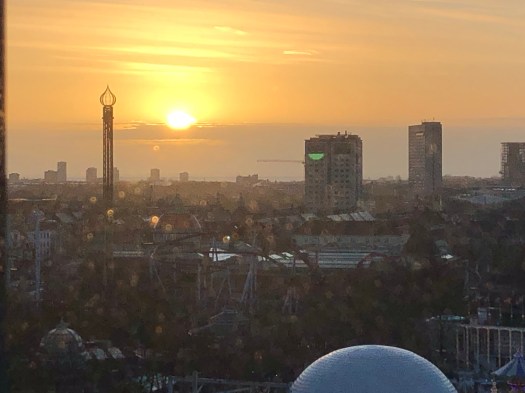 One morning we experienced a beautiful sunrise from our room, across from the Tivoli Gardens. In the evenings, Tivoli lit up like a pot of jewels that called to us. We could see the grounds from the hotel room, all colors imaginable, with fascinating shapes and rides.