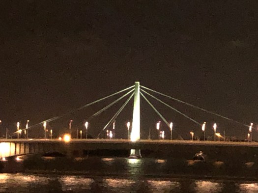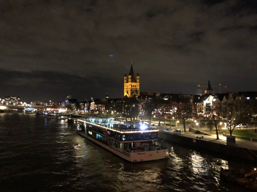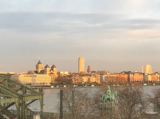 The next morning, a beautiful sunrise shining on Cologne across the Rhine from our hotel.