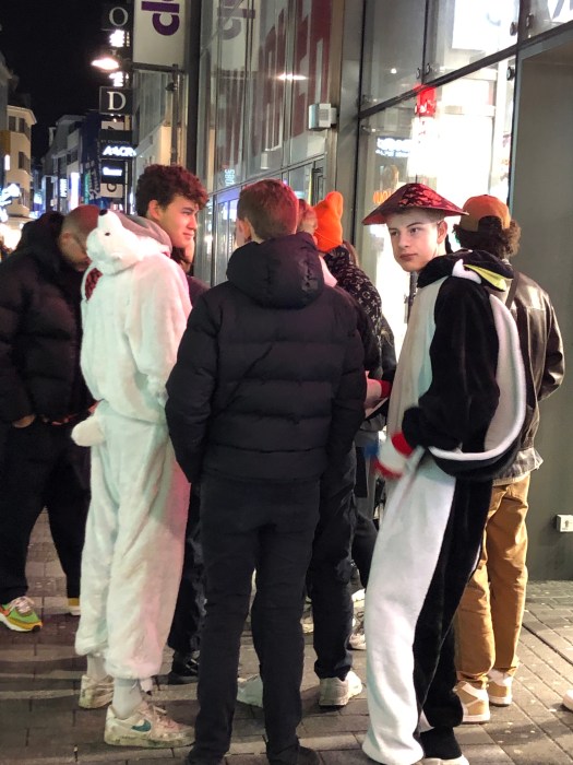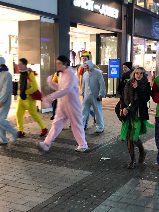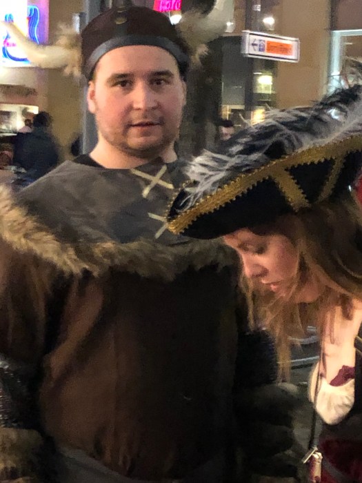 After settling in, we walked across the bridge, into the downtown area, utterly amazed at some of the costumes. There seemed to be an unwritten rule that if you were in a group of 5 or more people, you had to wear matching outfits. A majority of men favored costumes which were gaudy 60’s track suits accompanied with rather moth-eaten shoulder length wigs. Unfortunately those photos were blurry. Maybe it’s for the better – you could go without seeing them! In town, bars were stuffed to the rafters, lit up with disco lighting, all blaring a wide variety of loud music. No description really suits any of it.