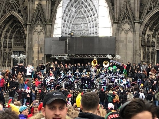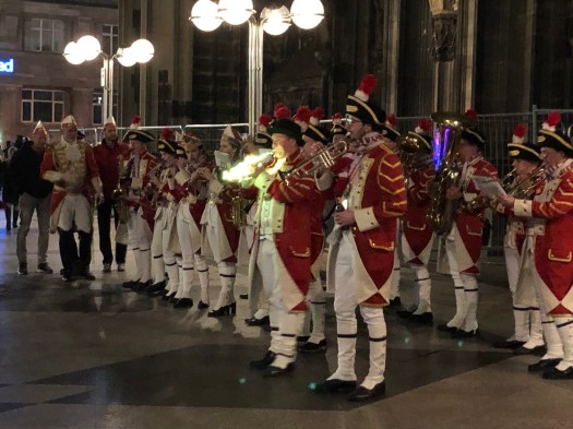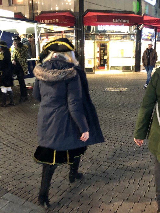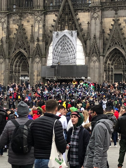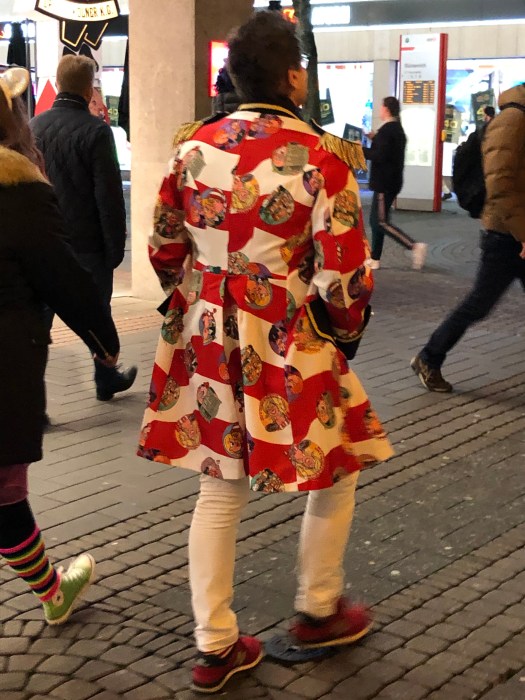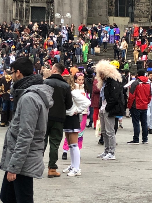 Our journey back home included a stop in Cologne and as with Copenhagen, the weather was rainy, windy and cold. But these cities are so beautiful that you forget the weather entirely. Arriving in the late afternoon, we stepped off the train completely unprepared for the sight to greet us. It seemed as if everyone had raided a warehouse full of clothes owned by early Elton John, Sigfried and Roy, Liberace and maybe even Richard Simmons. It was enough to make us question that we’d disembarked at the right station. Trying to keep my eyes on the signs to make sure we were where we were supposed to be and to get where we needed to be, was a massive challenge. At the hotel check in, we politely inquired about the variety of dress we were witnessing. Clearly we were the only ones on the earth not to know that this was the weekend of Carnival in Germany. Cologne is one of the big hosting cities and the attendees came from several countries to join in.
