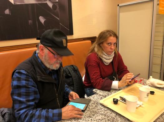 A small note of the world’s reality here. No matter where you travel, you should always be aware of your surroundings. We never post pictures of people but this snapshot of these two, unremarkable people has a story. In waiting for the train from Cologne to Brussels, we stopped in a station cafe. The couple was positioned in the cafe with a straight shot of the front door and the order counter. I took that picture only because he was filming everyone that came in. They’d turn off the mobile phone camera until another person entered or came to the counter, then he would begin filming. And he shared the films with her in-between. Once, as a couple was leaving with a child about 8, they both followed their progress from the booth to the door, specifically looking at the child. If I hadn’t have been sitting right next to him, their actions would not have caught my eye. No one else in the cafe was aware of what they were doing or that they were being filmed. It’s not illegal to film strangers in public and the police had their hands full with the entire train station populous dressed like circus performers. I only took the picture to let them know they’d been witnessed and perhaps to make them a bit uncomfortable, knowing they’d also been photographed. No confrontation, nothing to be done. But do watch yourself and your kids, as alway, when traveling.