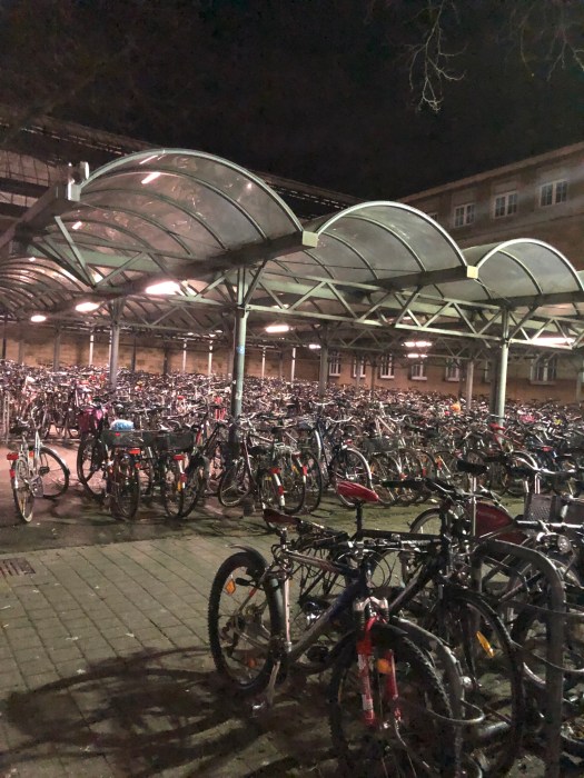 We took a train in the late afternoon to Paris, then another to Karlsuhe, where we had another train change. In the two hour layover there, we again saw how much people depend on their bikes for transport in the European cities with the bike parking throughout the train station. We had a delightful conversation at the bar, over dinner, with a local named Denis. We spoke of travel, global experiences, life in general.