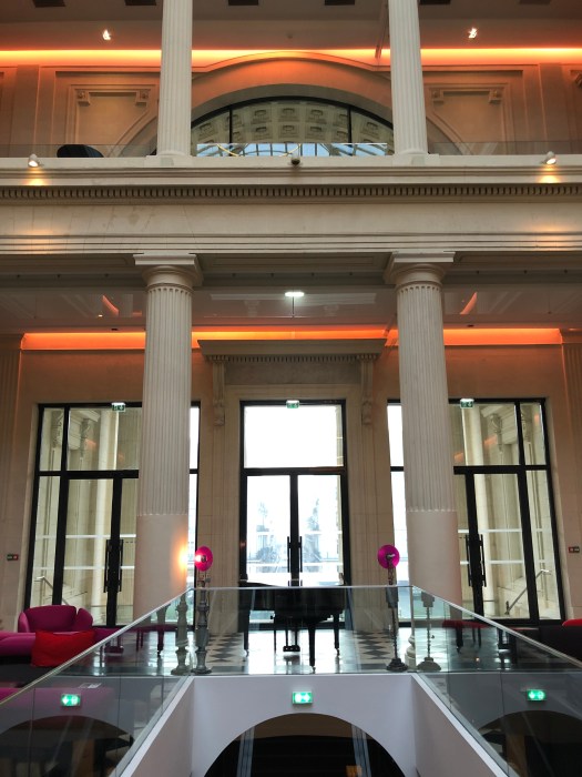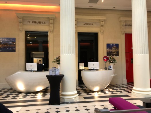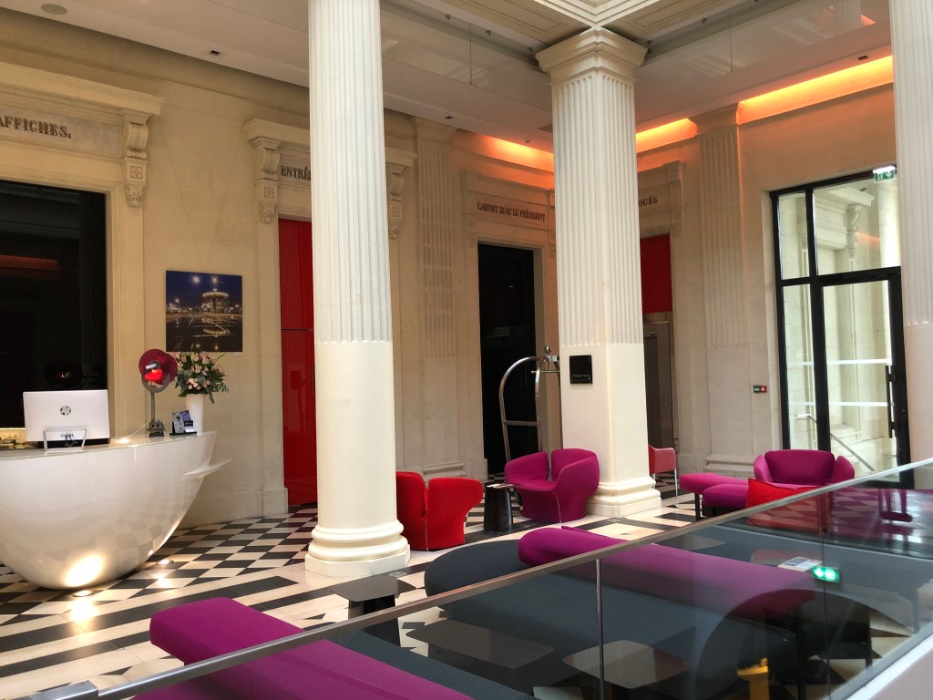 Nantes (pronounced “knownt”) would have been the next city to look at last year, if we had not enjoyed Lille or had been unable to locate a suitable apartment. It is a good-sized city, that includes the Island of Nantes (Île de Nantes) with a large English-speaking populace. But it was second choice because its climate is warmer than we care for and it’s farther away by train to many of the places we wish to travel to. Upon arriving after a five-hour train journey and checking in, we took a walk around the downtown. We stayed at a central hotel that was renovated from its previous life as a courthouse. It was a very nice place, great staff, yet the interior left us a bit cold. Although, I must add that they gave us a pillow spray each evening that was decadent (photo further below) – which we’d never experienced.