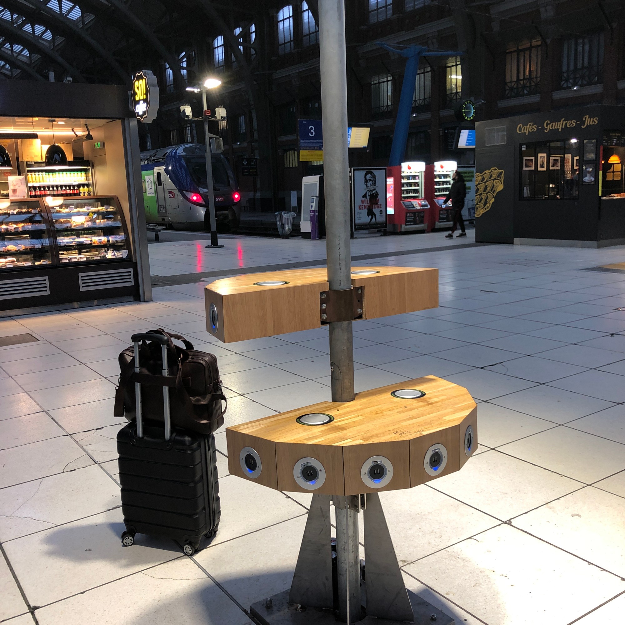 After meeting our friend, Laurent, for cocktails, we wished him a safe journey as he was going on a month-long meditation in India. We also made hot cocoa suiting the weather and delivered a few batches to frosted friends. It was cold this month. Then we jumped on a south bound train to Nantes. We noticed for the first time in the Lille Flandres train station a mobile counter for people to enjoy their coffee/beverage. We liked it!