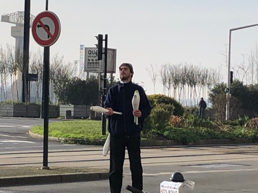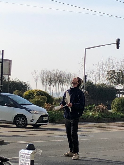 Interesting that parts of Nantes reminded us of San Francisco with its hilly streets. The young guy in the photos with the juggling pins also added to our SF vibe. He would go into the middle of the street each time traffic stopped and perform a juggling act for tips for the stopped cars.