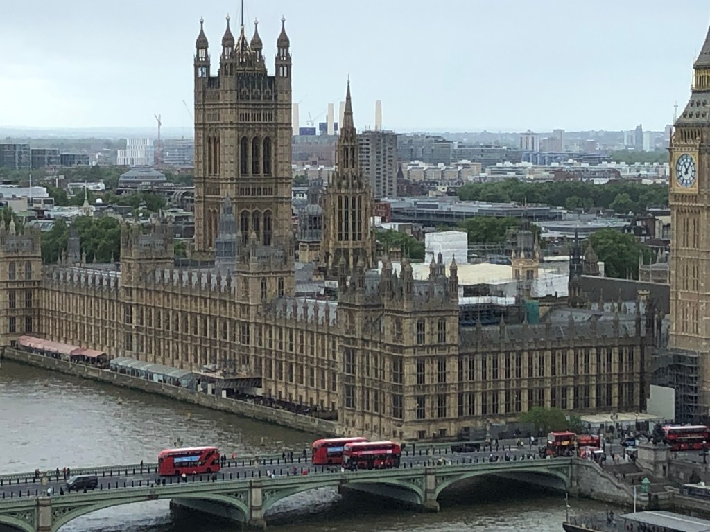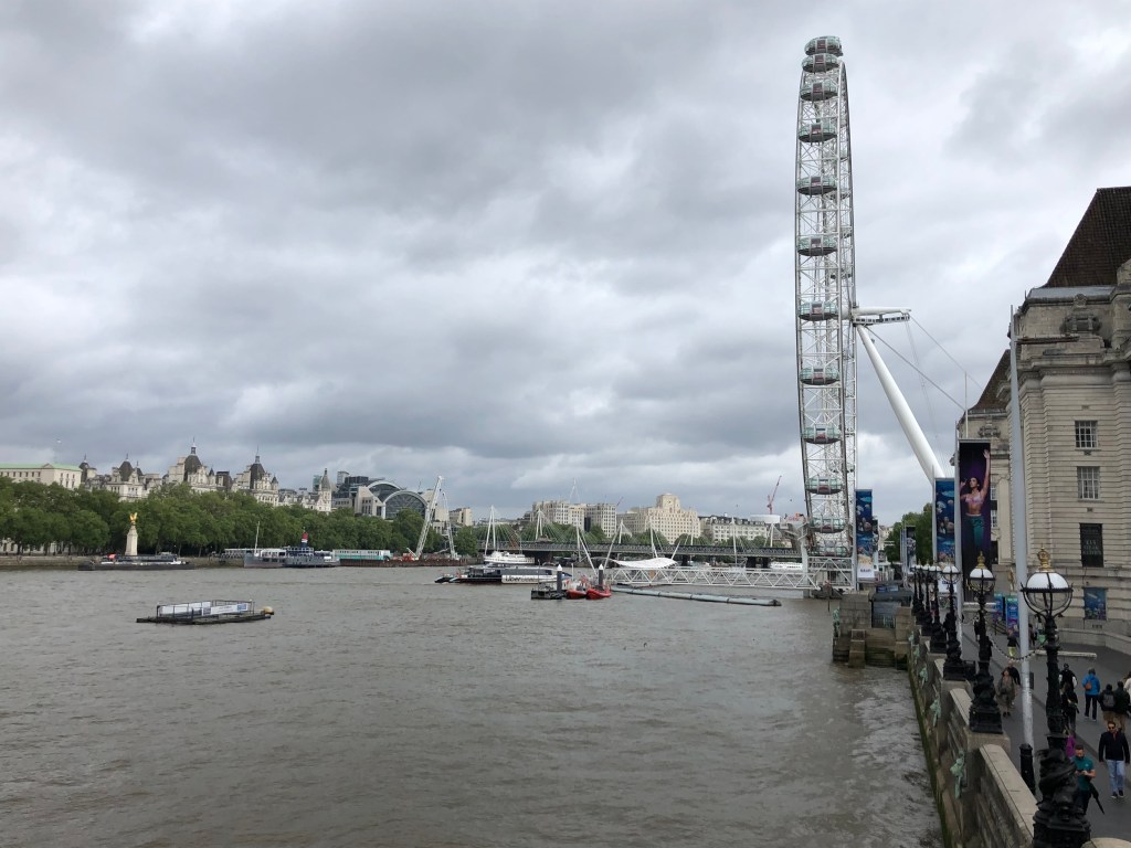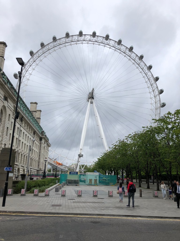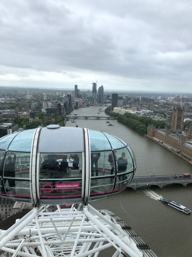The next day, G was up and good to go. We had breakfast at the hotel – good fare, then we walked to the London Eye. We were early, so we had a cup of coffee at a nearby cafe to kill time. Then, since we had fast track tickets, we got on rather quickly. The pods were like a comfortable lounge. A center bench which no one used and plenty of space to walk around the window panel-built pod, with the other 8 other people. For 10 people, it was a huge space – about half the size of an apartment living room, without furniture. Really amazing and it moved so slowly you couldn’t really feel it most of the time, similar to a ride in a hot air balloon, as we ascended and then descended.