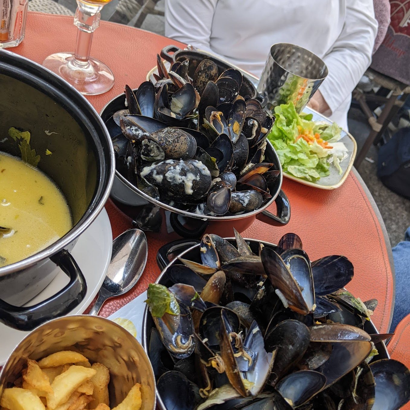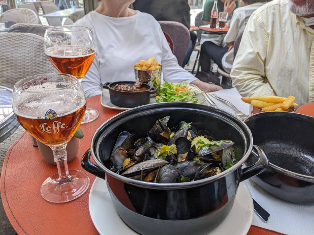 The next day, after we lazed in the morning, we walked both old and new Lille and shopped. We stopped for lunch – K tried the signature mussel (moules) dish of Lille, G as well, and tasted my carbonade – a beef stew, a signature Flemish dish. We stopped for a cocktail at our favorite café, Fool, where she met Remi, one of the three owners. Next we stopped at our Italian market, introduced her to the son and mother (Loailo and Balkisi), the owners, and picked up G’s favorite, Truffle potato chips. Back at the apt, naps and no one was hungry so we had white wine and truffle chips for dinner (Yes, we did and you can file that under the heading of how to treat your guests decadently). We watched a British detective series called “River” that K hadn’t seen, with Nicola Walker, before turning in.