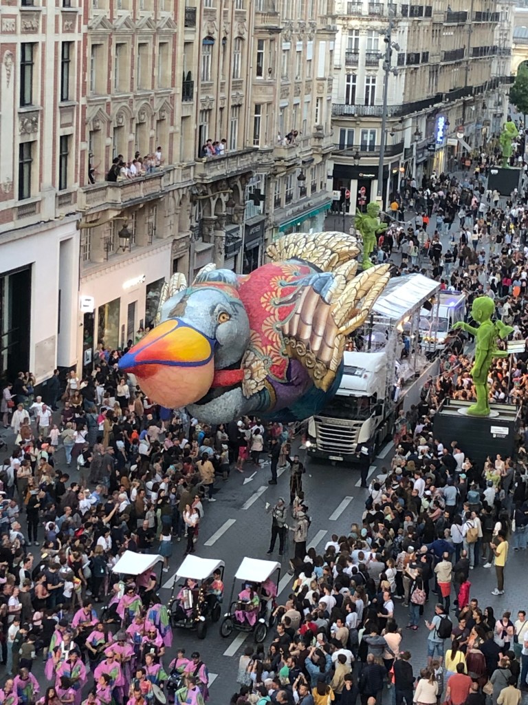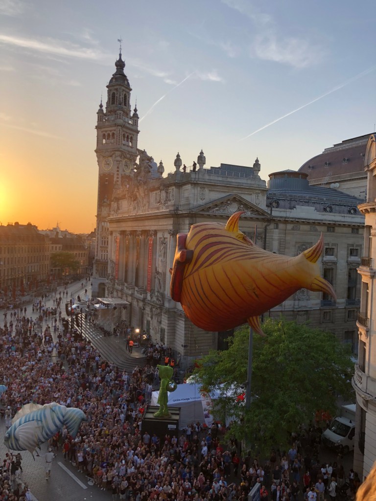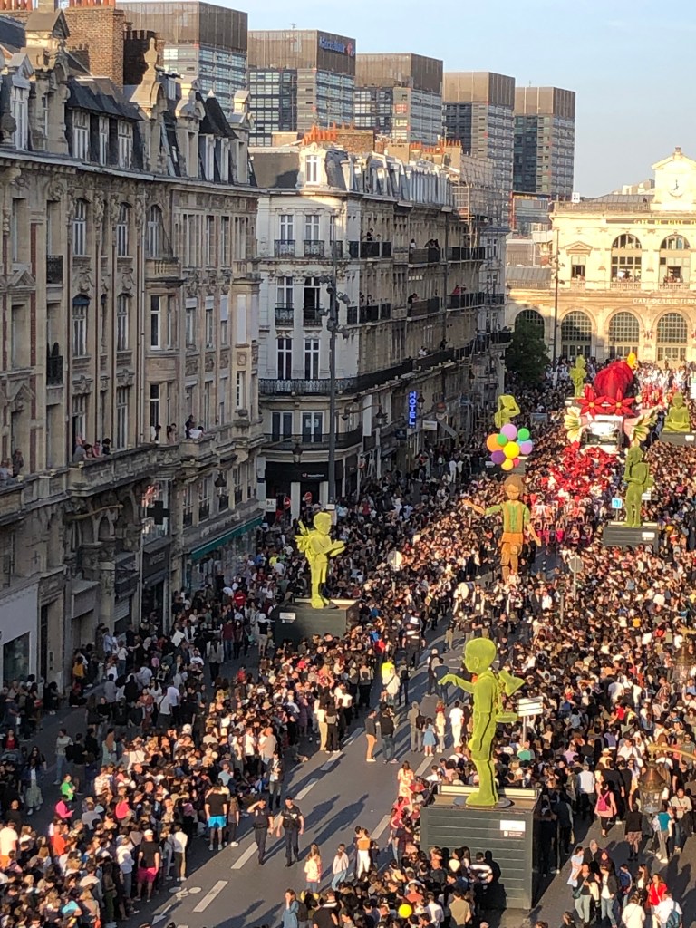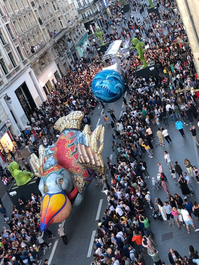 To finish off the visit, she was here to witness Lille’s triennial arts event, which has different themes each time. We wrote about the one held in 2018, called El Dorado, with its huge animal statues and parade. This year’s theme is called Utopia, with several French artists contributing a wide variety of arts. Again the street was lined with huge statues, this time they were childlike figures in mossy green, wearing fairytale woodland clothing. The town was packed with visitors for the weekend celebration and the weather was in the high 70’s, with clear skies.