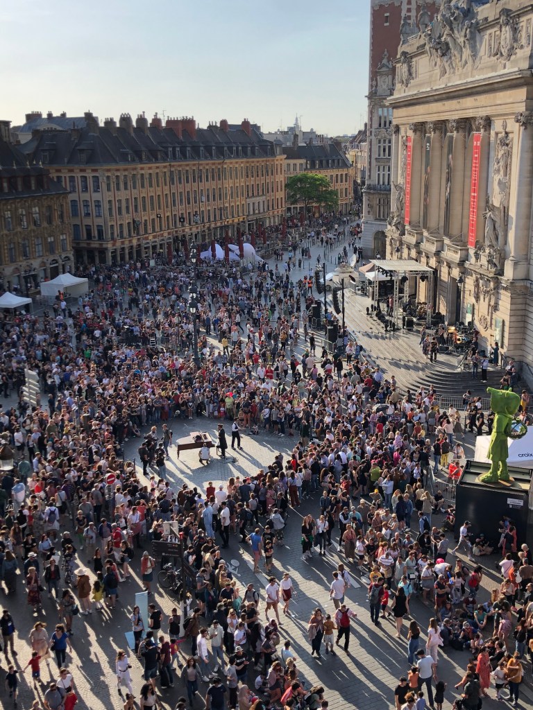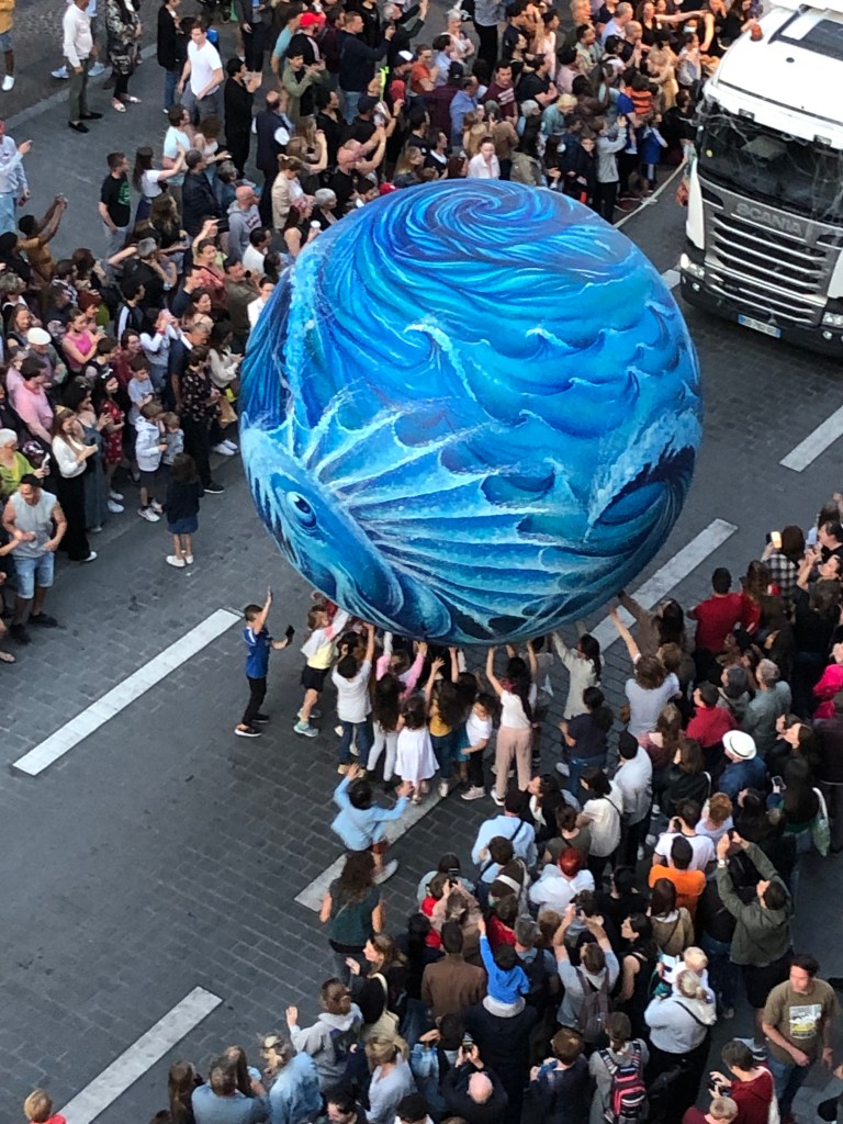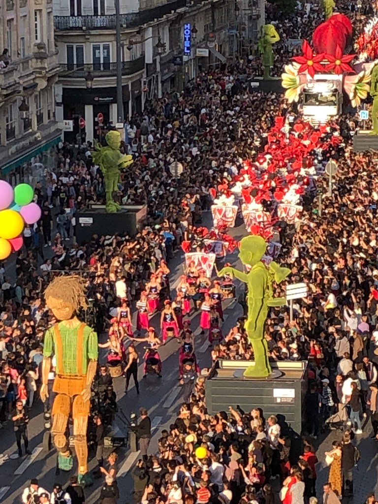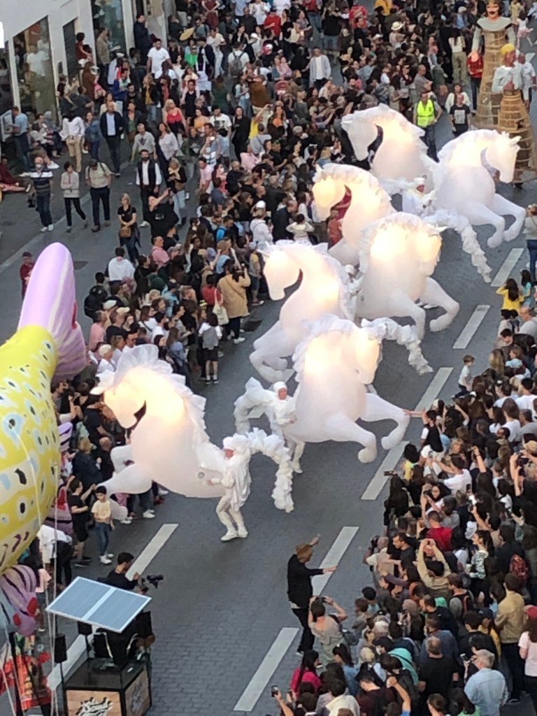 To finish off the visit, she was here to witness Lille’s triennial arts event, which has different themes each time. We wrote about the one held in 2018, called El Dorado, with its huge animal statues and parade. This year’s theme is called Utopia, with several French artists contributing a wide variety of arts. Again the street was lined with huge statues, this time they were childlike figures in mossy green, wearing fairytale woodland clothing. The town was packed with visitors for the weekend celebration and the weather was in the high 70’s, with clear skies.