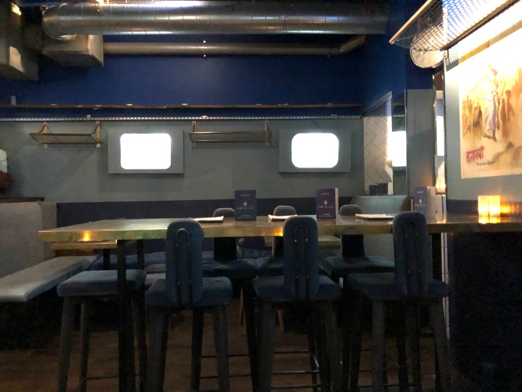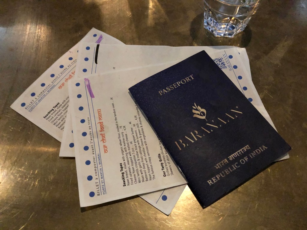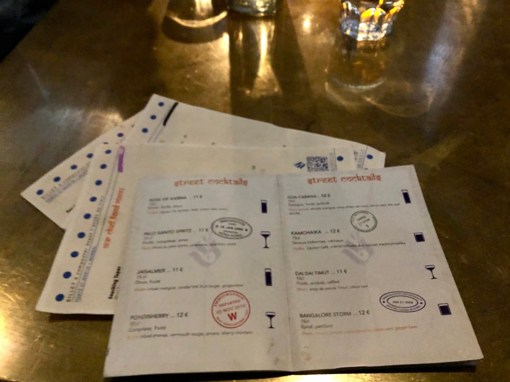 Bara Naan is an Indian restaurant, with a backroom speakeasy which had not yet hit the rush hour. The interior, after you push a door hidden in the wall mural, is a copy of the interior of an Oriental Express train car. The “windows” show a passing landscape – an ongoing film made from a moving train. The back “window” shows a film of the scene a train caboose would have, with the tracks and landscape receding in the distance, behind the car. There were brass luggage compartments hung above for coats and bags and had the lighting of a vintage train compartment. When the menu for the drinks arrived, it was printed on replicas of passports and the tapas’ menus were printed on train tickets. Much quieter than the Red Door, we sampled Indian gins and whiskeys, while eating fresh, hot naan. Done very well, all the way around. It was time to head back to the hotel and turn in. K said she’d gotten to see all the things she’d hoped for and gotten a real flavor of Paris. She said she understood why it was so difficult to describe.