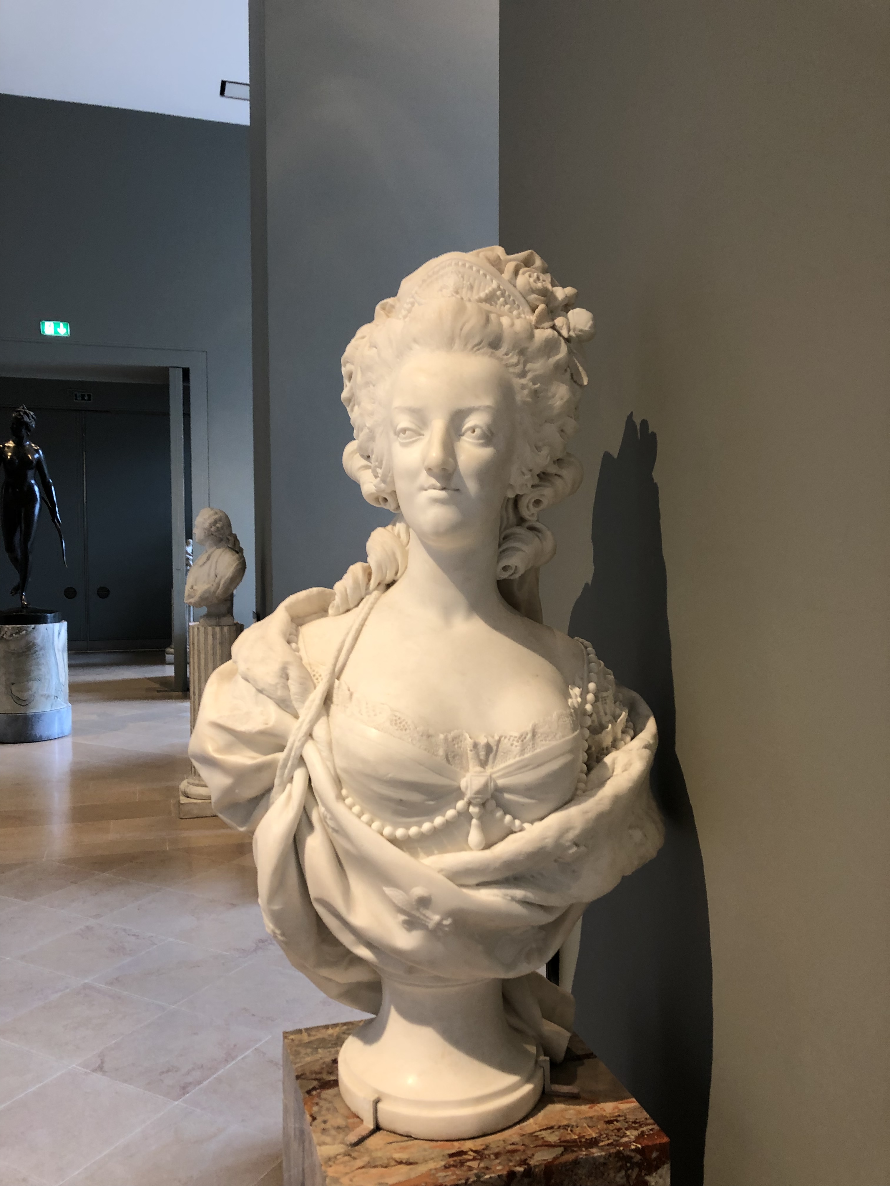 The next day, after breakfast at the hotel, we walked to the Louvre . K wanted to at least walk inside and see the Mona Lisa. You could spend months in the Louvre and two hours were really not suitable. She did get to see dearest Lisa and I got to take a picture of the Marie Antoinette bust which I had failed to on one of our trips. It still was a chilling encounter for me, when one considers all of the history. It had the amount of visitors that we encountered on our first visit in 2003, so we had plenty of space walking the museum – clearly the tourist numbers are not back up to pre-Covid times.