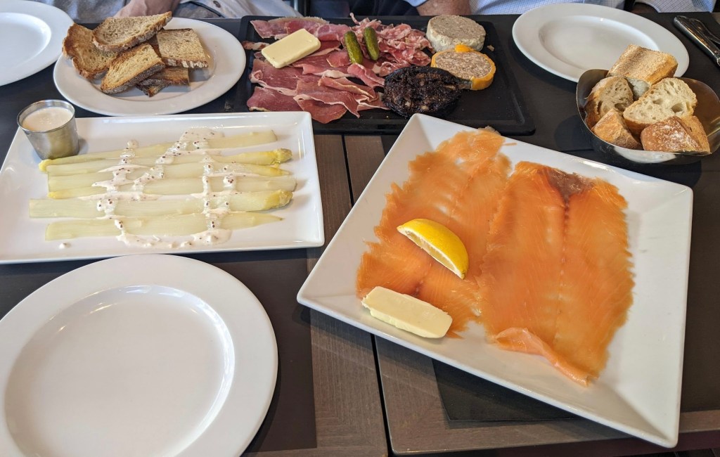 Back on the BBus and a tour of the city for an hour and a half. We got off at the Eiffel Tower and walked through the 7th arrondissement to soak in the flavor of Paris. We stopped at an outdoor cafe and had a great lunch sharing three platters; one of white asparagus with a light mustard sauce, one with an assortment of meats and pâtés and the last with smoked salmon. Simple, great, tasty.