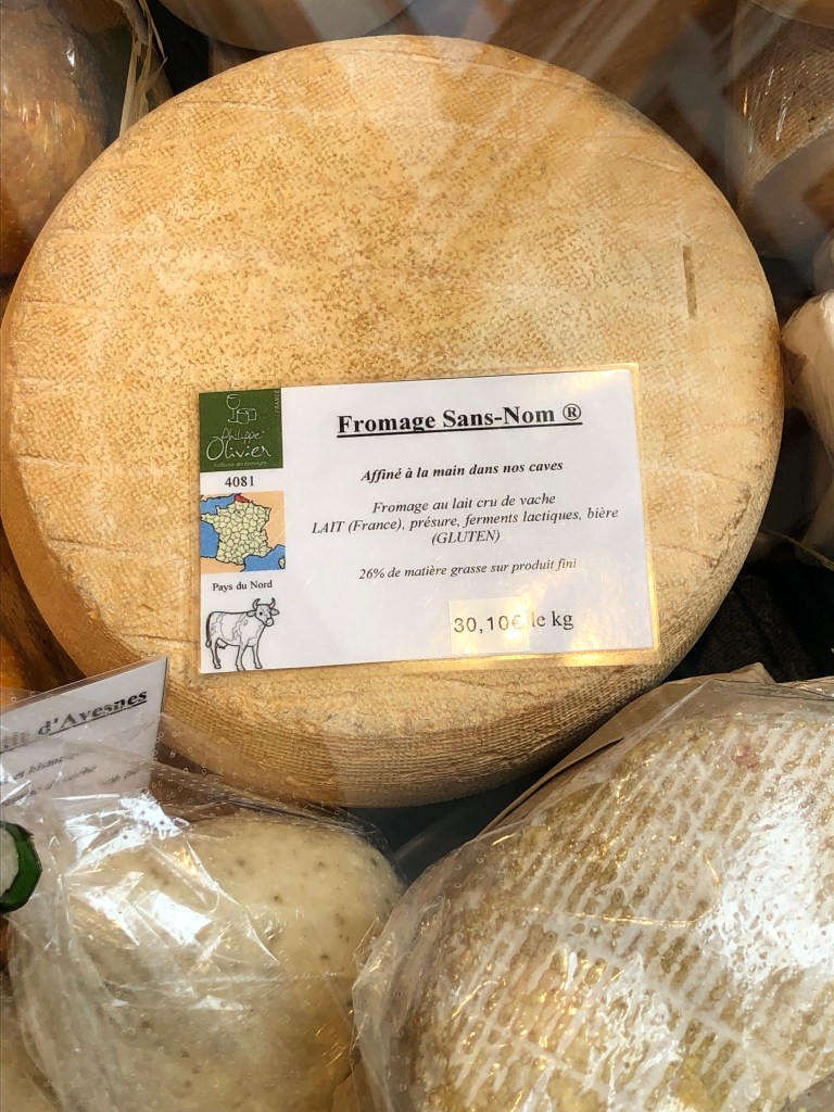 It was a very interesting exercise for both sides and each shop recommended a different comparison to Jack cheese. Thibeaux, at the first shop, said that the acidity was interesting and that he would be hard pressed to match it. His choice was La Marotte de Brebis. which was similar but stronger in flavor. The next, Pierre, told us he’d read recently that in the U.S., Vermont has established caves to create raw milk cheeses, which has upped the U.S. cheese making game. He went on to say that American cheese makers were beginning to win global awards for their cheeses. He has established a relationship with British cheese makers and he carries some of their products – most notably their hard cheddars. He was currently working on an American cheesemaker connection, to include a line of their products. He was interested in the taste and the softness combination and his choice was Sans Nom (No Name – made by a cheese maker for himself) which had more bite than a Jack.