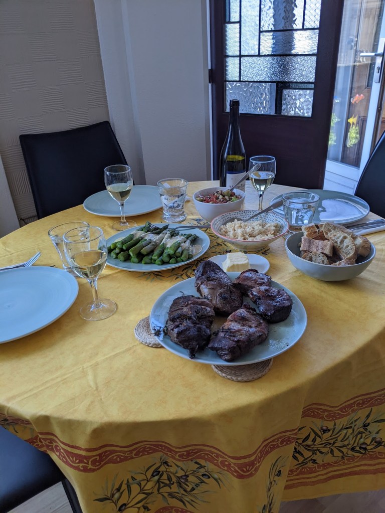 Regarding food, overall breakfasts are Greek yogurt with, on the side, fresh blueberries, nuts – then because we have a guest, cheeses, salami’s, hard boiled eggs, croissants and baguette. Lunch is a variety of salads and of course, baguette. Dinner is a protein, veggies and – wait for it…. baguette. The dinners we planned are our favorite dishes geared to have a different meat each meal; chicken, fish, pork, lamb – rather easy but tasty. We made butter braised lamb chops, herb infused duck, a pork loin braised in milk. During the visit here, K not only sampled the standard Lille dish of Mussels and frites and beef carbonade, but also a street vendor’s warm waffle with chestnut butter, fresh croissants, fresh baguettes and tasted a variety of wines.