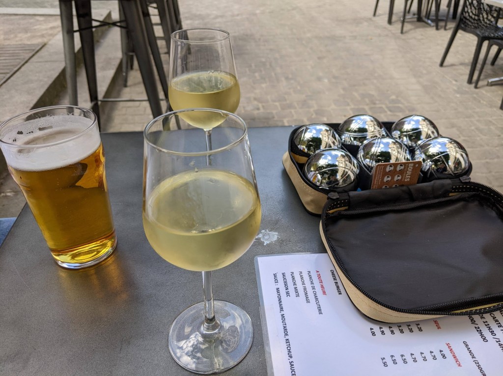 On the last full day here before her return, we made one last trip for souvenirs and played Pétanque at the park around the corner. I had given G a set of Pétanque balls (known in Italy as Bocce) for Christmas and as the weather was still beautiful, we decided to give the set its maiden voyage. We called our neighbor, Audrey, and met at a corner café which has a suitable outside area to play. Sipping wine, enjoying the sun, and working out the rules, we played a few games before folding. It was a nice way to spend time together.