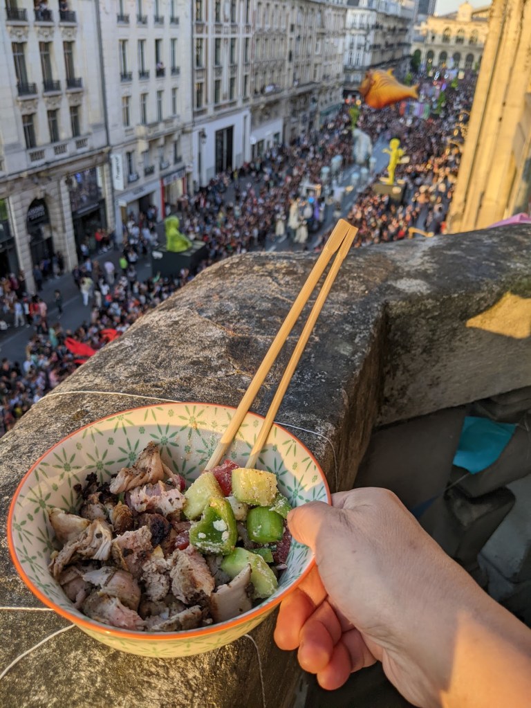 Back home to rest before eating a Greek salad to go with the lamb chops G cooked. The parade started at 7:30pm and we watched it wind down the street past our balcony. Loads of interesting costumes and the weather was utterly fantastic. We ate the lamb and salad while watching the whole thing. Fireworks started about 9pm and could also be seen from our balcony.