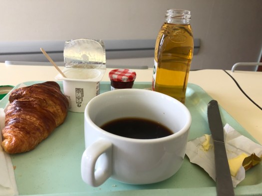 G had to have a procedure at the hospital, where they use dye to check the arteries for any narrowing. It was the first major treatment we’ve experienced and he was a bit nervous. It made for a long day as we arrived at 7:30 am and left at 3 pm. I was stuck in the lobby because they wouldn’t let me in any further, despite my vaccine certificate. They even didn’t want me IN the lobby but I refused to go home. Three terse exchanges with the door guard of “Non” – “NO I’M NOT LEAVING” – NON – NO – NON – NO. And finally after a face stare down, he pointed to a chair where I would not be out of his sight and said – THERE! STAY! I thanked him politely and did just that. G was a floor apart. He was able to use his phone at the beginning and at the end of the procedure. We were texting each other information, including pictures of where we were situated. They served him a lunch later, which he sent a shot of and I sent a picture of what I’d packed for myself – strips of ham, strips of cheese and walnuts. He had coffee, small baguette, croissant, yogurt and apple cider. Very nice, he said.