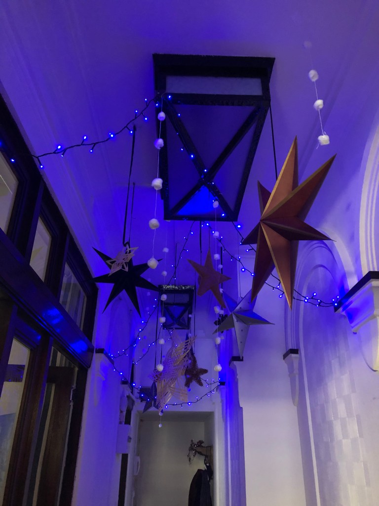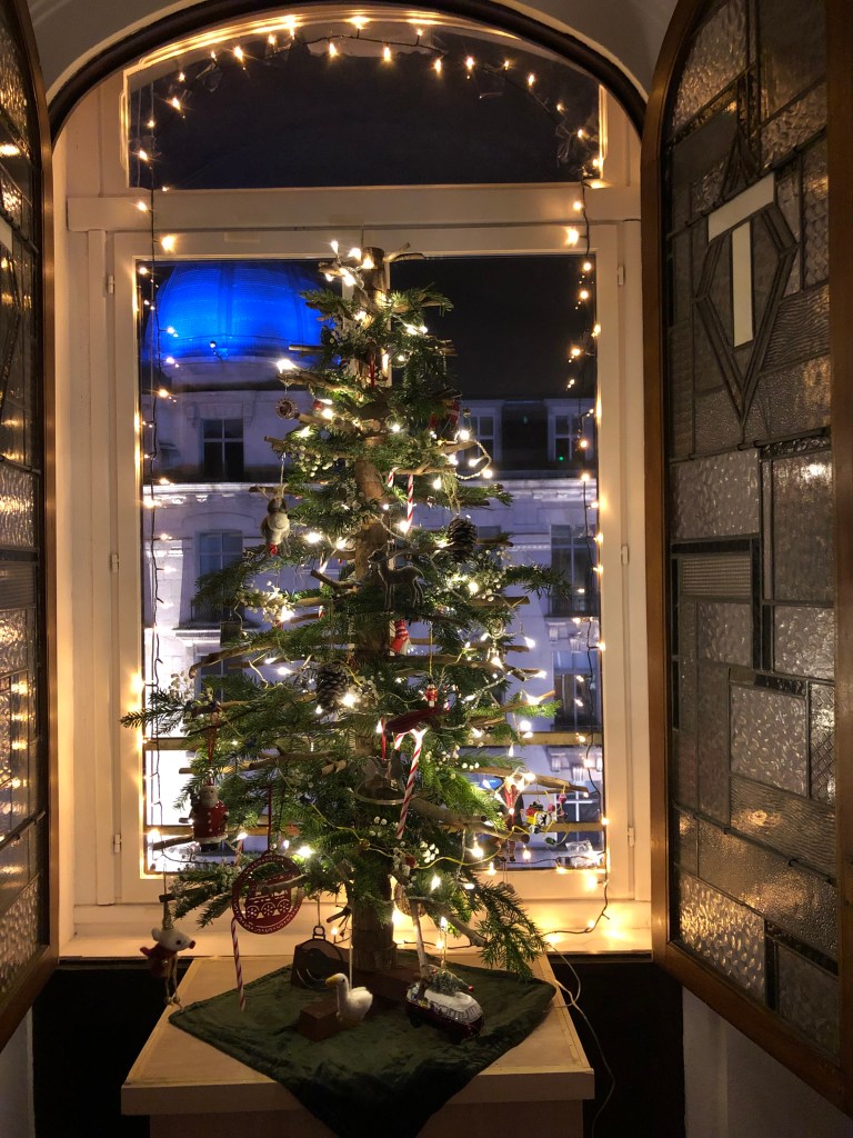 I decided to make star sugar cookies, although it was a bit clumsy because our mixer died a month ago and the food processor wasn’t quite as handy. We plan to get a more substantial mixer replacement so that it lasts but haven’t had time to pay attention. After baking, I strung together a bunch of the stars for Fool’s bar – one of our three favorites. We’d noticed their tree was lacking in ornamentation earlier this month and decided to donate. After dinner, we trundled over and while G ordered cocktails, I hung the whole strand on the tree – zig zagging. Remi – one of the owners- made sure to count them. He was going to keep track to make sure none were eaten !! Too funny.