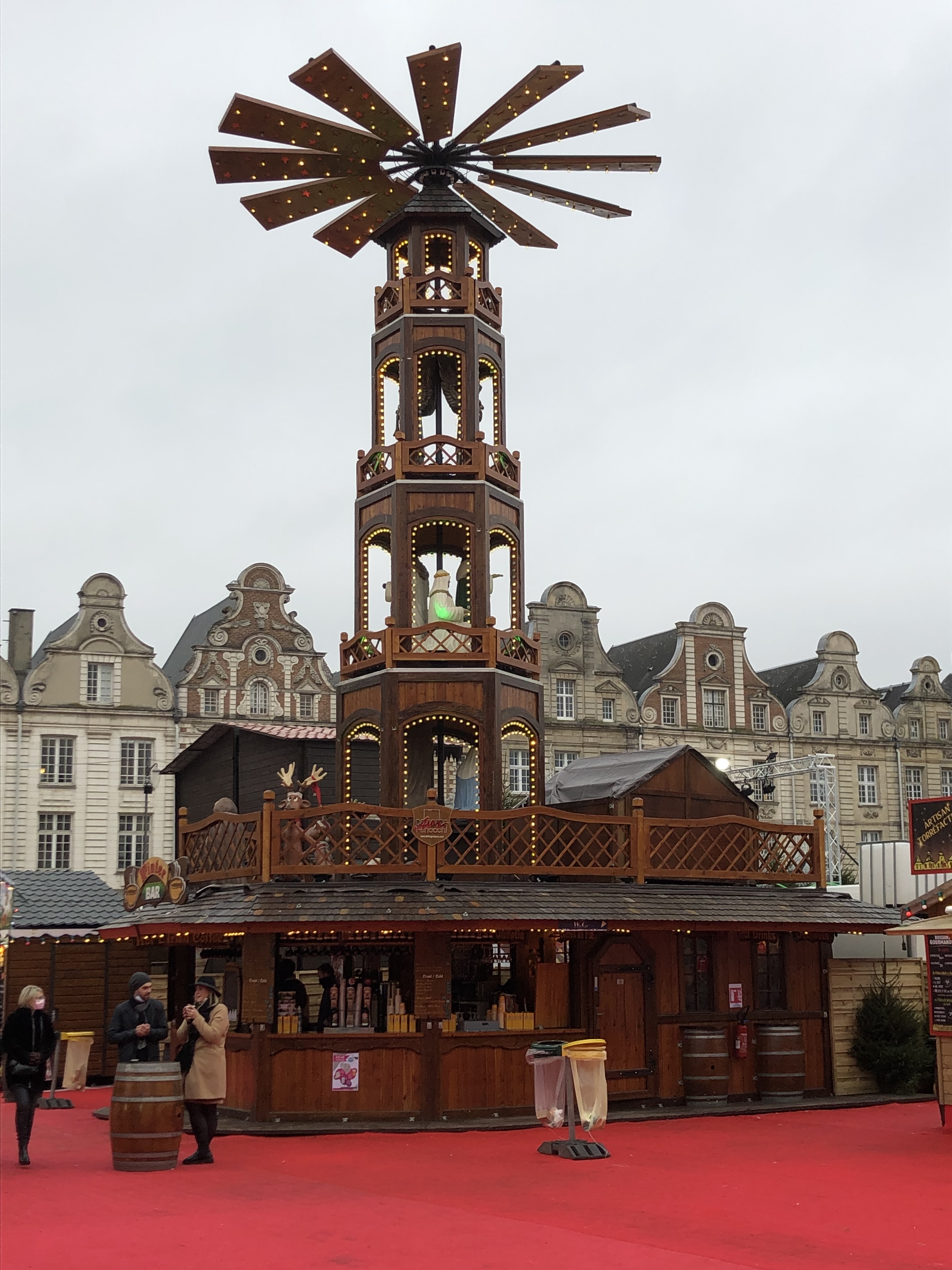 The next jaunt we took, once back in Lille, was to Arras in the late afternoon to see their Christmas Market and had a great time of it. Fortunately, despite predictions of rain, it only drizzled some and sleeted a little. By timing it for the late afternoon/early evening, we were able to see it’s lights before returning home. It was weird going into the market as they had divided the lines for females and males. It turned out because they were not only checking bags but giving everyone a body pat down, using women for the female line and men for the male line. At every market they had staff checking each entry for a vaccine certificate but this just seemed over the top and odd. Still, the market had all of the wonderful foods; broiling sausages, smoking fish, crisp hot waffles, pastries and soft pretzels – along with all of the holiday gift offerings.