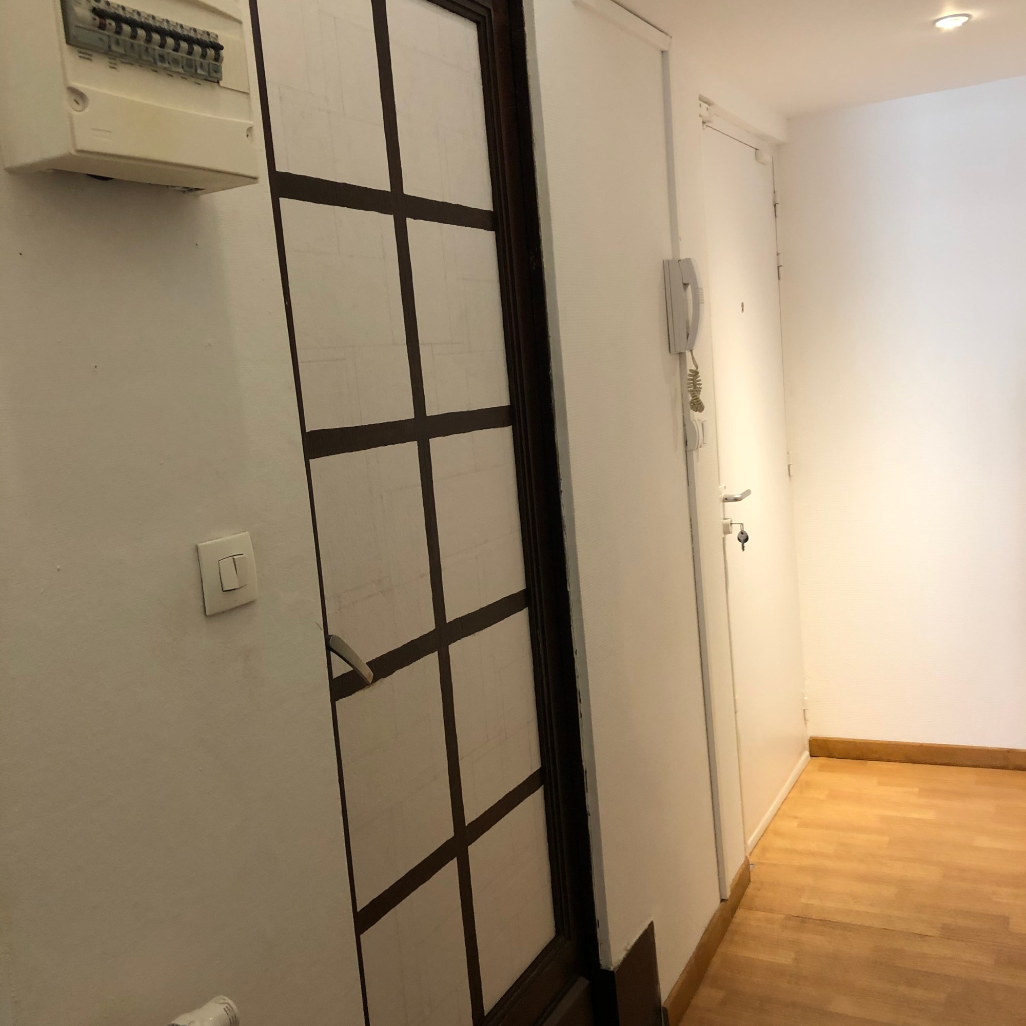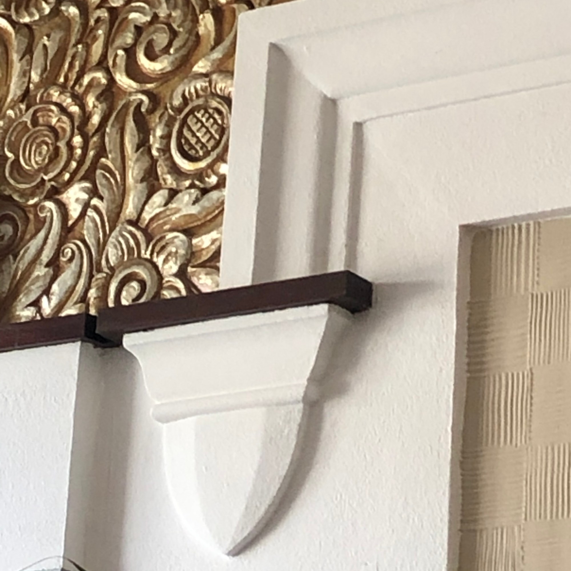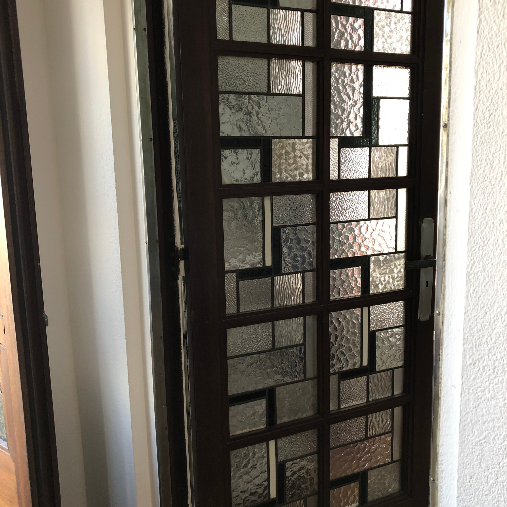 In addition to the kitchen, we’ve had a dozen little home repair projects that have kept us busy. Why bother the landlord when we had so much time on our hands? After ordering online, G installed a toilet paper roll holder and a towel holder in the W/C. He also installed a new shower bar, shower head and bar soap holder in the shower room. I did paint patch-ups, plus I tackled repairing the living room fresco which had suffered water damage in one section some years ago. I decided to begin a new project to faux paint the W/C door to match all of the other doors in the apartment, which are constructed of stained/leaded glass panels. Here are shots of the repair and an existing leaded glass door and the W/C door faux project, in progress.