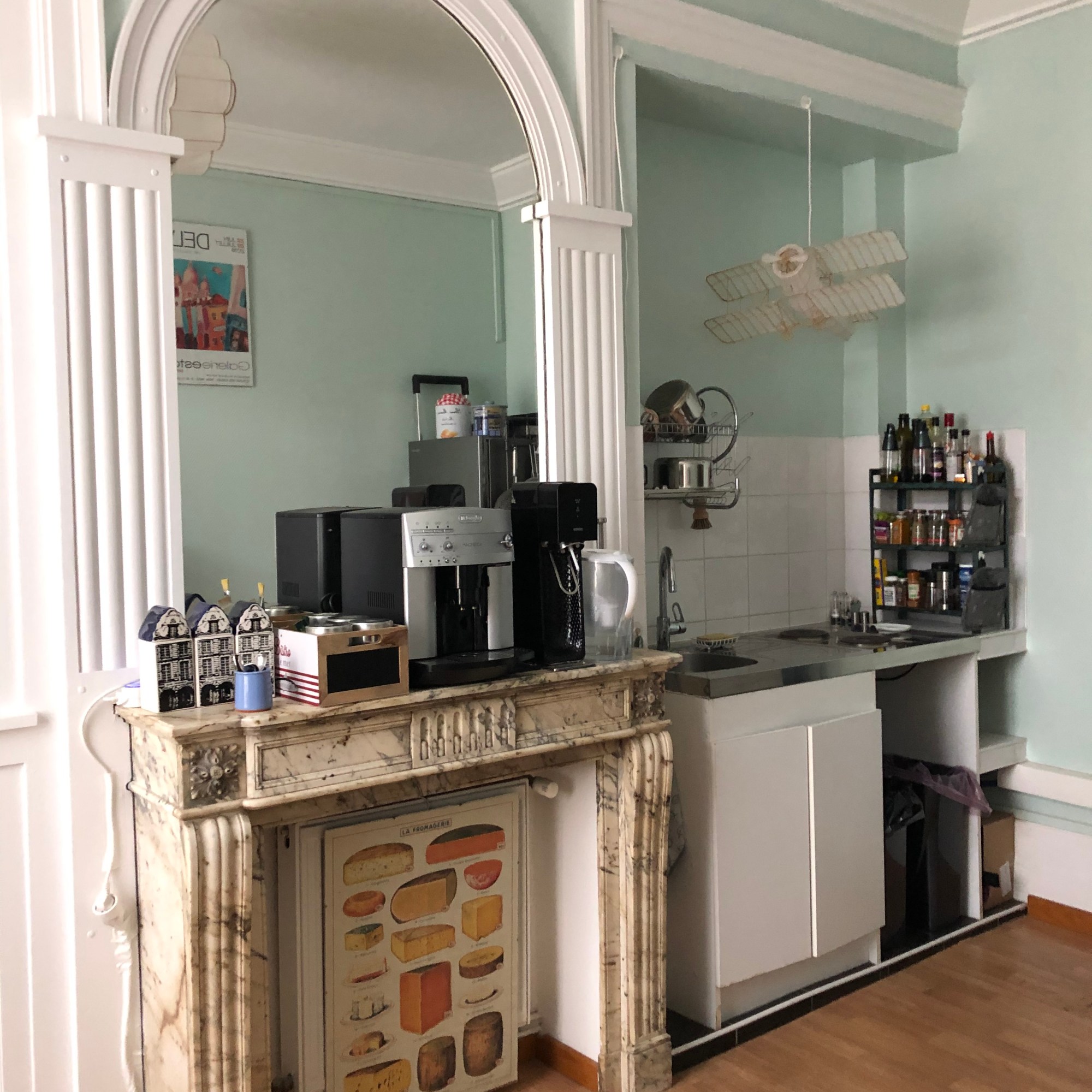 The finished effort yielded an L shaped full counter with double sink, four burner stove and an oven and the effect was incredible. Please pardon all the French translation stickers on the refrigerator. You can see our new bikes tucked under the counter on the end.