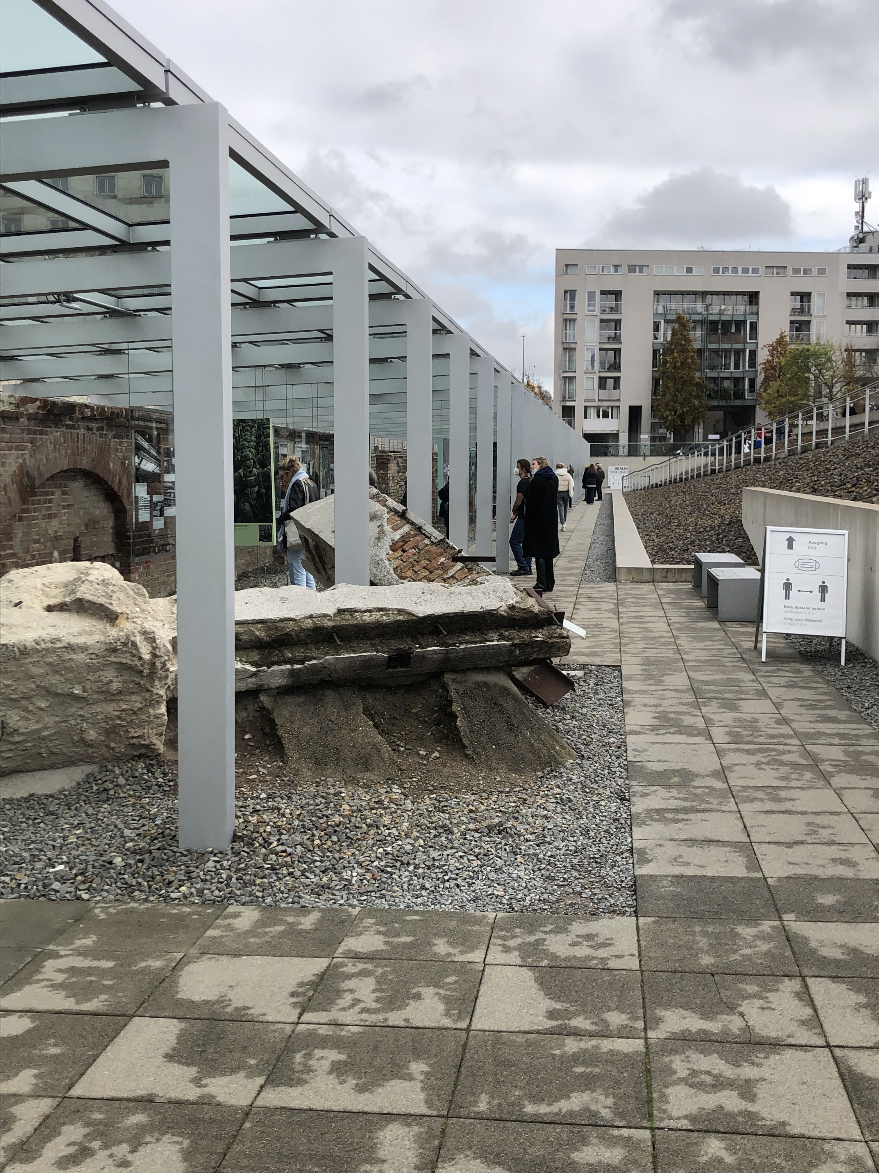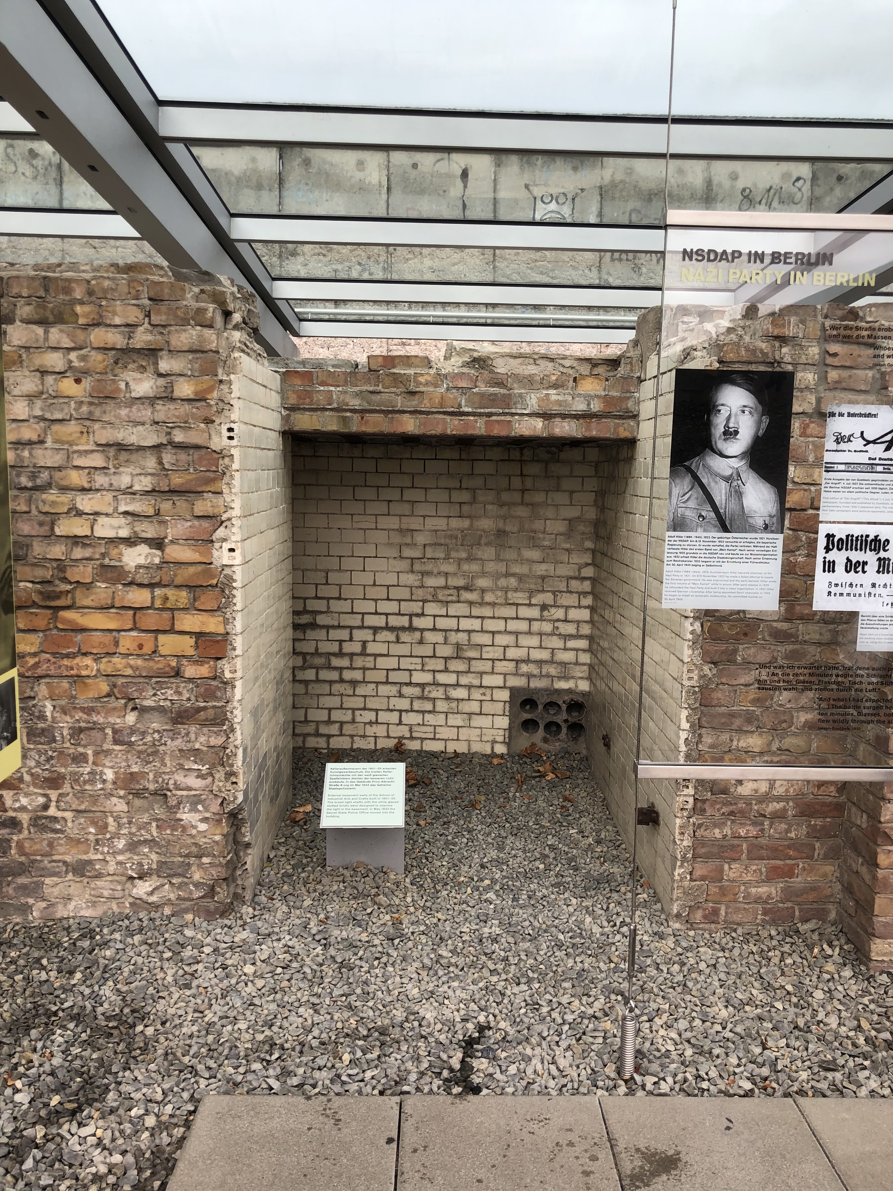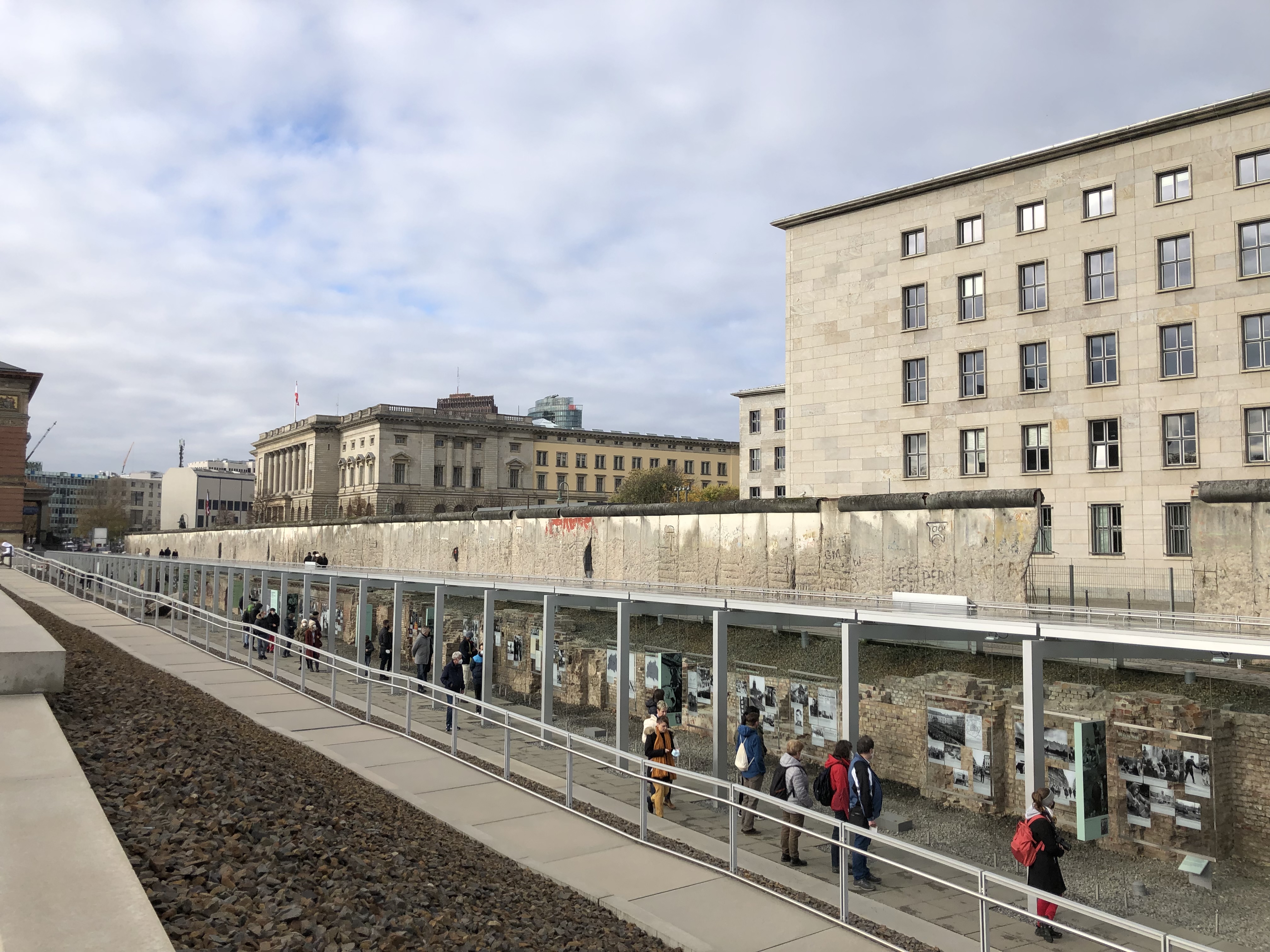 We visited a lengthy exhibit – Topographie des Terrors – of basement walls of the School of Industrial Arts and Crafts built in 1901-1905. The broad light shafts with the white glazed tile slotted bricks were designed to improve the basement light. In May 1933, the Secret State Police Office moved into the building. Portions of the Berlin wall were built above the basement walls.