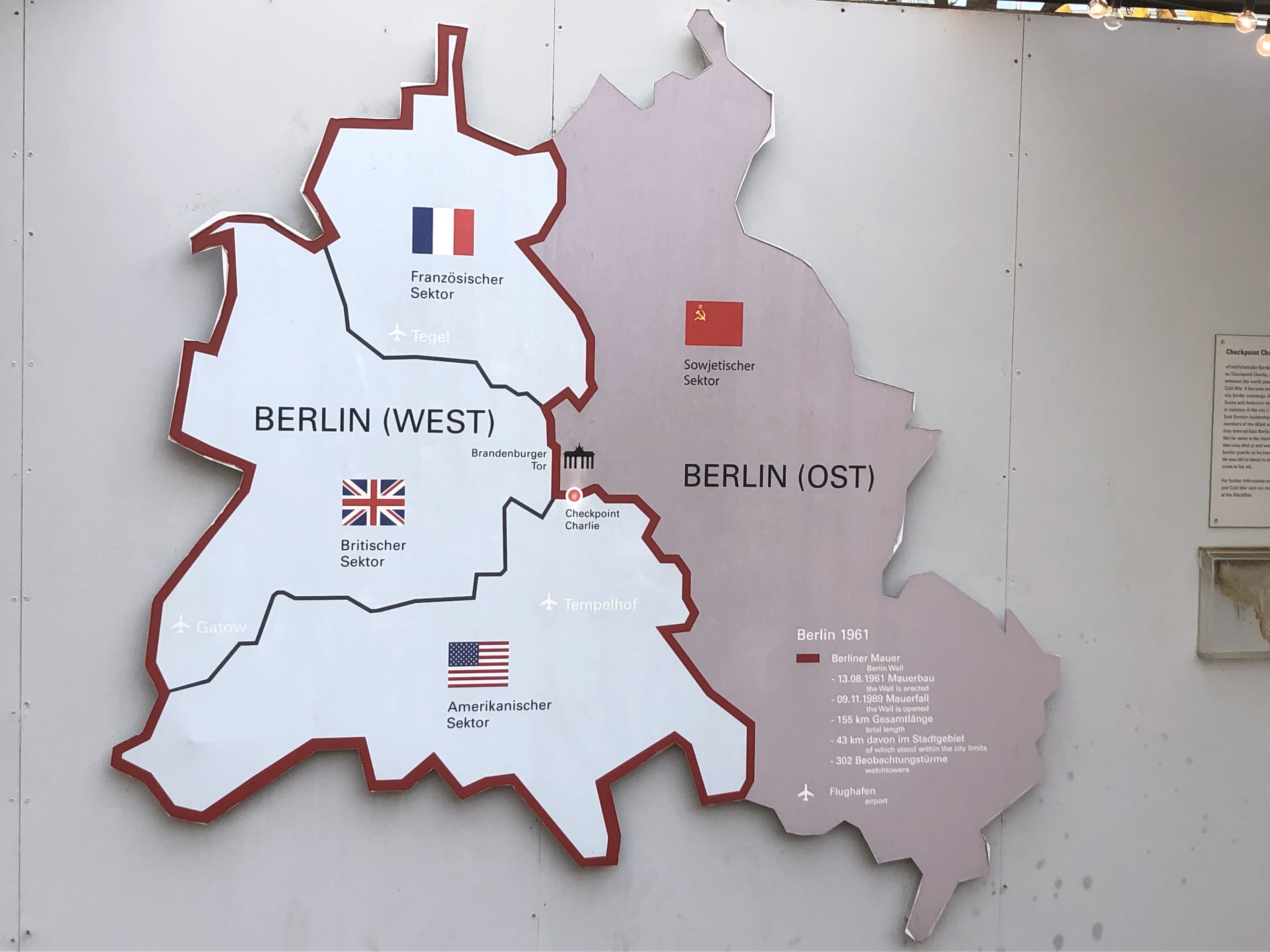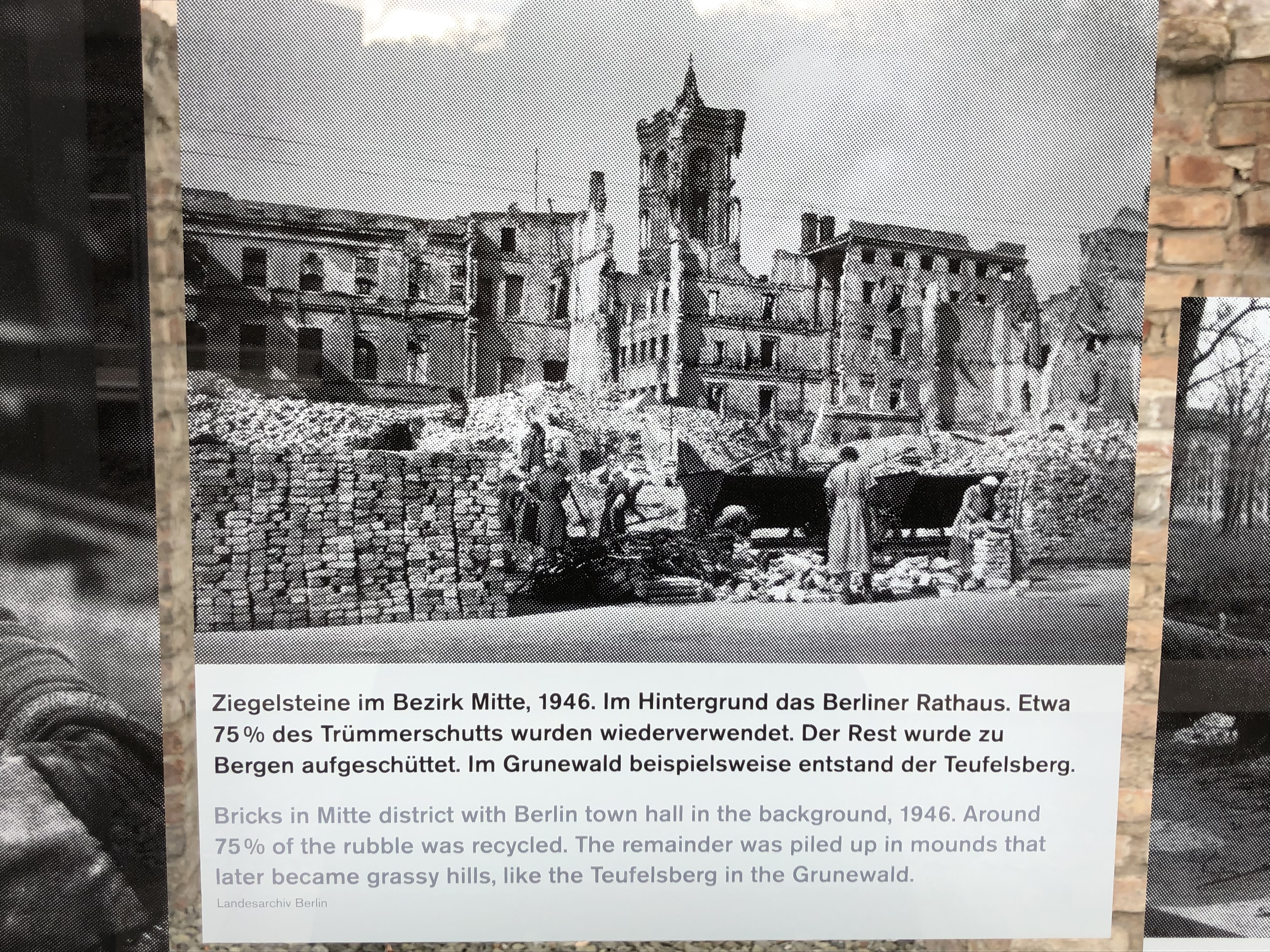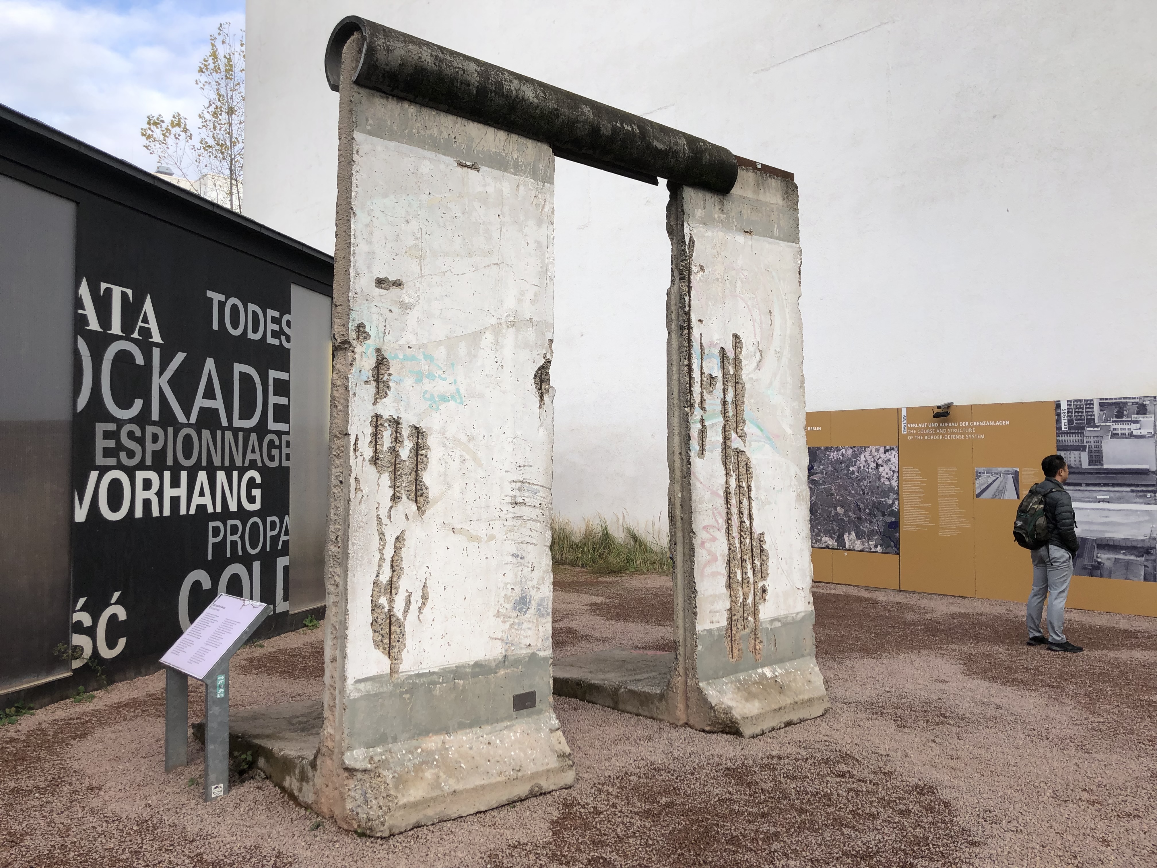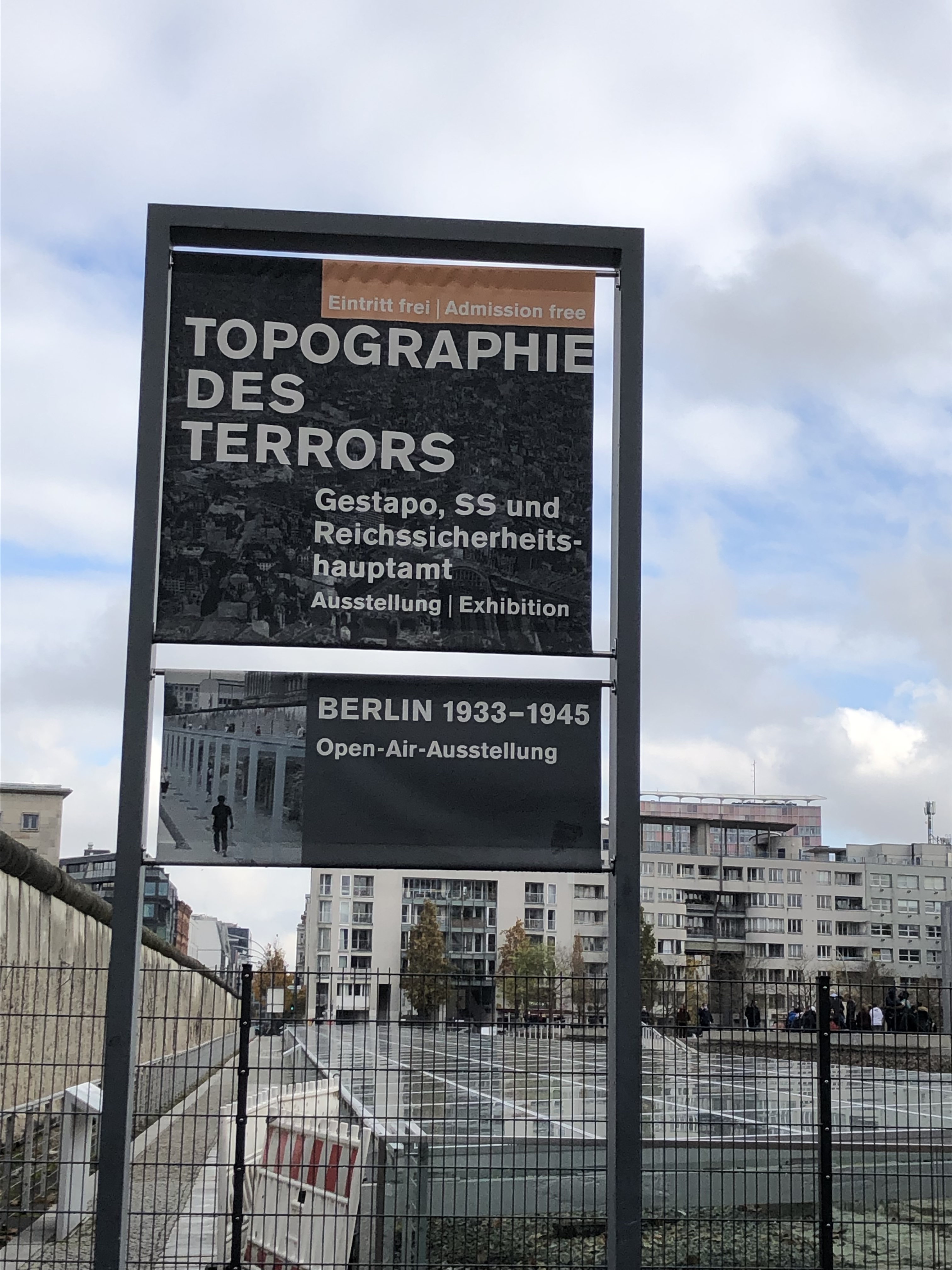 We visited a lengthy exhibit – Topographie des Terrors – of basement walls of the School of Industrial Arts and Crafts built in 1901-1905. The broad light shafts with the white glazed tile slotted bricks were designed to improve the basement light. In May 1933, the Secret State Police Office moved into the building. Portions of the Berlin wall were built above the basement walls.