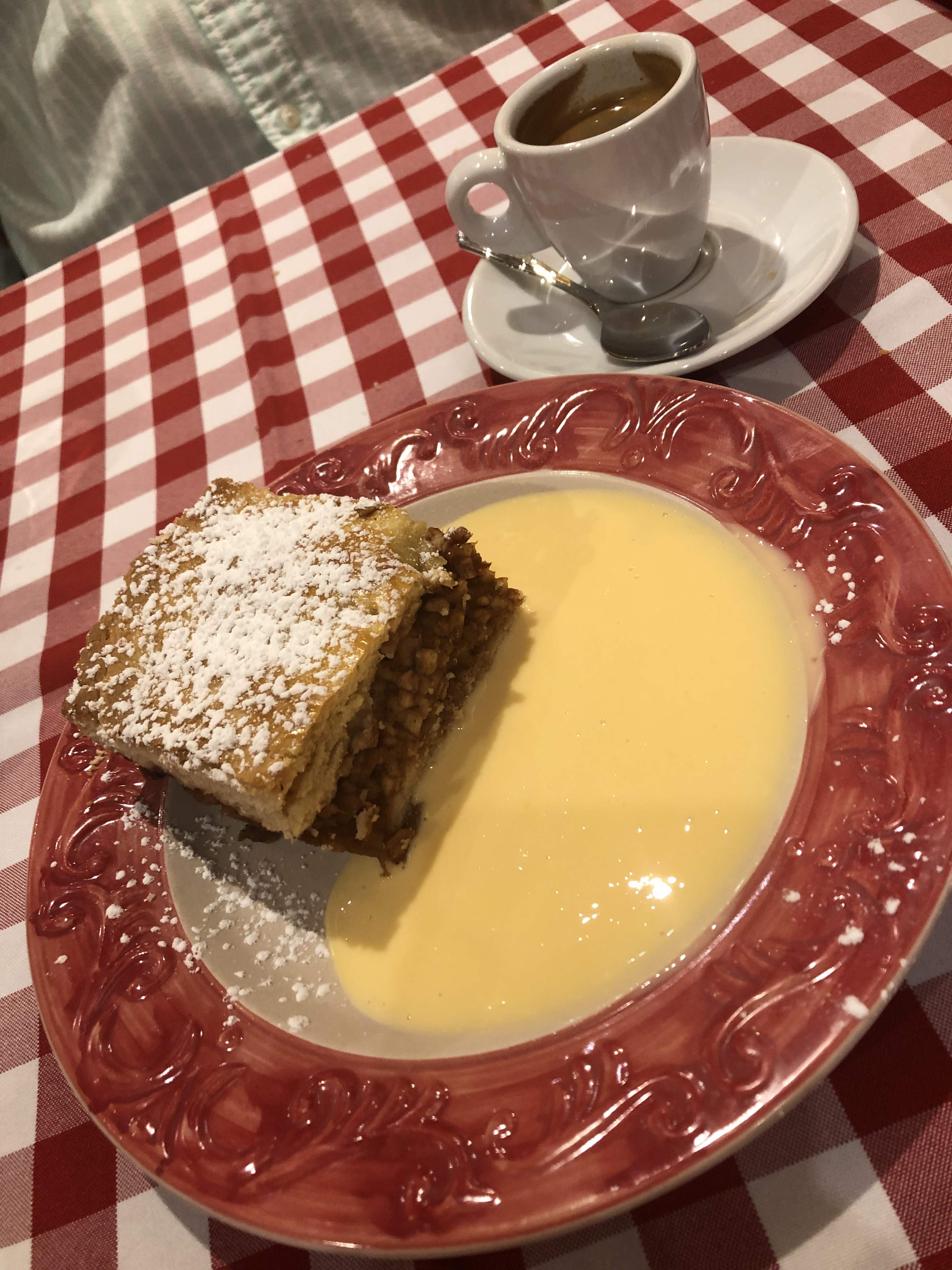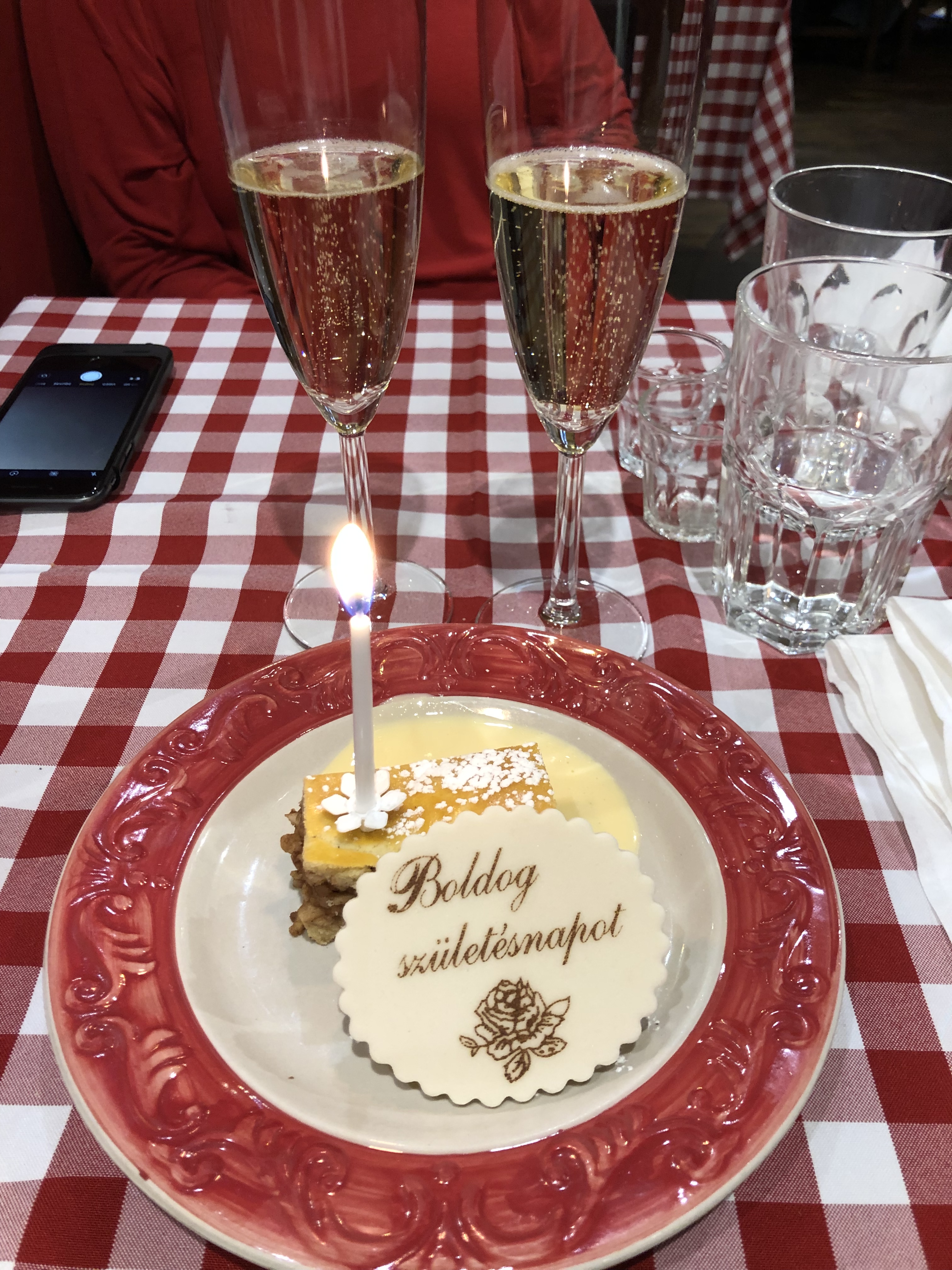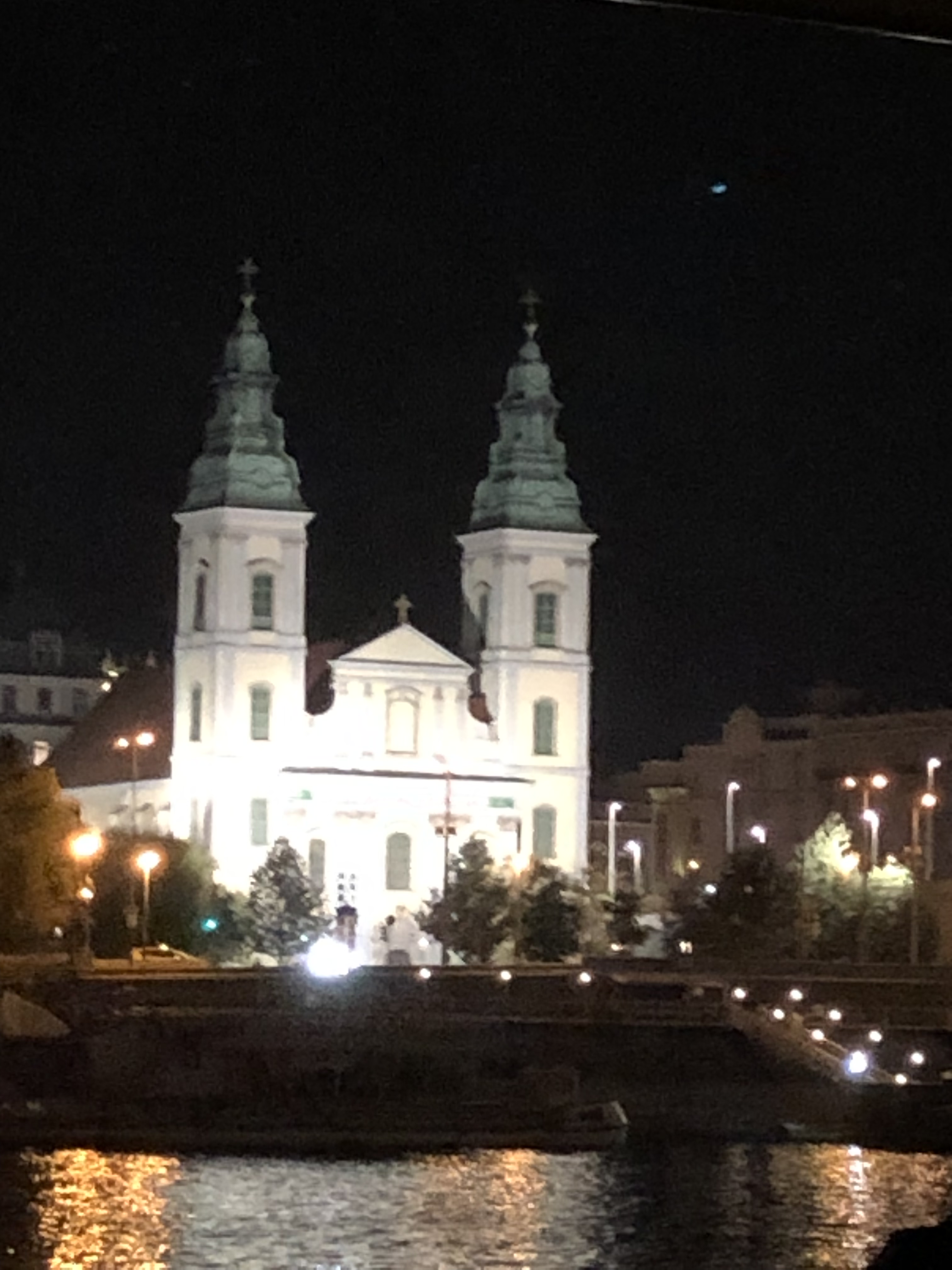 When it returned to the Pest side, we got off and did more walking. Got hungry and found a delightful little restaurant serving the Hungarian food we sought. Great, small staff, terrific service – it was packed and we were lucky to get their last little table before they cut off incoming clients. I had their stuffed cabbage and G had a pork dish – pork strips braided with bacon in a paprika sauce. Both dishes were fabulous, as was the wine. Didn’t have a single disappointing wine in Budapest. We shared an apple pie, which was square, with a top crust and it was also very tasty. Somehow in our conversation, the waitress came to understand that this was a birthday trip for G, so after we finished up, the restaurant’s lights dimmed and she came out of the kitchen with another little piece of apple pie with a lit candle. The staff sang happy birthday to G and customers all joined in. We were presented with two small shots of Pàlinka, a Hungarian fruit brandy which was very fragrant, flavorful and potent. The whole experience was so touching and really put a nice zing on the day. More walking and then even more walking, before turning in.