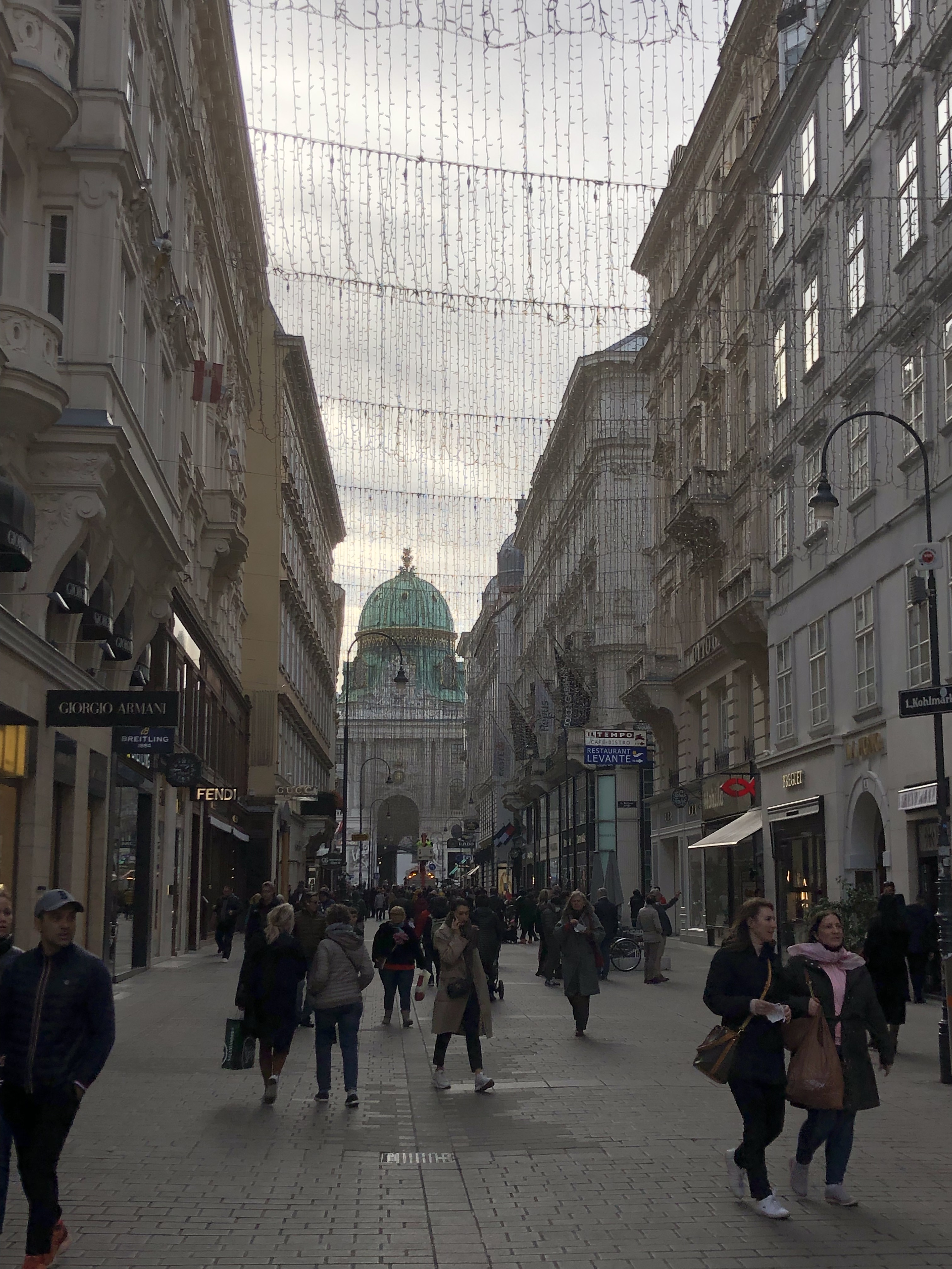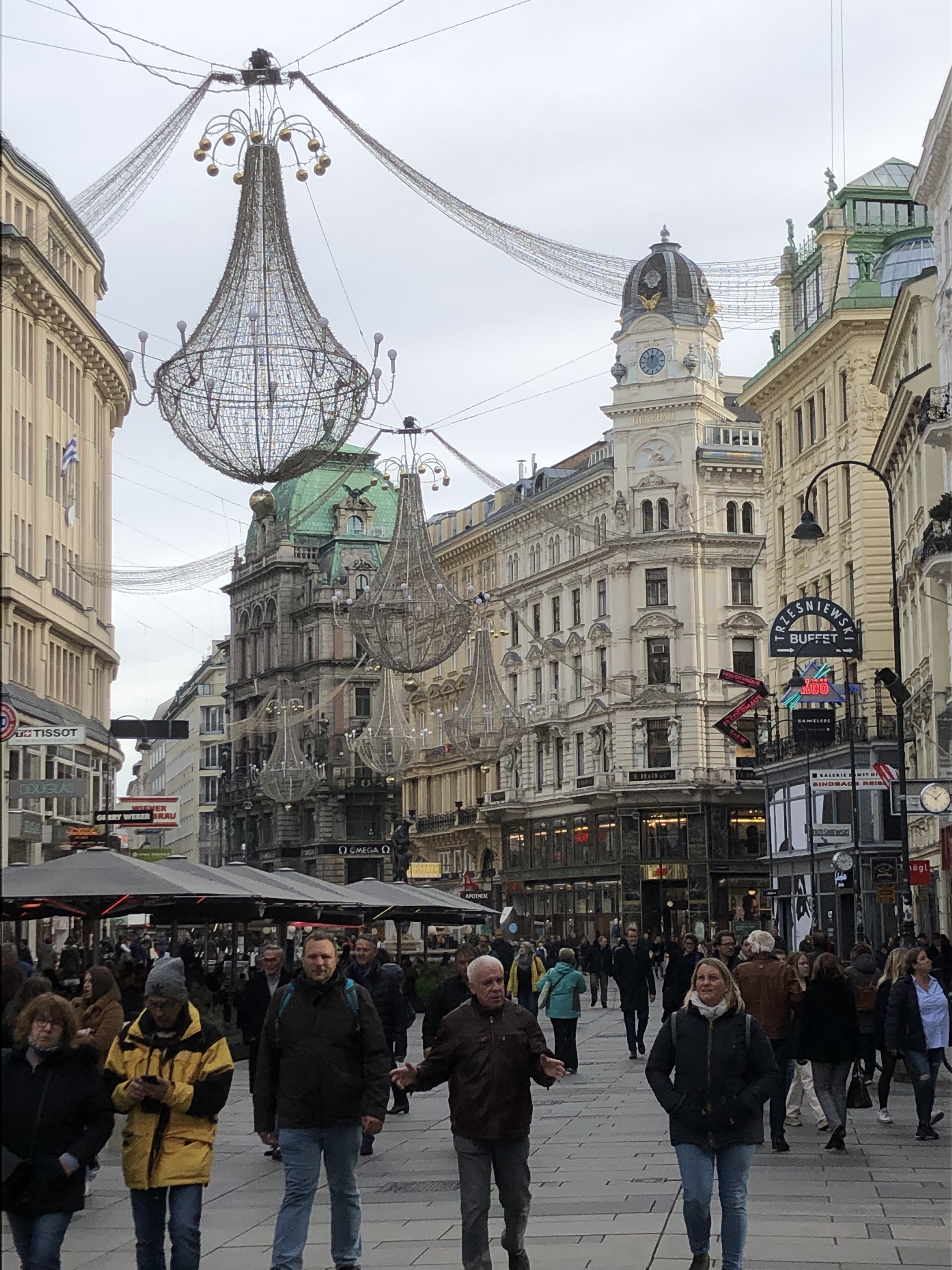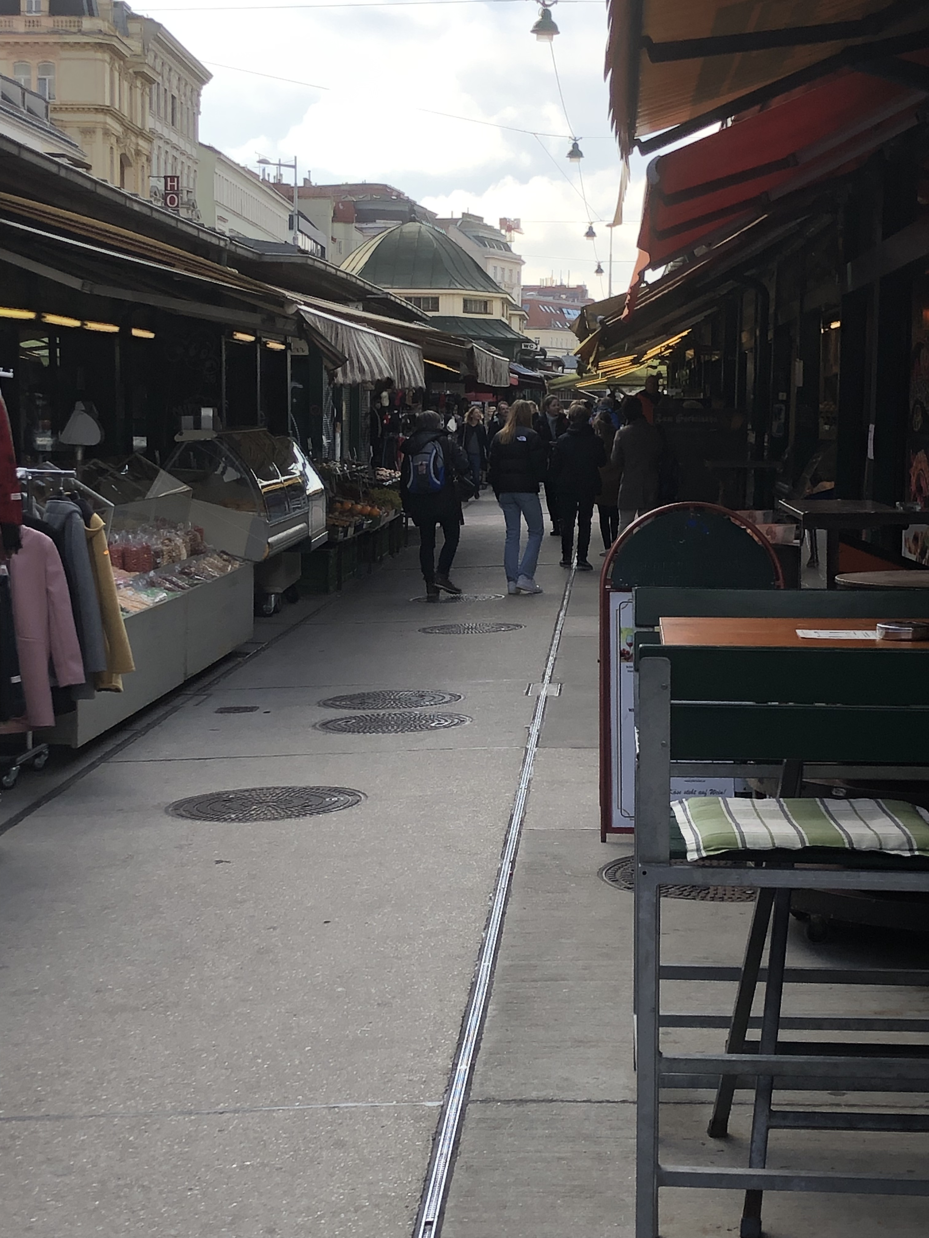 The weather was cold and rainy so this particular Hop-On suffered from fogged windows and we couldn’t see anything that we were hearing about. So we got off and walked EVERYWHERE. We started at a vast outdoor market that had every ethnic food you could want, every spice and cooking ingredient, every cut of meat, fish or produce. There was one vendor that had at least a dozen different kinds of hummus on display. We stopped to sample an authentic strudel. It was Apple Strudel and nothing like we’ve had before. The strudel we’ve eaten has always had a hearty crust – a lot like rugelach. But this was a light crust – lighter than even a great croissant and it made for a delicious, delicate dessert.