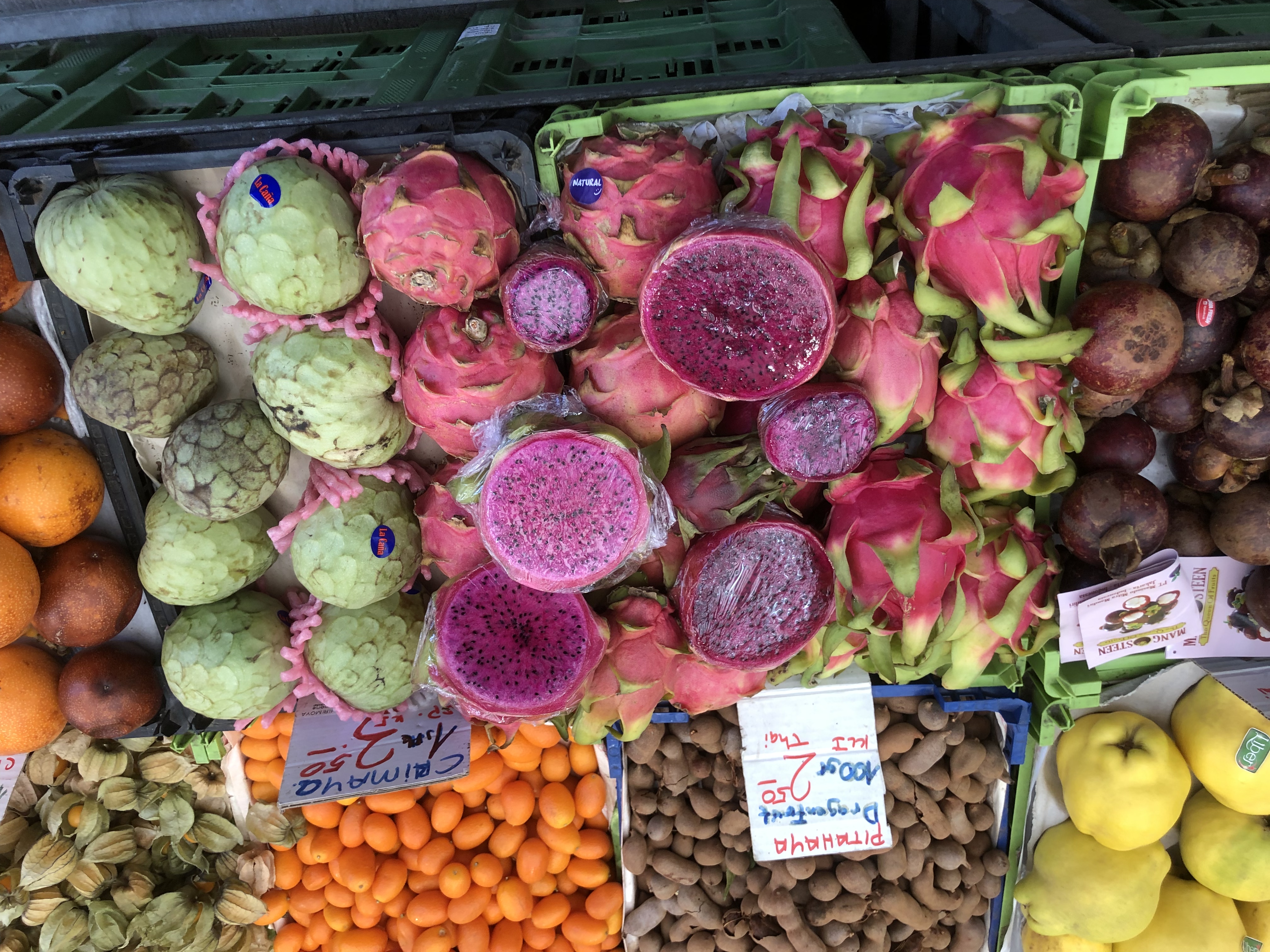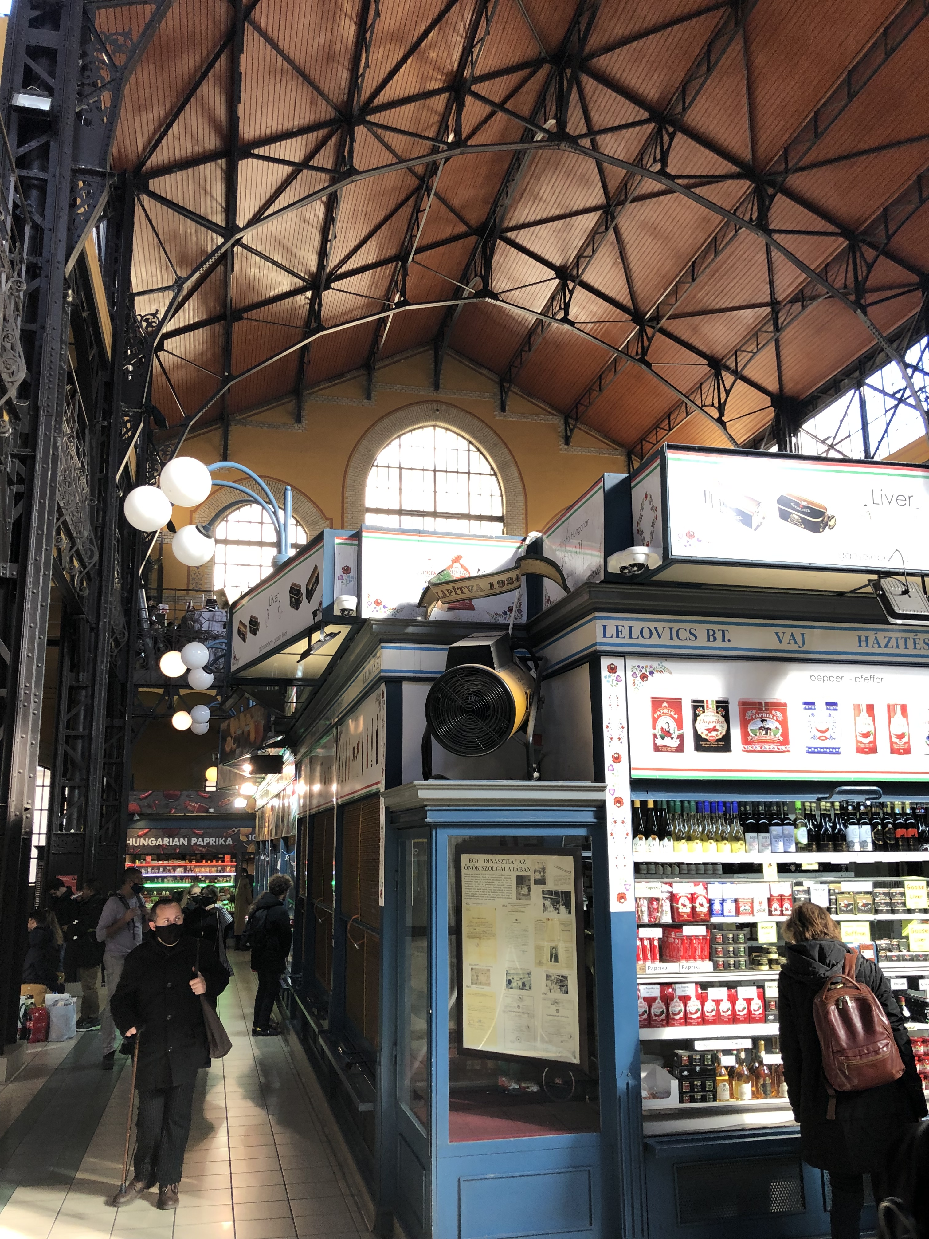 It is a two story warehouse stuffed with individual vendors AND tourists. Emphasis on ‘Tourists‘. The crowd was so thick, it reminded me of the annual Lille Braderie, which attracts over 2 million people over 3 days. Well, maybe there weren’t 2 million in the market, but it certainly felt like it to me. A view from a set of stairs showed a sea of heads – pretty daunting. The downstairs had the produce, meats, spices and wine vendors. The upstairs had the tourist souvenirs and the restaurants – that is where, inconceivably, even more people were stuffed. Trying to make our way through the vendors, shoulder to shoulder with other people, wore us both out rather quickly and we did not stay there to have lunch. We did buy some small sweet and hot paprika tins for ourselves and small packets of hot paprika for our neighbors. When we finally made it to the exit, I told G that I want a T-shirt that reads: