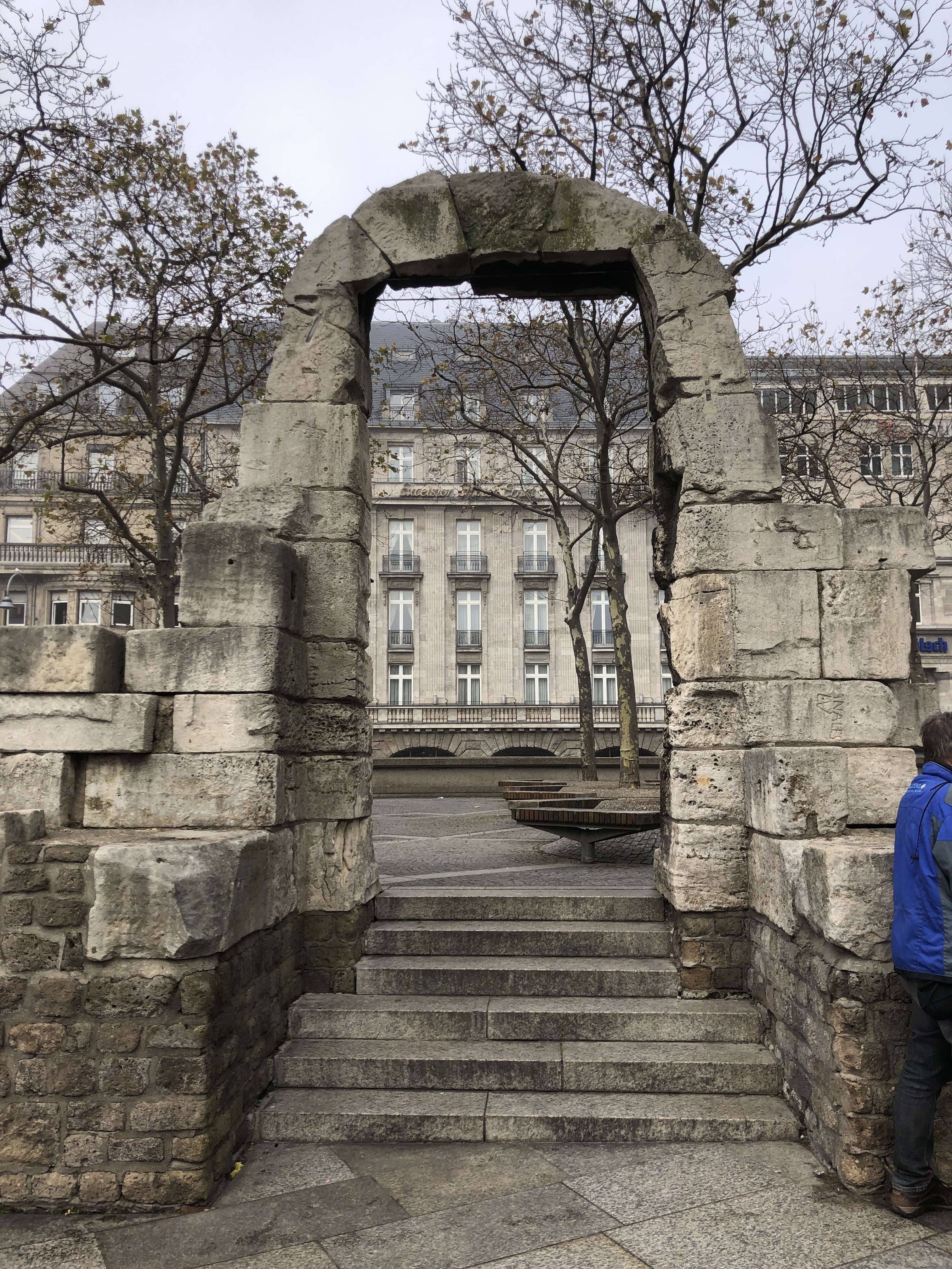 At least no one was in costume, yet. So we kind of fit in. We’re the only ones in wool coats – but I could live with that. I’ll take that OVER a T-shirt and shorts and being barefoot on concrete at 45 degrees. We checked in, dropped our bags, went to the lounge for a light dinner and wine before turning in. The next day was to be 31 degrees to 45 in the afternoon. We didn’t have a hop-on bus so we thought we’d bundle up and walk the city. We visited the Roman north gate when the colony was founded in 50 AD.