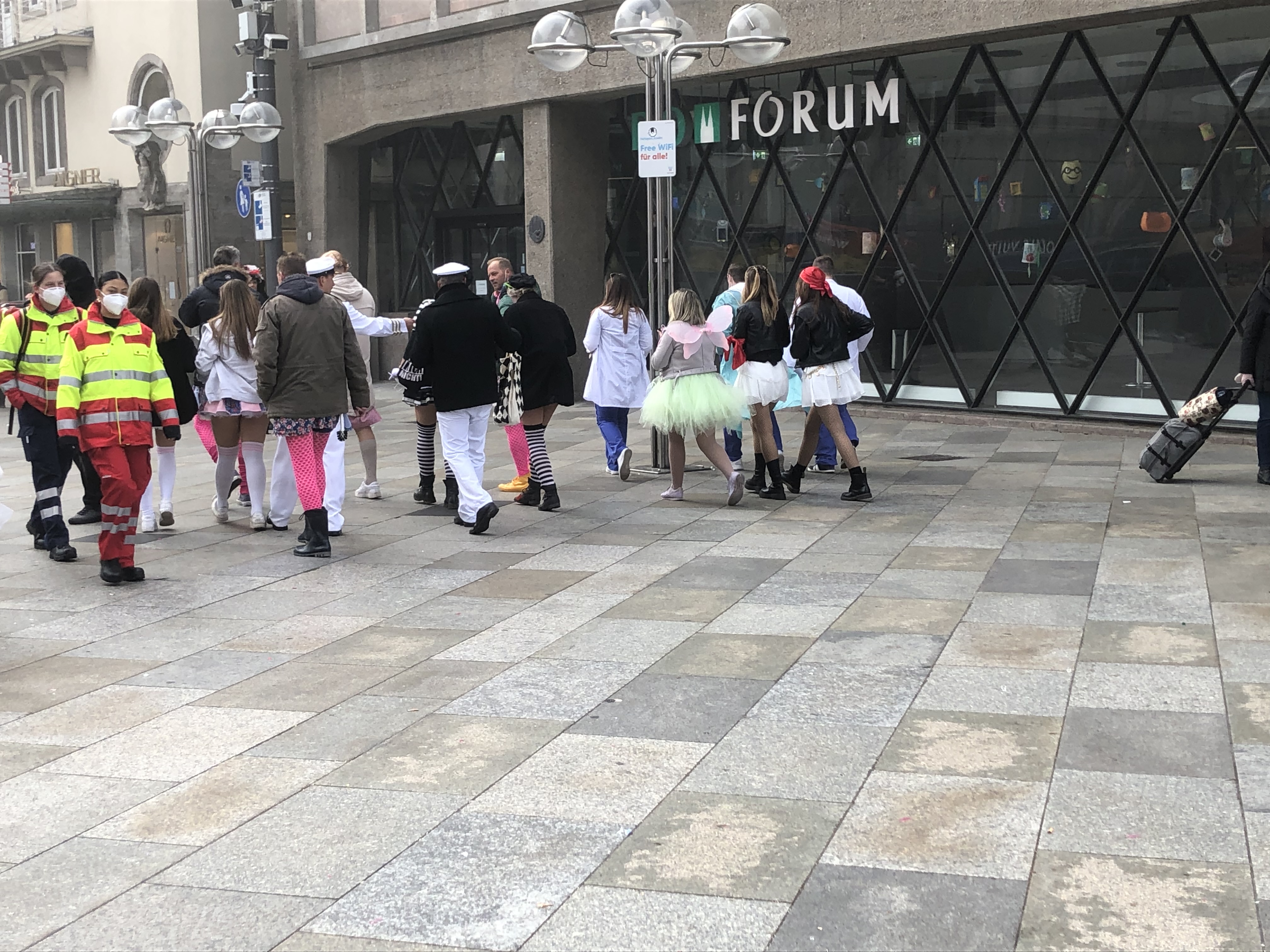 But once again, the plaza was filled with lots of little groupings of students with their luggage, all drinking – some already inebriated – it was 45 degrees and cooling – one fellow was in a T-shirt and shorts, standing barefoot, drinking a beer while on his phone. OK. We first decided that it must be tradition to come off the train, grab something alcoholic and gather in the square before getting picked up or going to the hostel. But then, looking at each other, we started asking ourselves about the date of our first trip to Cologne in 2019. It was the same time of year and as we looked at our calendar, it was exactly to the day we arrived, only this was the day before. This meant that Carnival was the very next day. What luck. And here we are, the two of us standing there, completely sober, 45 years older than we should be, according to the crowd and completely without Cow costumes. Oh boy, oh howdy.