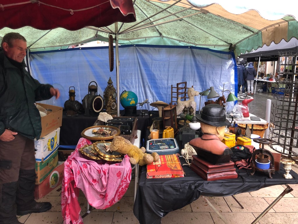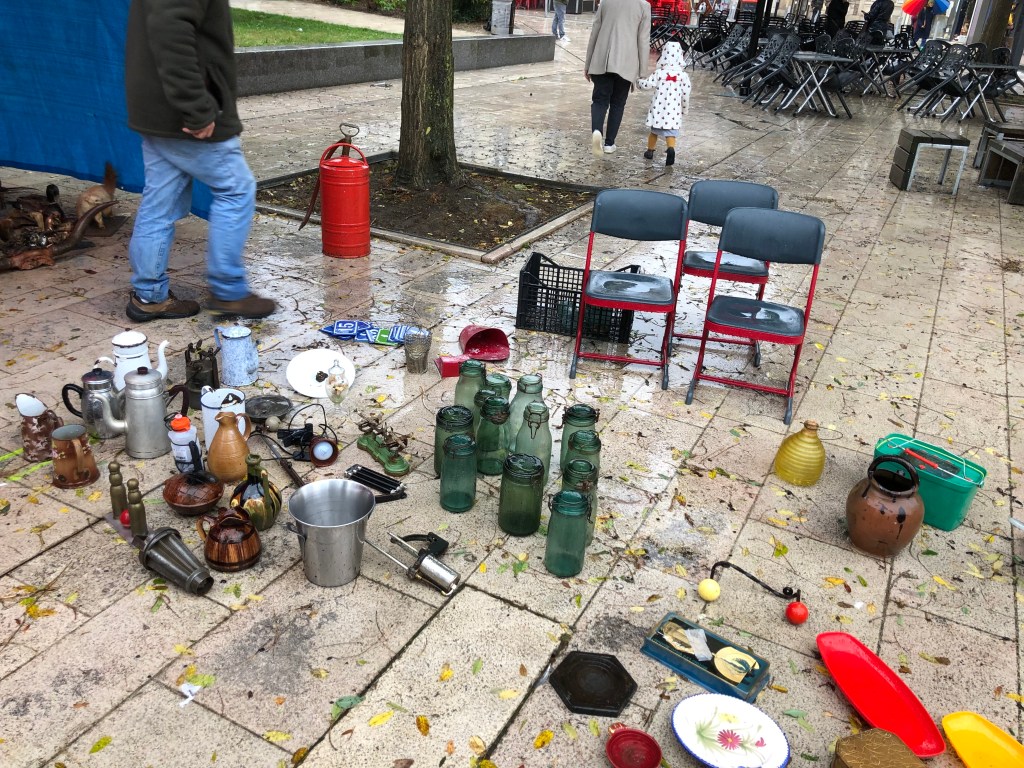 The flea market was amazing. As I’ve said, they have it twice a year and it spreads over 51 streets, it states on the website. We had brought umbrellas because the weather app showed it might rain. Unfortunately it rained alright – torrentially all day. It would have been fabulous if it hadn’t been, but after sloshing around for a few hours, even with umbrellas, our pants were wet up to the knees and the wind had also blown it enough to soak our coats. We stopped at a little pub for a meal and a warm up. Got fortified with beef carbonnade – a nice stew with a touch of nutmeg, over fries. With baguette and red wine, it did the job and we did some more looking before catching the train home.