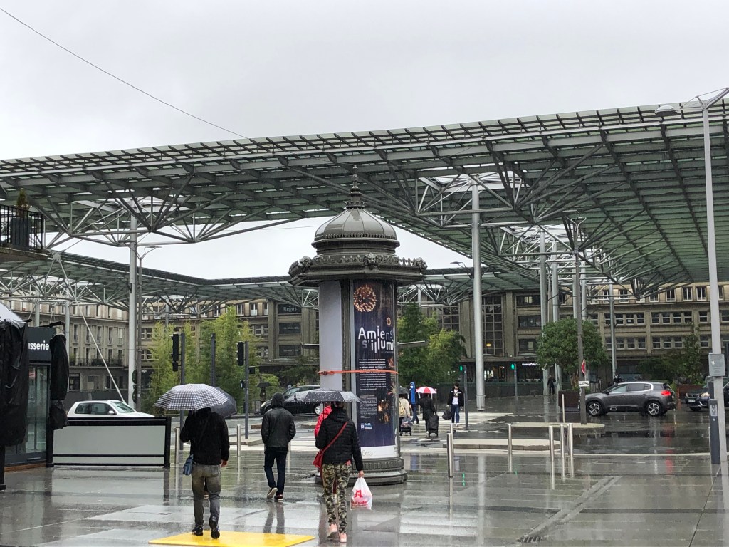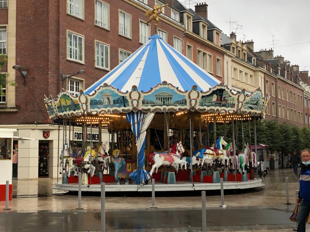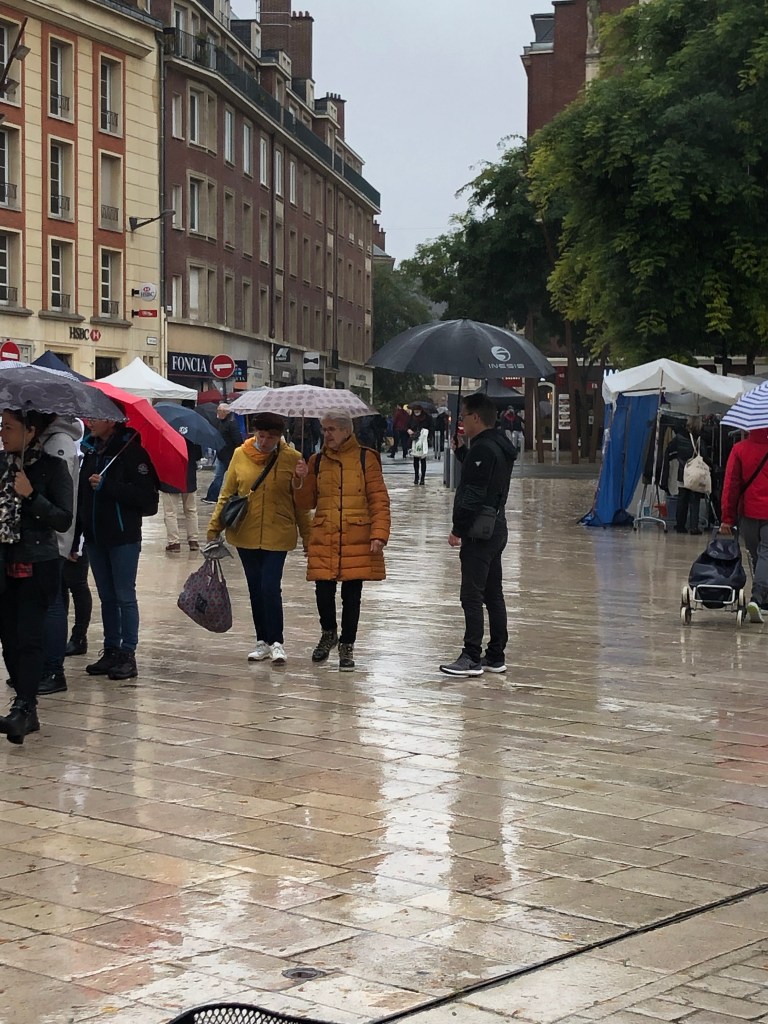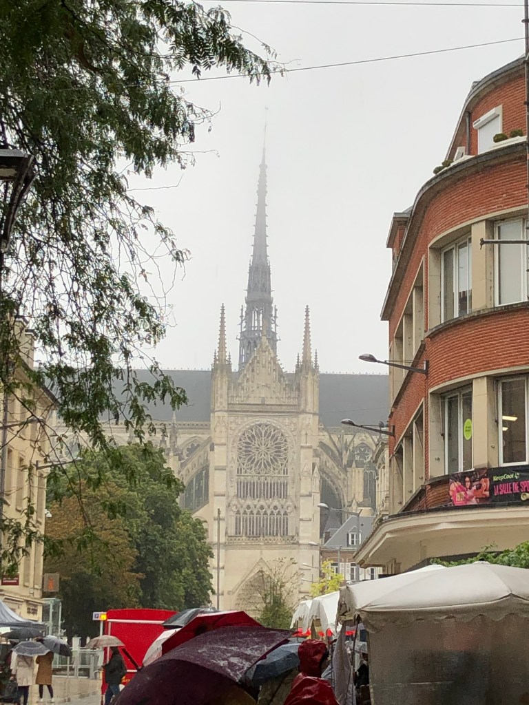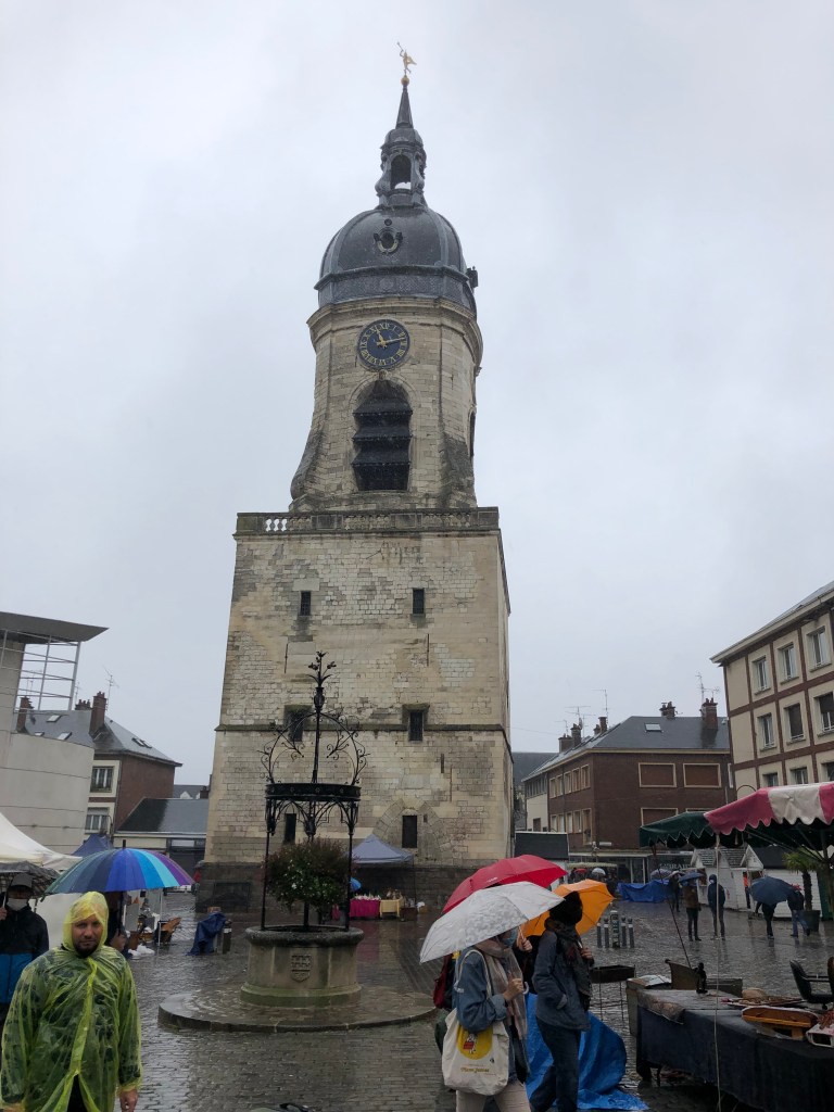 This market had a huge, varied inventory from children’s toys to antique furniture. I might have been tempted to purchase a few things, if the weather had permitted lingering. We mainly went to see if we could find an old cabinet that we could repurpose to cover the A/C unit. Something that would hide it and blend in, like just another wood cabinet. I had made a cardboard box wrapped in holiday wrap when we first got the A/C, but that had gotten worn. We did come across one wood cabinet that we would have been able to use but the seller wanted too much and wouldn’t haggle. If we’d not been so clearly Americans, we might have had better luck. As soon as we open our mouths, the price goes up. So back on the train, we decided that we would add some fold-up rain ponchos to throw into our cart, along with the umbrellas when we see that it ‘might’ rain. Our raincoats would have been overkill if it hadn’t rained or rained much, since it wasn’t cold. Ponchos will be easy to tote, fill in the gap nicely and keep us dry if the need arises. And we found some in town as soon as we got back. The town of Amiens is utterly charming and when we return in December, we’ll be sure to be in weather-appropriate gear.