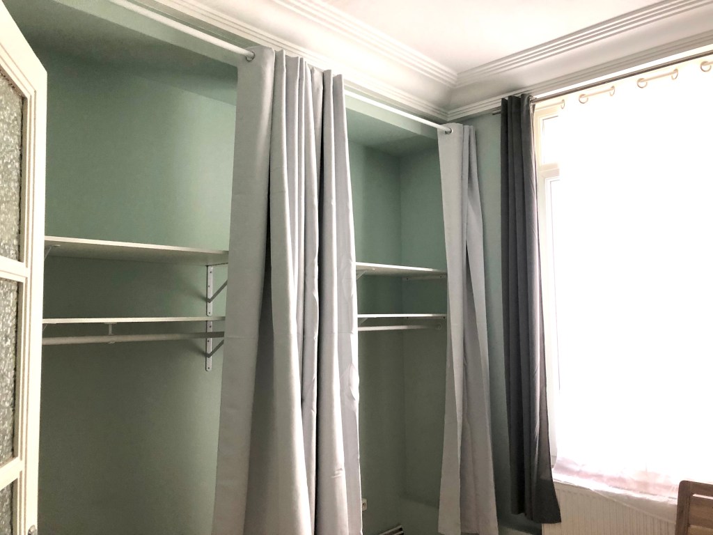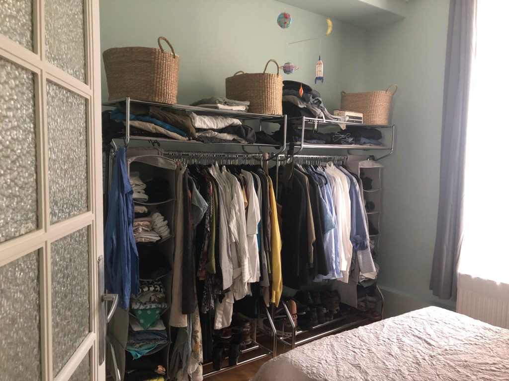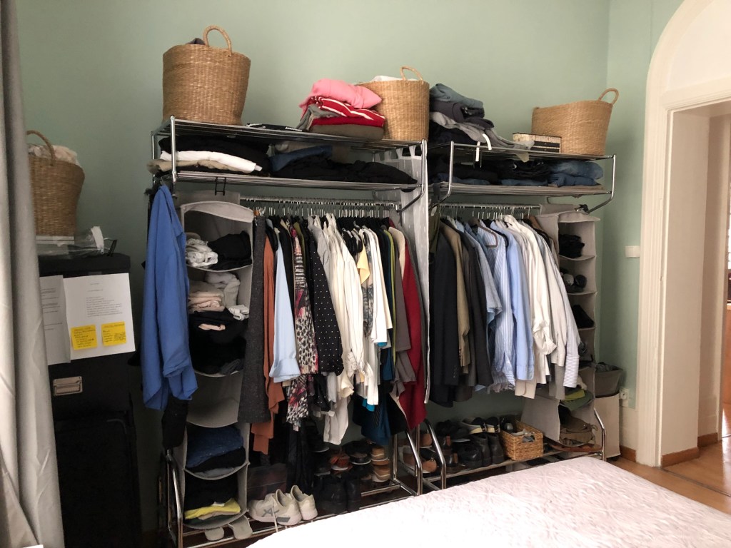 That incident spurred me to address a nagging little issue on my back burner. Our clothes hung on rolling coat racks that we bought from a now closed home decor shop, when we first moved in, since there are no closets in the apartment. Personally, I was tired of staring at our clothes, hanging in full view. I designed a simple closet consisting of two rows of shelves, a clothes hanging rod and a curtain rod to go against our bedroom wall. Little required in material or labor and it would take care of an irritation to the eyes. However, we needed Fabrice’s approval and now that we were assured that we could live here forever, I sent him the drawings. He had no issue with us installing it and then we called our fabulous handy guy, Giovanni. After Giovanni viewed the plan, he gave us the cost of materials plus labor and we were off and running! It was done in half a day and the result just thrilled my little pea heart.