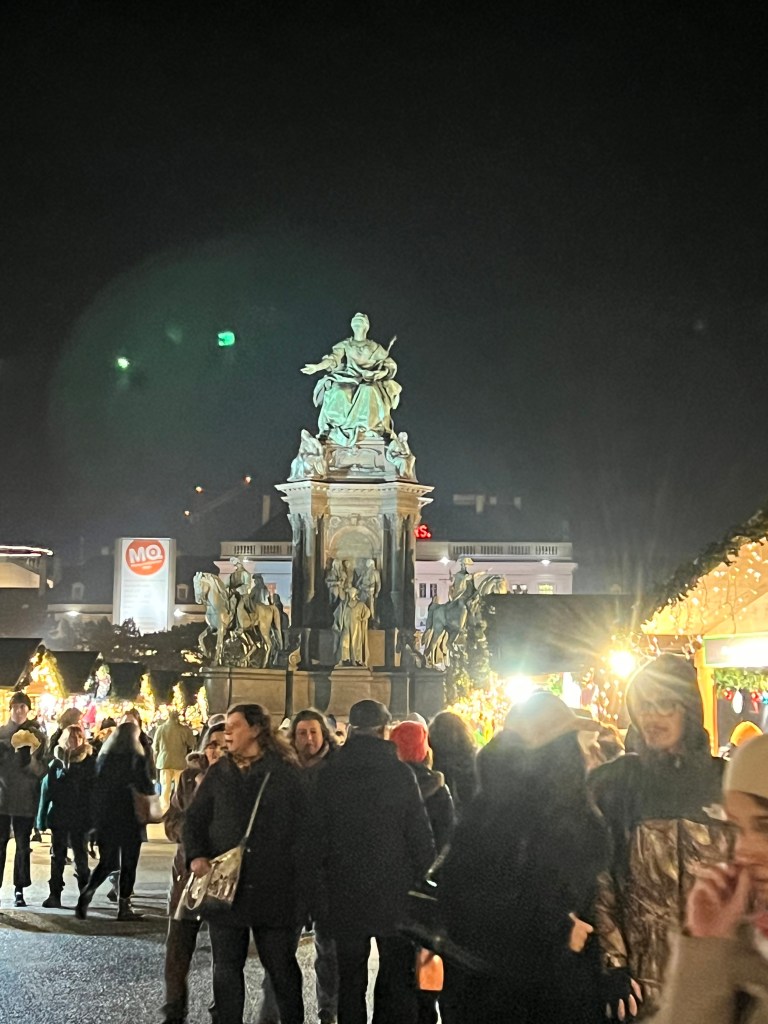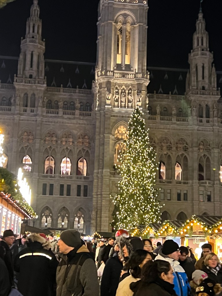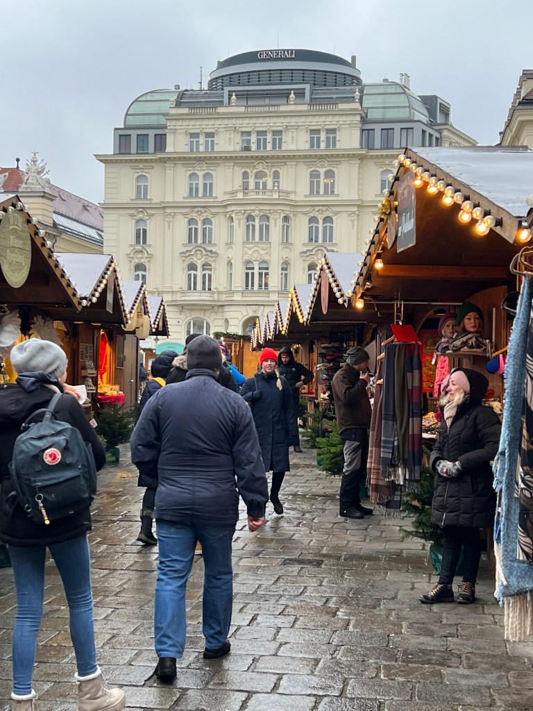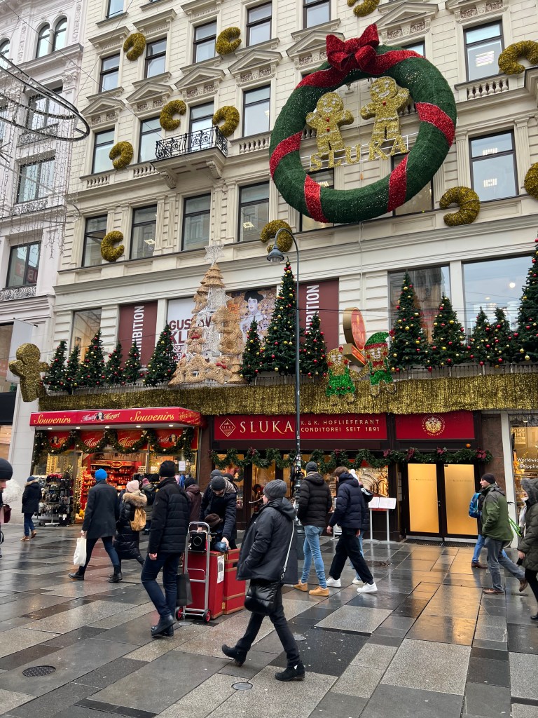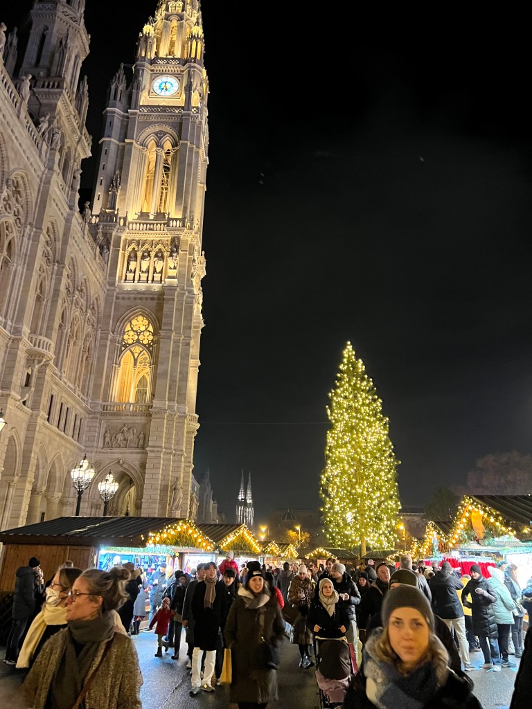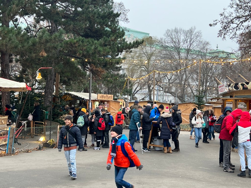 To the reason for our journey here, Vienna is known for its Christmas markets. There were at least 9 Christmas markets in the city area and we viewed most of them and did some window shopping as well. We went to the biggest market, Weiner Christkindlmarkt, at night. The lights were over the top, they had rides for the kids and an ice skating rink. On the walk back to the hotel we talked over our favorites and it really had nothing to do with size. The first art themed market has been our favorite here. The last big one was too crowded for us and the goods sold were mass produced.