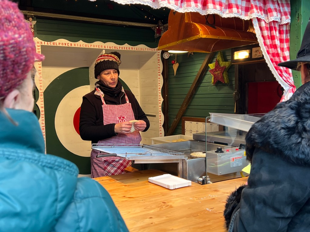 After a rest, we leisurely strolled along a main street, visited two Christmas markets in the daytime and one at night. We actually prefer them at night when they are all lit up. The first market was completely art themed and there were tons of kids in groups at the stalls, listening to how the items were crafted; wood, leather, stones used for jewelry, glass blown things. It was like they were having an outdoor class – it was great to watch. We shared a hot ginger wine drink – interesting but a bit sweet and a flat fried potato disk that was hot and garlicky but a bit salty. We have noticed that things are salted much more than we are used to. We even bought two tin ornaments for our tree before we moved on.